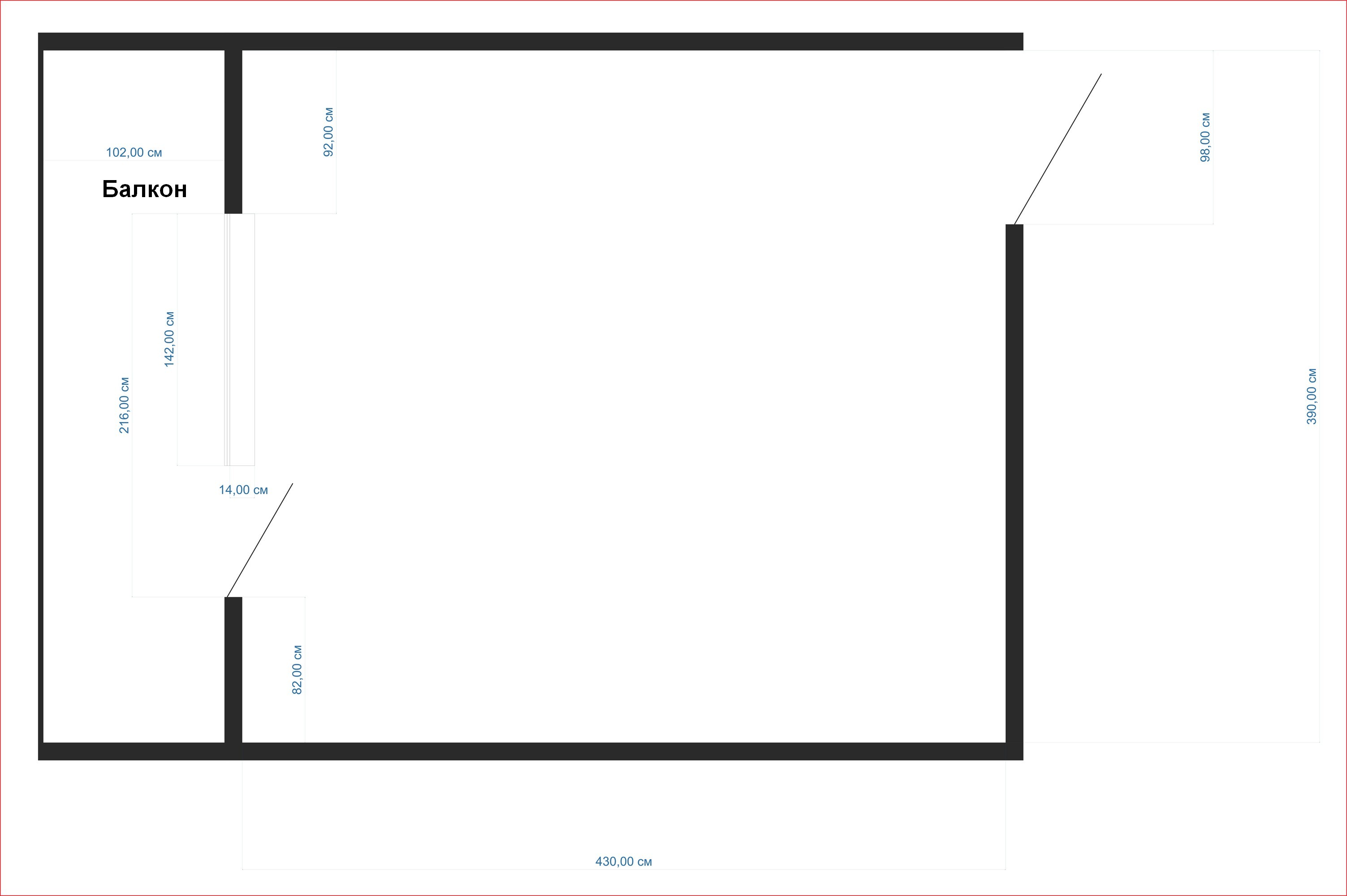Размеры комнаты: 3,9 м на 4,3 м (отсюда полезная площадь 16,77 м. кв.), высота потолка 2,54 м. Вход - одна дверь, ведущая на лестничную площадку. Есть окно с дверью на балкон. Балкон открытого типа размером 3,9 м на 1,02 м.