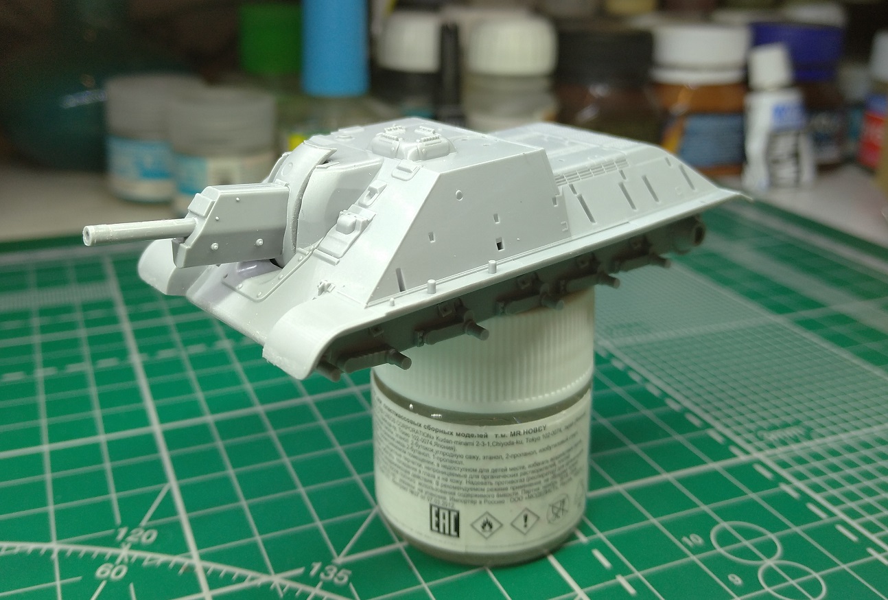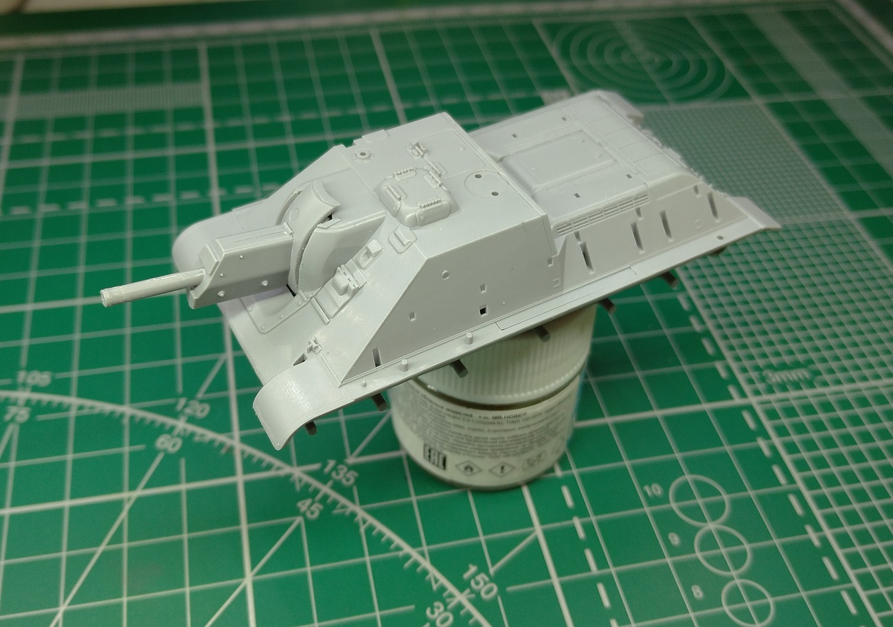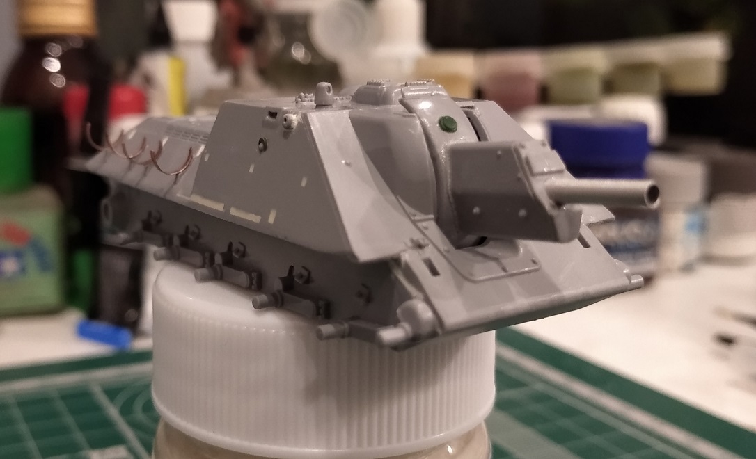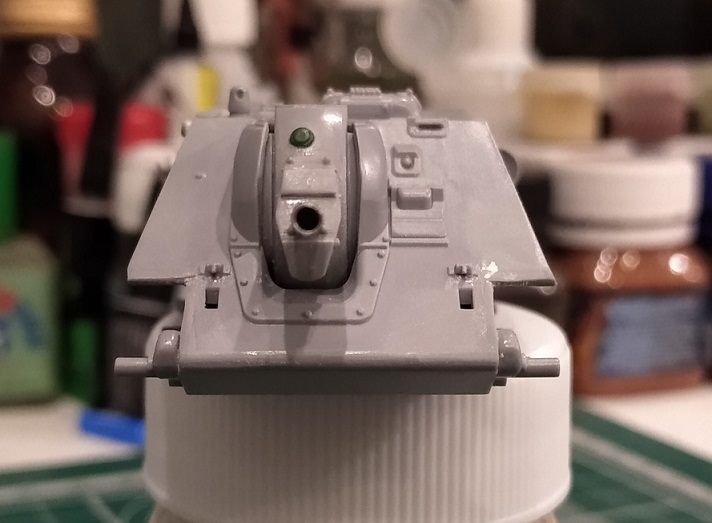 Закончил свой долгострой с тигром, теперь больше времени будет на сушку. Поработал над орудием: пролил шпаклевкой стыки бронировки, обозначил торцевую деталь бронировки, добавил недостающие болты, заменил ствол, имитировал тянутым литником сварной шов между маской и бронировкой, выкроил из каких-то остатков пластика крышку механизма фиксации орудия (если я правильно понимаю назначение этой детали на маске). На верхней части бронировки орудийной амбразуры имитировал элементы крепления. Зашпатлевал стык кормовой детали рубки.