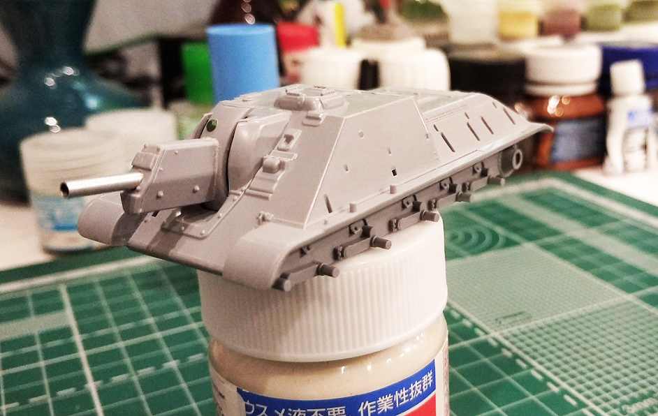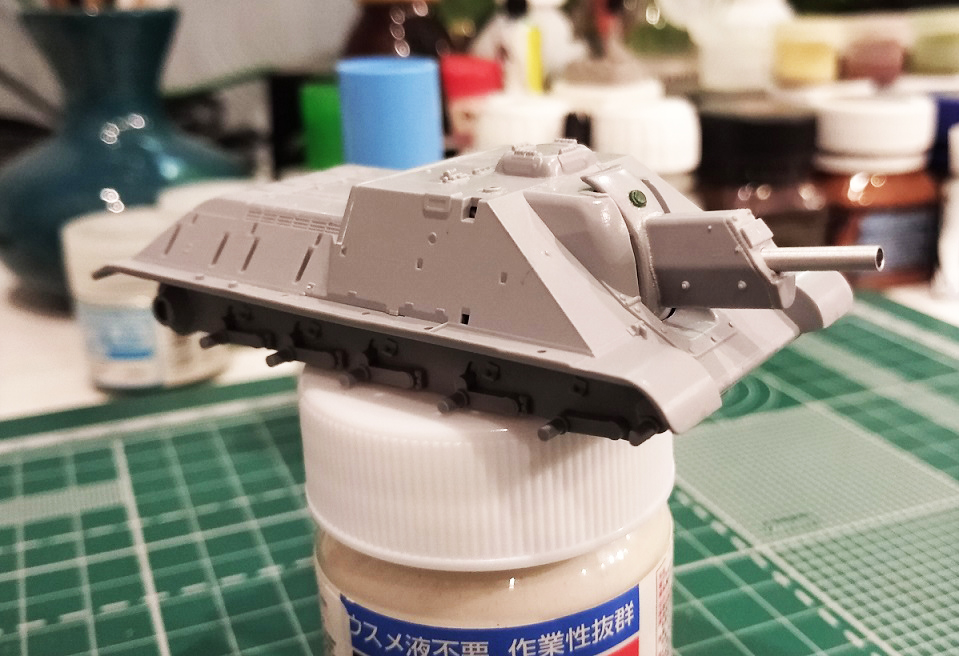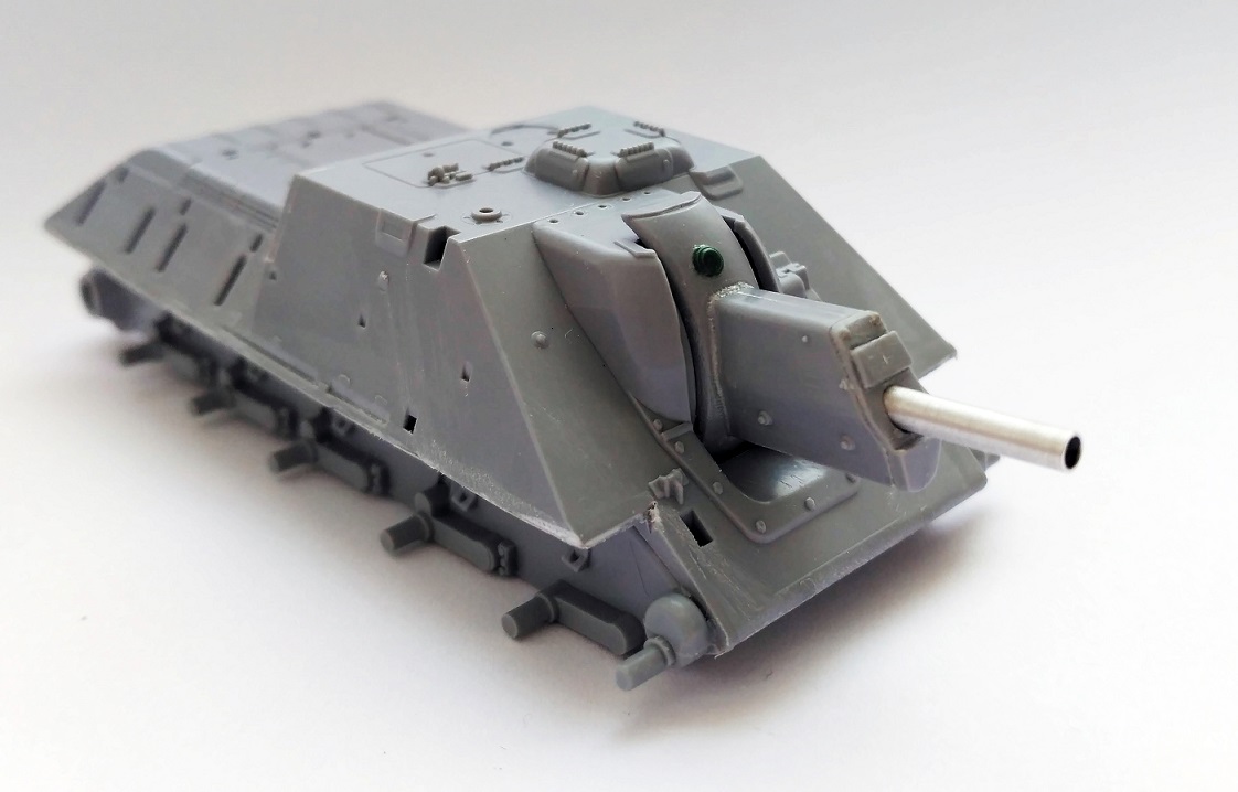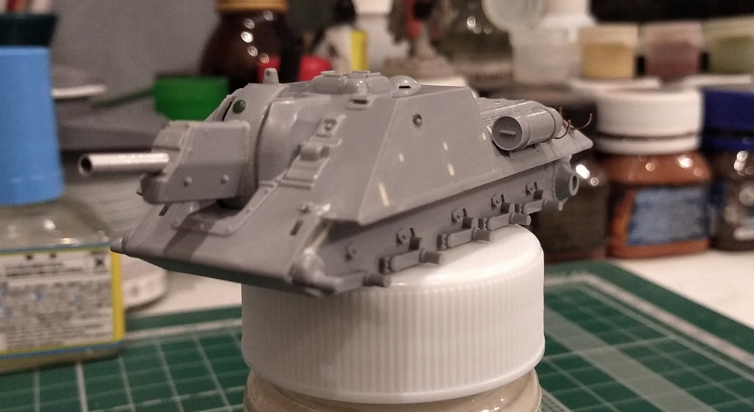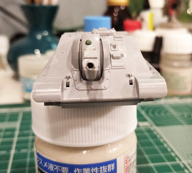 Закончил свой долгострой с тигром, теперь больше времени будет на сушку. Поработал над орудием: пролил шпаклевкой стыки бронировки, обозначил торцевую деталь бронировки, добавил недостающие болты, заменил ствол, имитировал тянутым литником сварной шов между маской и бронировкой, выкроил из каких-то остатков пластика крышку механизма фиксации орудия (если я правильно понимаю назначение этой детали на маске). На верхней части бронировки орудийной амбразуры имитировал элементы крепления. Зашпатлевал стык кормовой детали рубки.