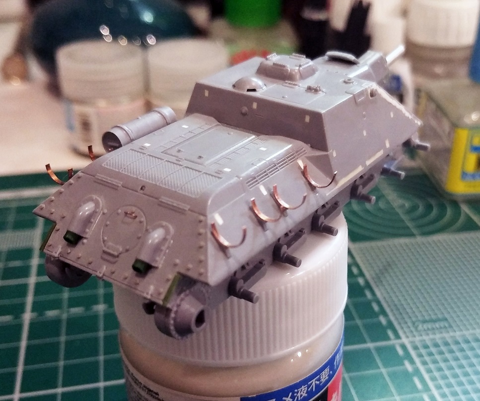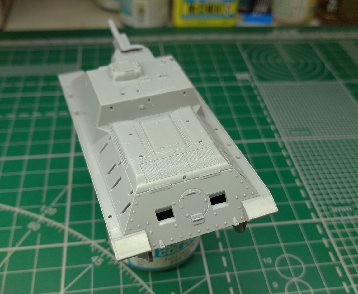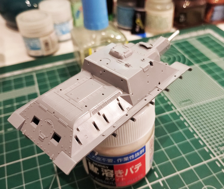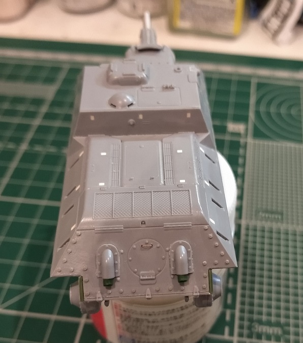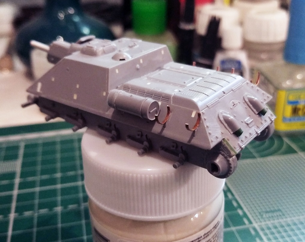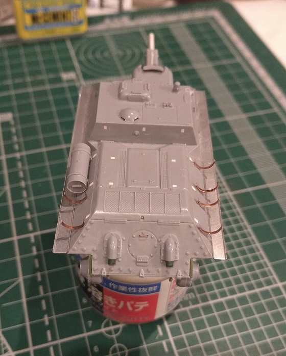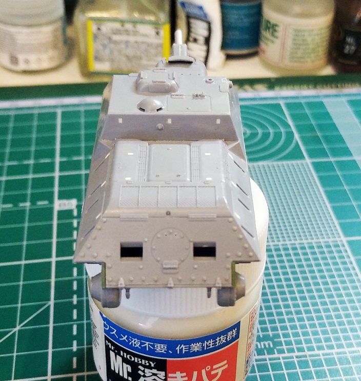 Перекроил корму. Ввиду того что нижний ряд болтов нужно было приподнять, переболтил мастерклабом всю ВКД. Перенес петли и добавил недостающую центральную. Прошпаклевал стыки, посадочные места быстросборных элементов, ненужные углубления в правом борту рубки. Удалил имитацию ручки с люка трансмиссии, восстановил болт и заготовил отверстия под проволочную ручку.