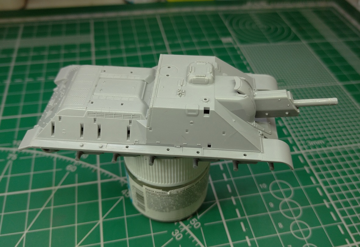 Как уже говорил ранее: кит без откровений. Глупо, наверное, ожидать от быстросбора детализации полноценного набора хотя бы и в 72-м масштабе. Но все же: вот уже третий самоход у Звезды на базе Т-34, а корма рубки боевого отделения по-прежнему устанавливается по принципу "прислонила я его у забора". У той же яги от той же Звезды этот вопрос решен много лучше, а здесь очередные грабли. На фото эта деталь уже проклеена, по этому щель не такая грандиозная и будет зашпаклевана.