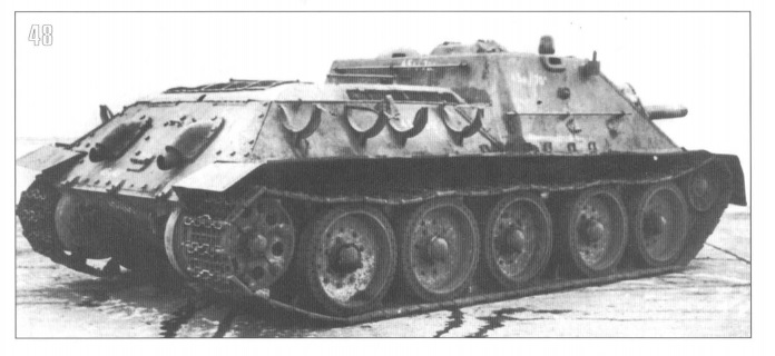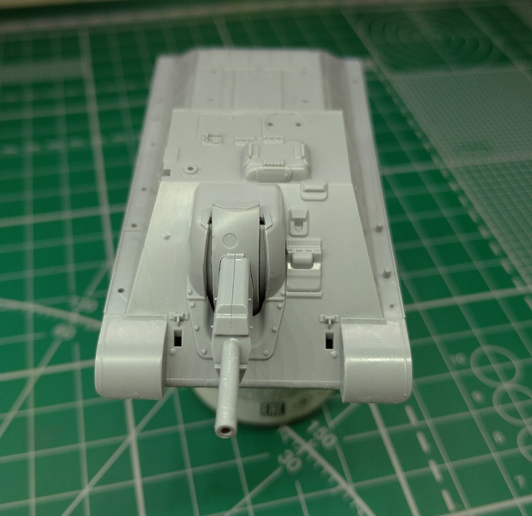 Сам набор без откровений, выглядит неплохо, как и предшествовавший ему кит СУ-85. Колесная часть идентична СУ-85: четыре катка с перфорацией и протектором на грузошинах, шесть только с перфорацией. Обе бронировки выхлопа с довольно крупными утяжинами. Сильно удивил ствол: из двух половин с дульным срезом третьей деталью... В общем, тут ИМХО только менять на металл.