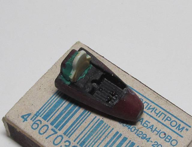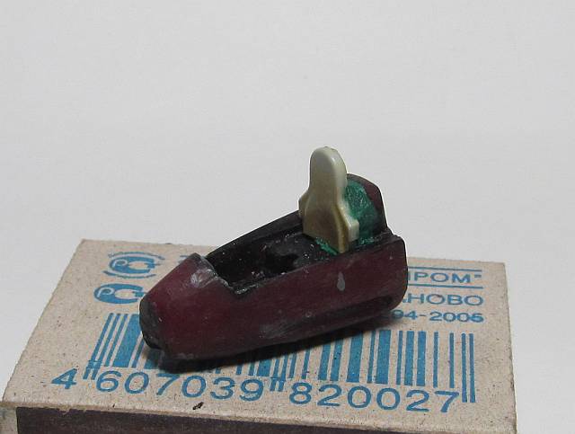Фото с начальных этапов сборки у меня отсутствуют (тогда у меня наверно и фотика то ещё не было), но одну любопытную деталь показать могу. Намучавшись, в своё время, с загрузкой носовой части, я придумал изготовить специальную деталь, совмещающую в себе какую ни есть кабину пилота, пусть и примитивную, но всё-же нишу шасси и, собственно, груз. Ванну кабины позаимствовал от фроговского же фантома, облепил её снизу пластилином, подогнал под внутреннюю поверхность фюзеляжа, выбрал нишу шасси. Полученный макет заформовал в автогерметик и отлил деталь из эпоксидной смолы с наполнением из свинцовой дроби. Грузик получился компактный и достаточно увесистый, так что самолёт стоит на носовой стойке абсолютно надёжно.