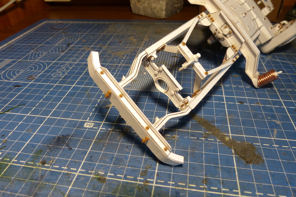 Бампер ,передняя рама с креплением передних баллонов газогенератора.Установил все болты и гайки,тяги.Эта часть трактора готова полностью