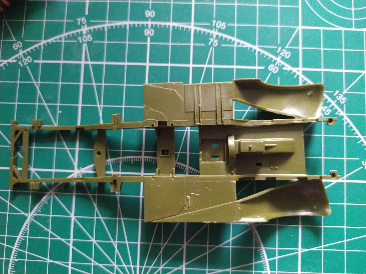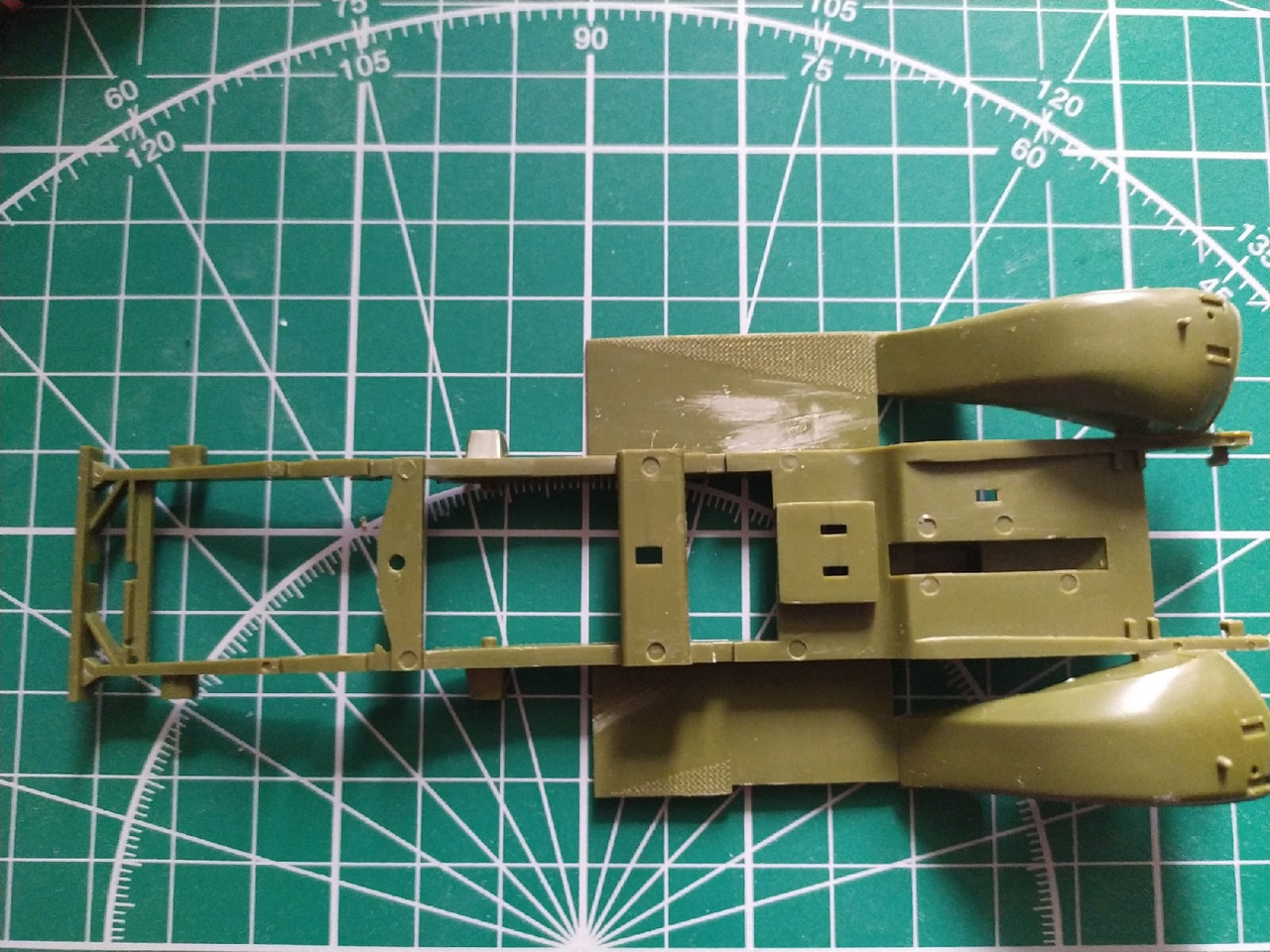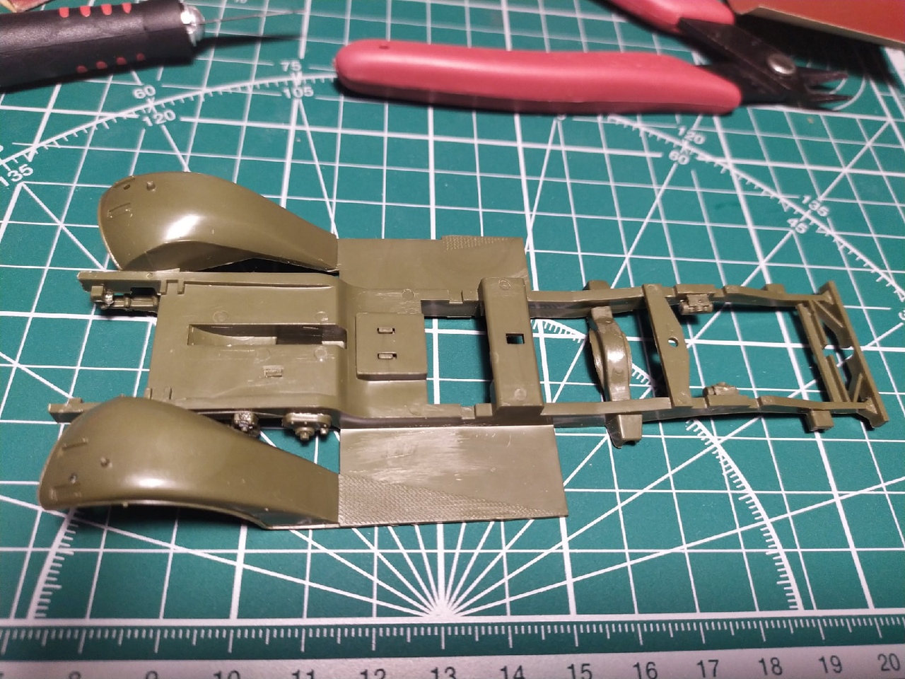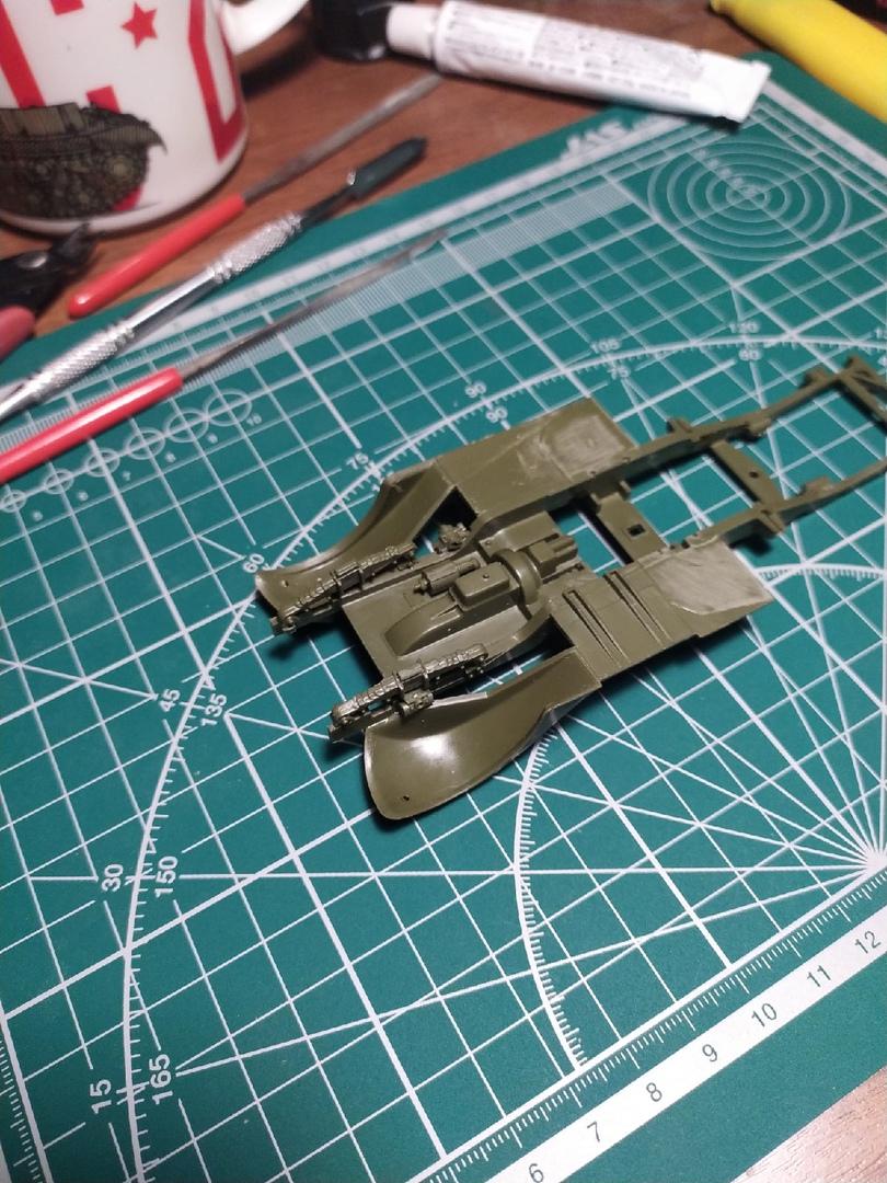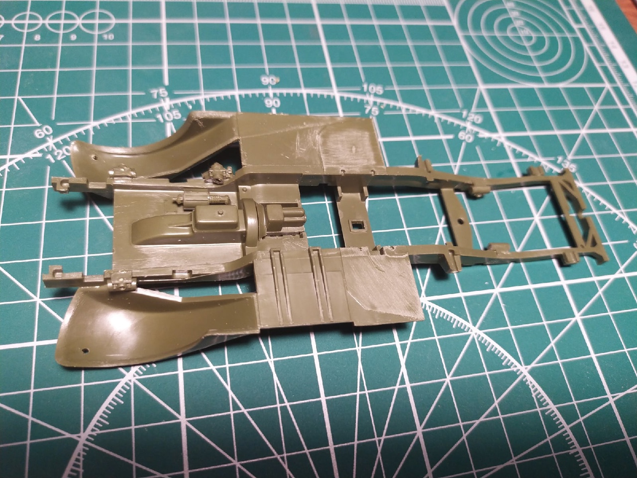 Сборка рамы установлены рессоры, элементы двигателя, глушитель. Попутно следы от толкателей обработаны шпаклевкой и удалены наросты пластика на подножках броневика.
