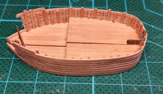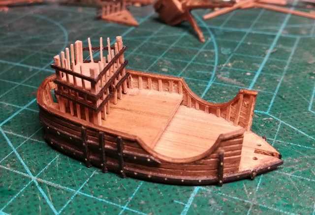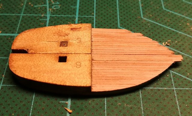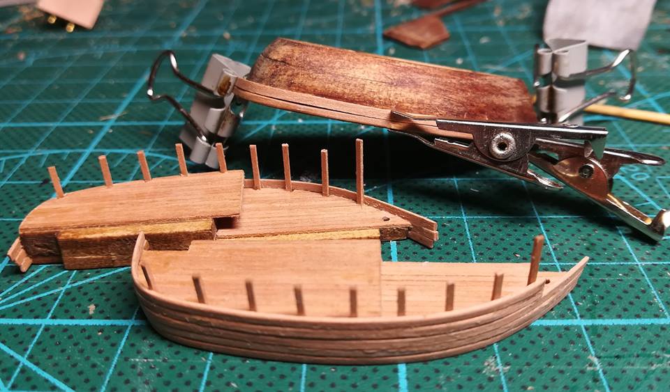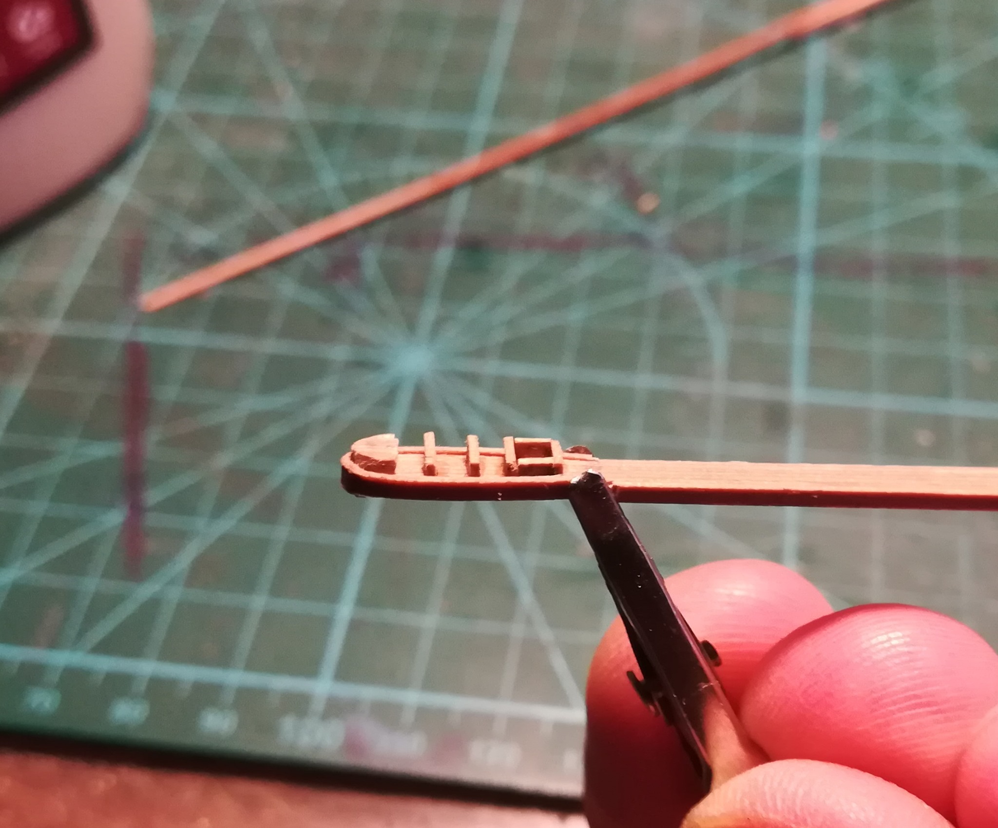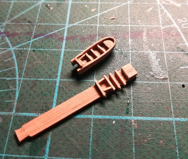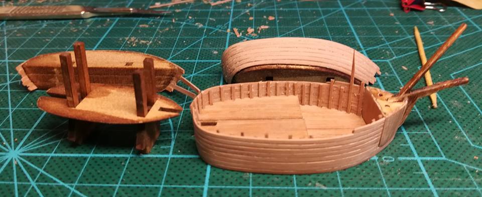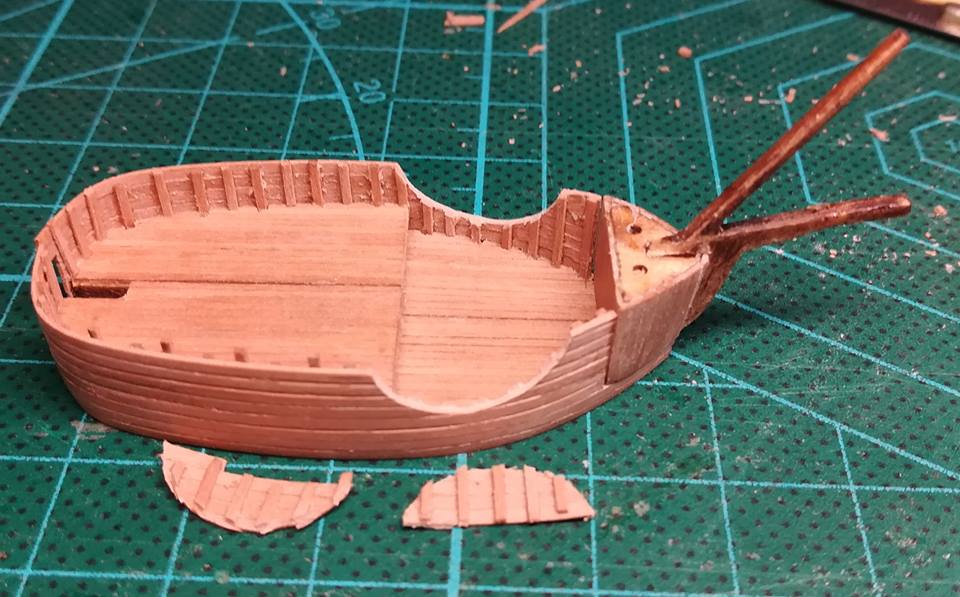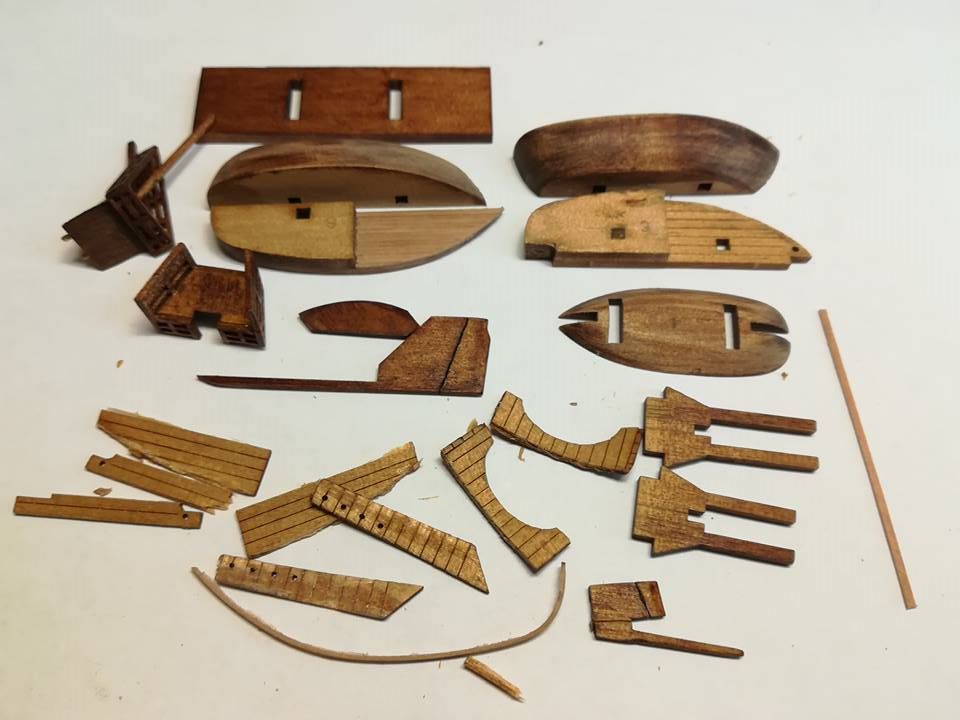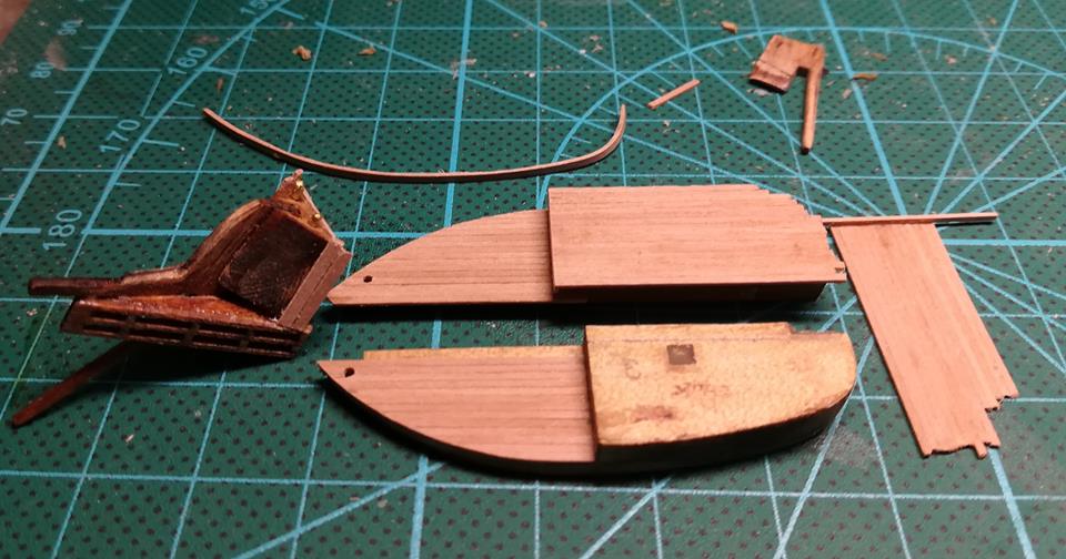 В июне 2018 года он попался мне на глаза и я решил попробовать что-нибудь из него сделать. Первым делом я разобрал его на части, отодрал приклеенные фальшборта, немного пошкурил детали корпуса и получил вот такой набор частей