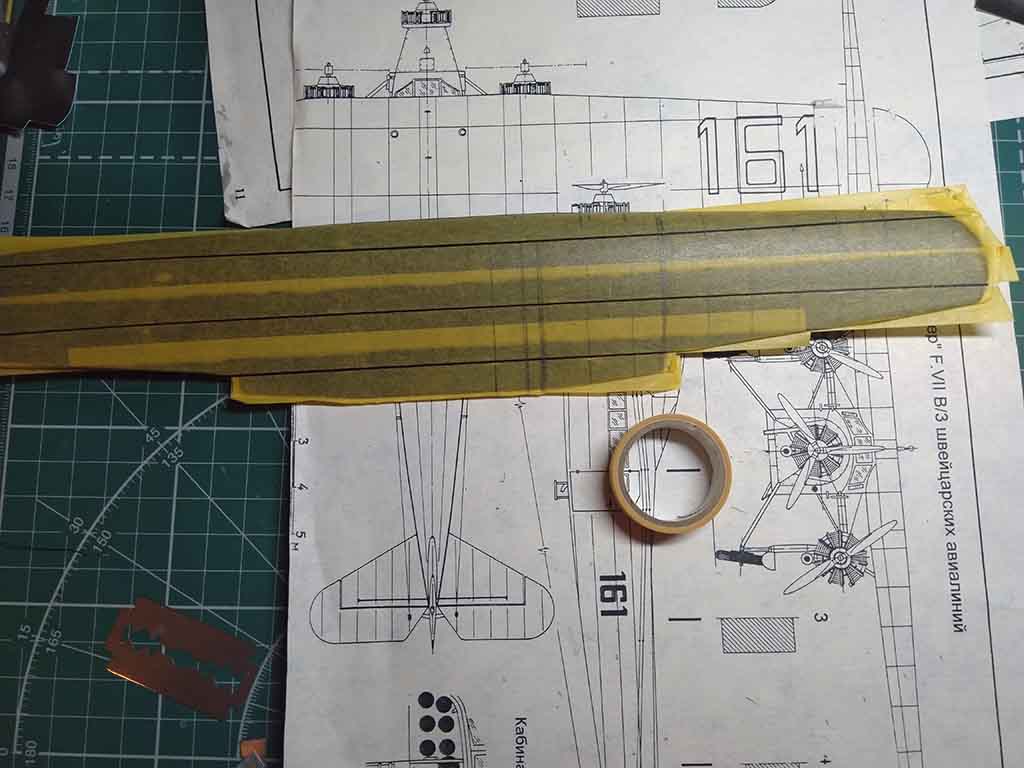 Ленты, закрывающие стыки фанерных панелей, решил имитировать накрашиванием. Вооружился чертежиком и тамийским скотчем.