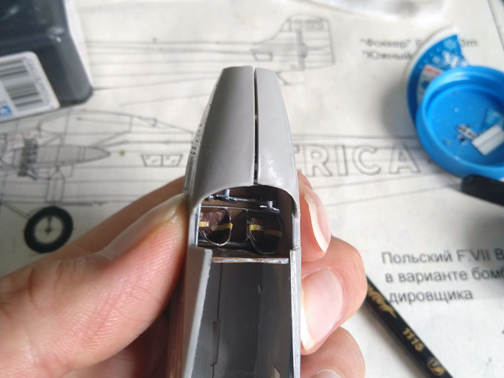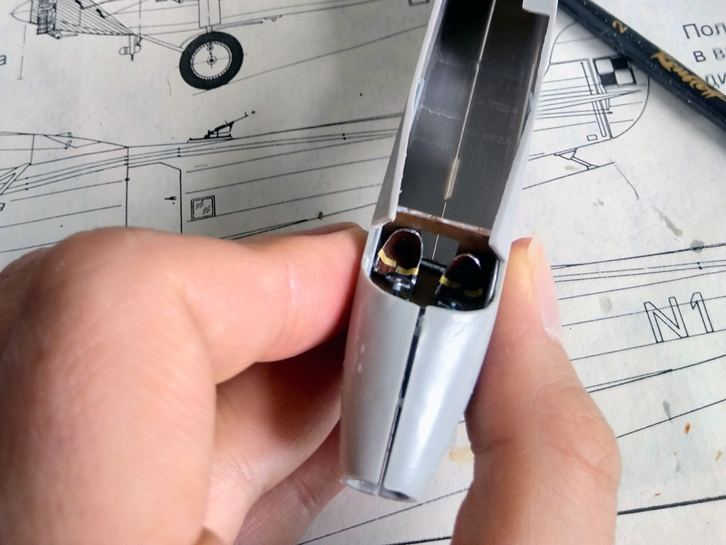 Сделал силовой набор, полик. Смонтировал основные подсборки салона. По окраске небольшой комментарий. В те времена, как я узнал, изучая другие аэропланы близкой эпохи, полотно перед финишной покраской было принято сначала красить серебрянкой. В результате изнутри это выглядело как очень светло-серый цвет слегка гулявшей интенсивности. Это можно хорошо рассмотреть на примере "Стирманов", которые снаружи тоже синие. У них полотно изнутри светло-серого с очень легкой серебрянцой оттенка, который я и намешал на глазок. В открытой кабине я бы еще туда капнул самую малость серебра, но тут это излишне. Стыки закапал тамийской смывкой, трубы потянул моделмастеровским "силвером". В закрытом объеме надо поконтрастней, а то таракан заблудится)