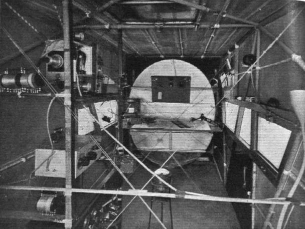 Немного матчасти. Здесь мы видим дополнительный бак, прикрепленный к полу на треноге компас(?) и стойку с радиооборудованием. Как видим, бак закрывает проем в кабину пилотов. Как они туда попадали - для меня теперь загадка, но вот оно фото, не попрёшь. Кроме того, сняты внутренние панели салона, которые на пассажирских версиях закрывали силовой набор, добавлены проволочные расчалки.