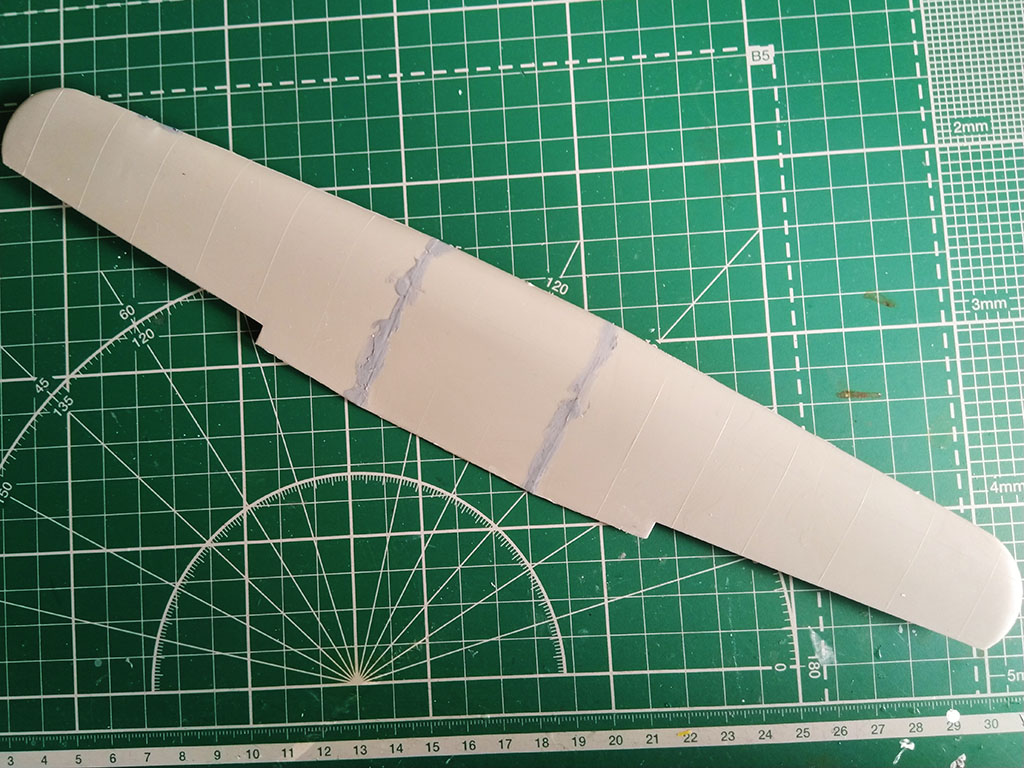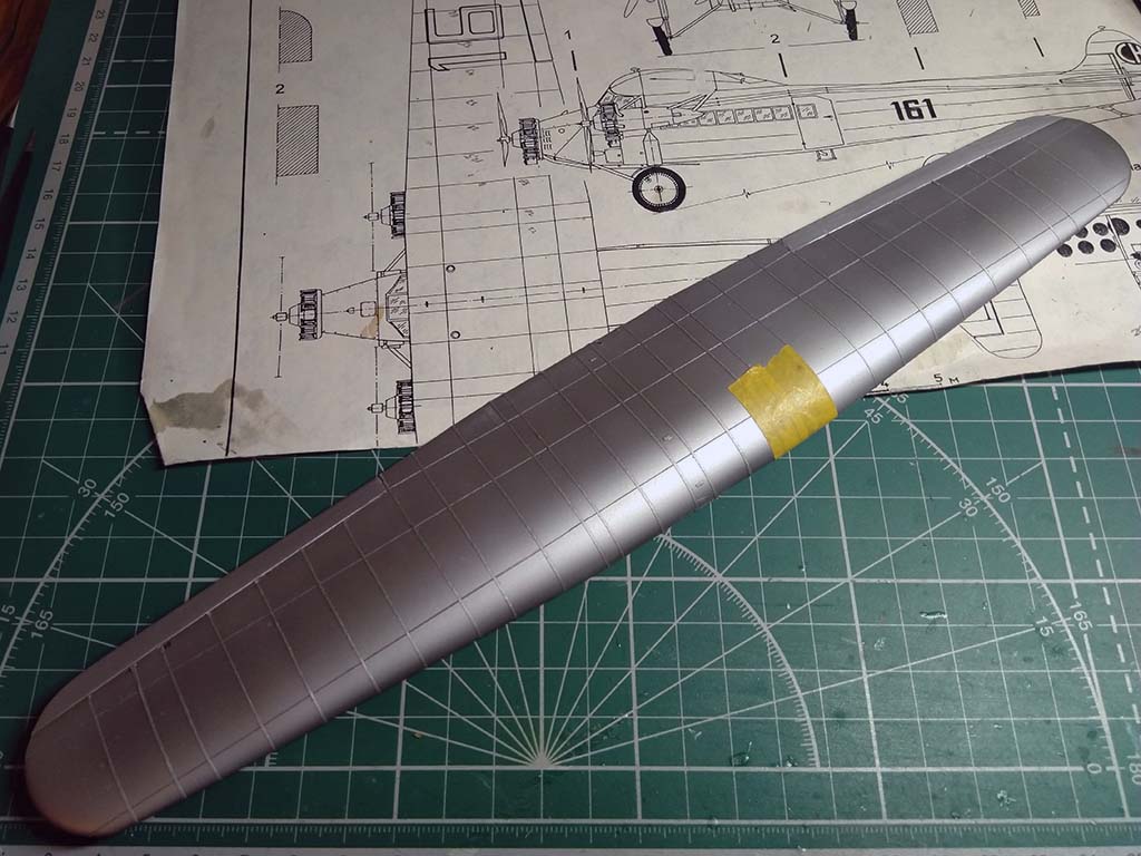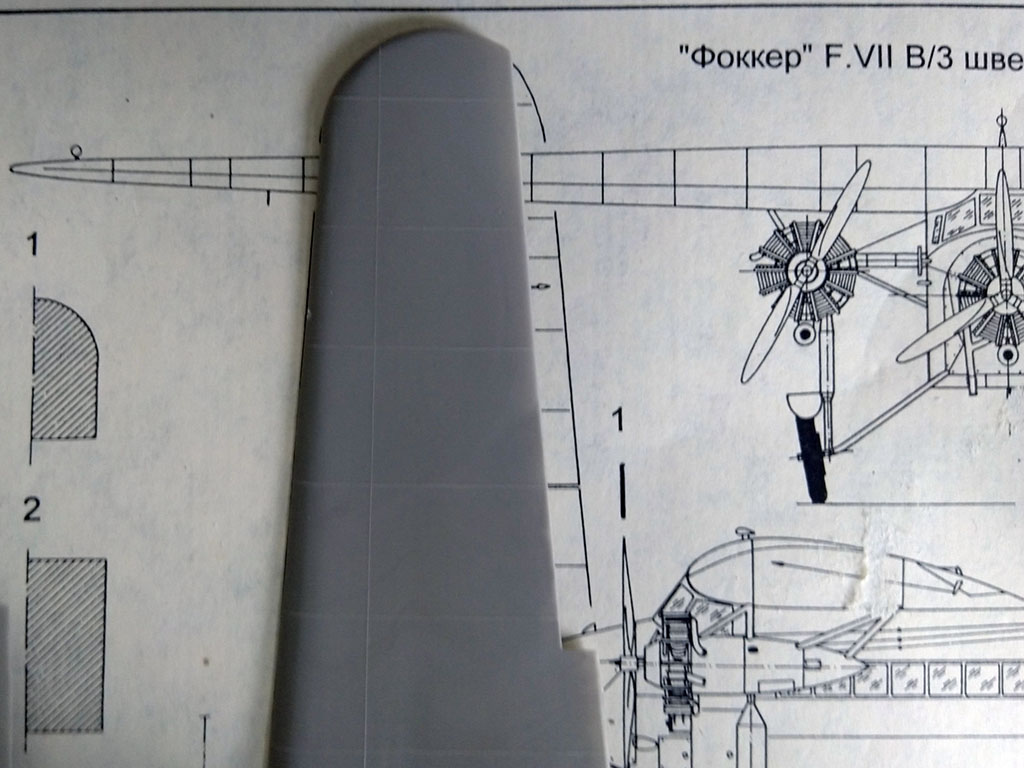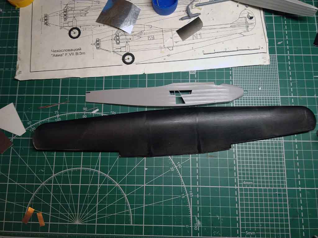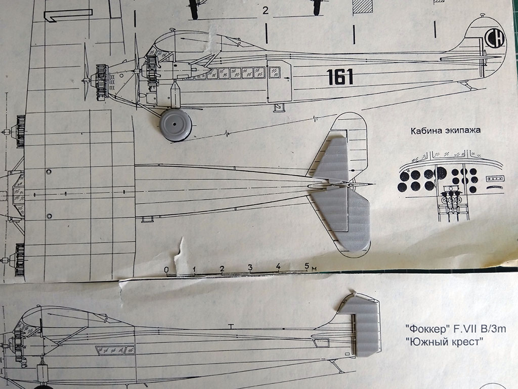 В принципе, все неплохо, но есть пару проблем и вопросов, как же без них? Профиль фюзеляжа в чертеж лег хорошо, но вот длина больше на несколько миллиметров, из-за чего киль сдвинут назад. Кроме того, его передняя кромка немного неверной формы. К счастью, правится это без фигурной хирургии: срезаем киль, отрезаем лишние миллиметры сзади от фюзеляжа, приклеиваем киль, правим кромку. Крыло фактически правок не потребует, но есть вопрос с длиной элеронов. Чертеж крыла, правда, относится к "швейцарцу" и я допускаю, что у "Южного креста" могли быть другие элероны, "семерка" была достаточно вариативна. Попробую поискать фото.