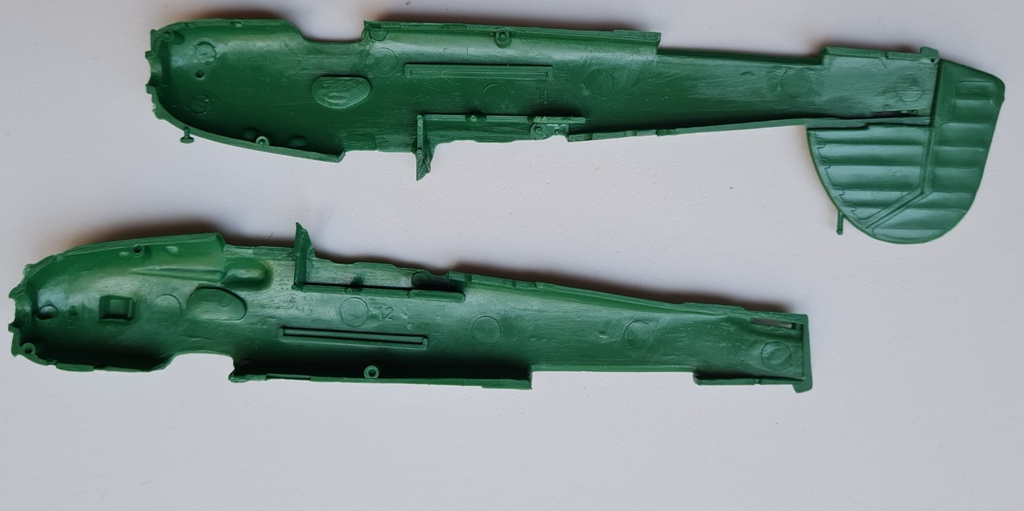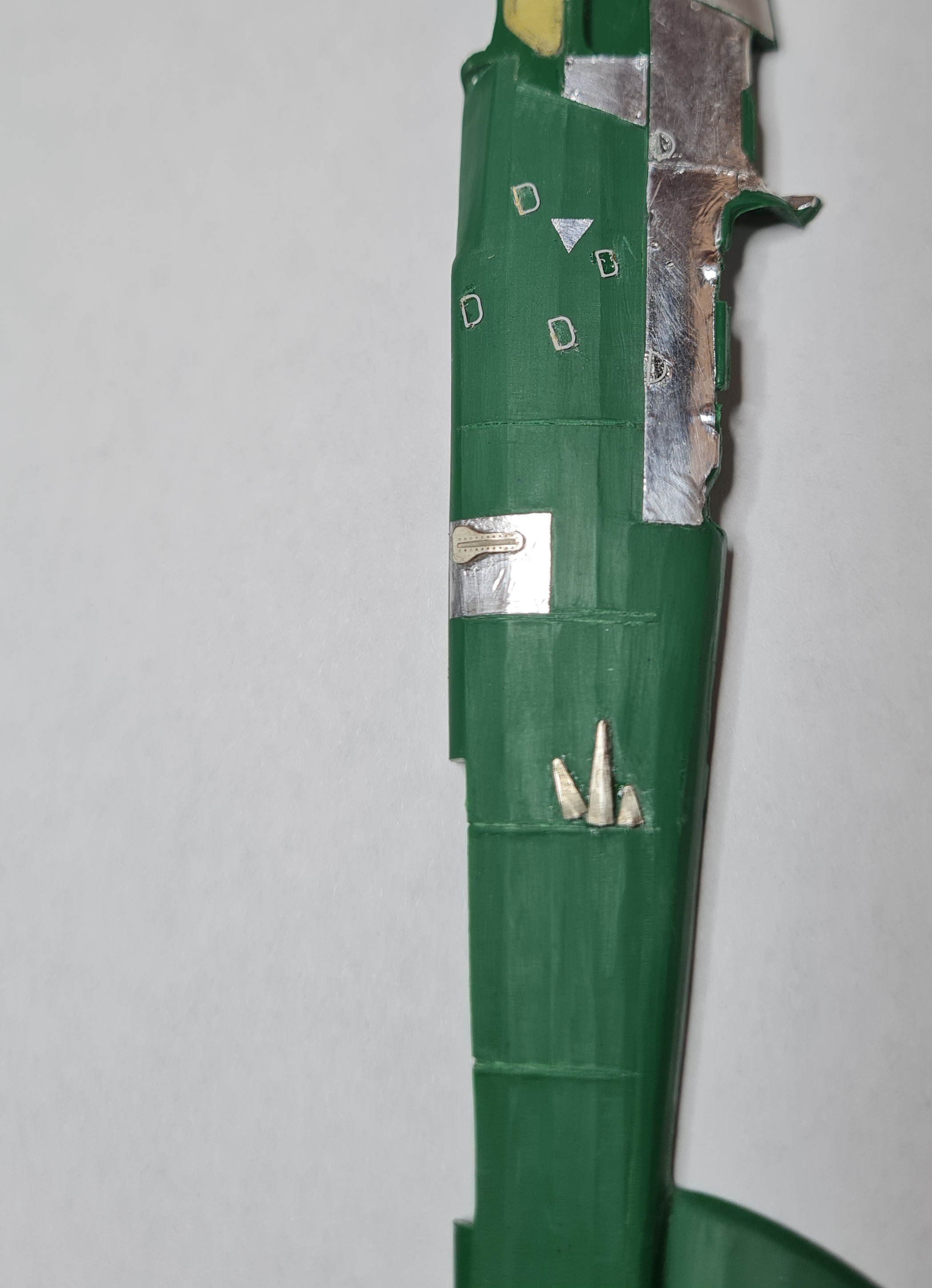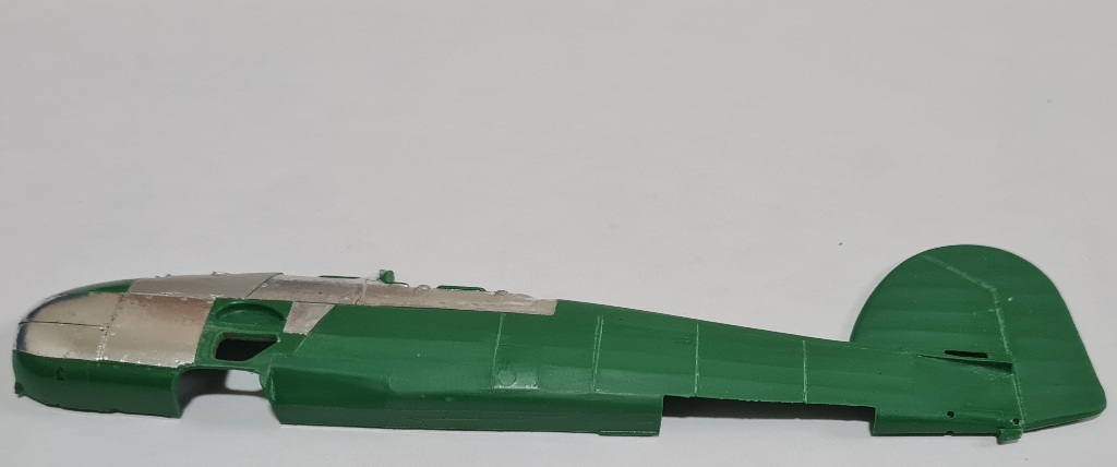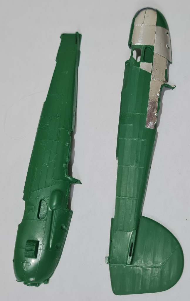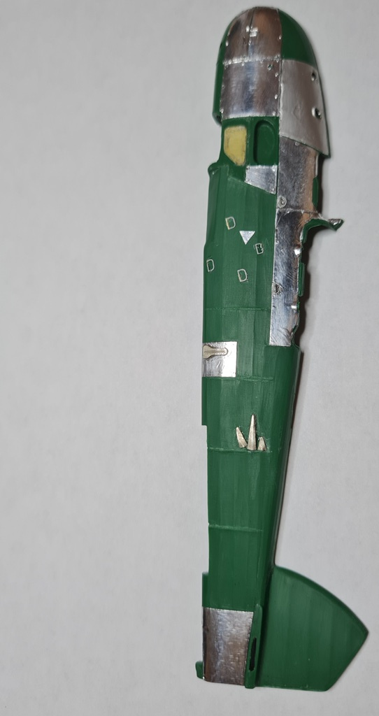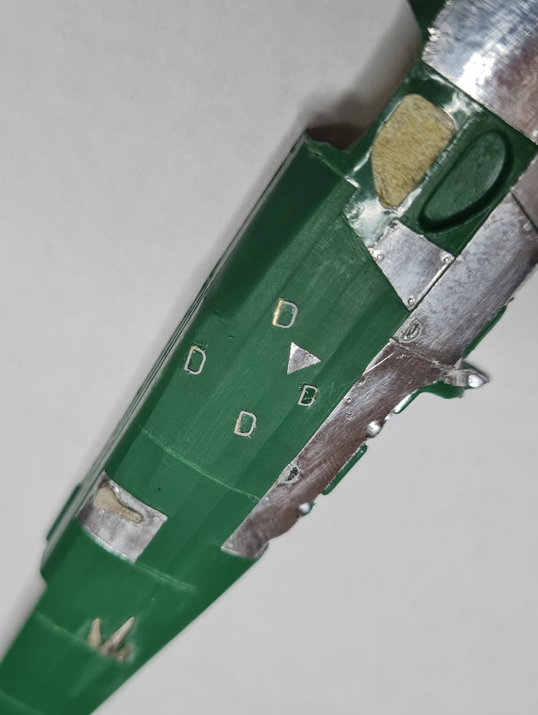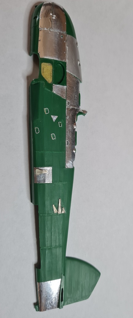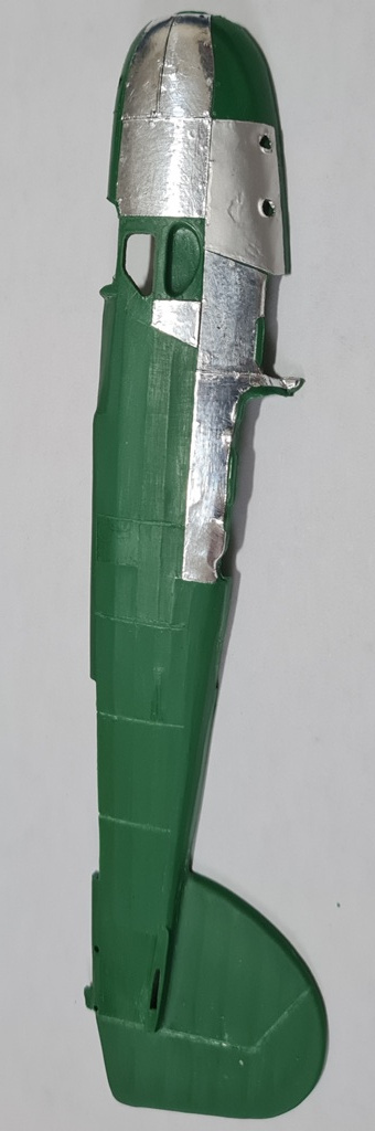 Начал с левой половинки фюзеляжа- имитация провиса полотна и обклеивание панелей фольгой.