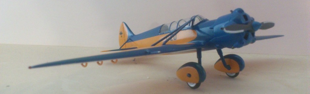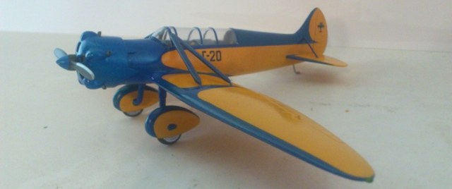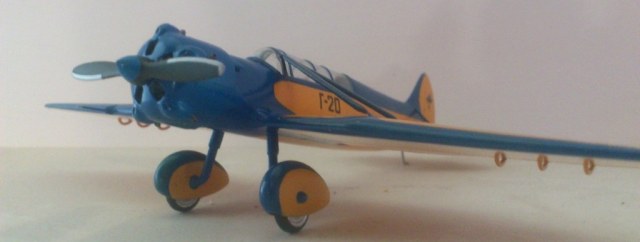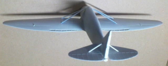 Поставил модель на "ножки", костыль из медиглы с пяткой из пластика. Установил узлы крепления элеронов. Имитировал полотно на крыле и элеронах. Насчёт центроплана призадумался делать или нет. Дело в том что на фото полотна не видно (фото поганенькие конечно), в описании упоминается только крыло, на схеме же задняя часть центроплана обтянутое полотном в плотную к фюзеляжу. Возник вопрос как первый пилот попадал в кабину (второй понятно, у самолёта оказывается для него была подножка которой нет на схеме (на фото закрыта крышкой))? Не топтался же он по полотну. Решил делать как на схеме, но оставить "фанеру" от фюзеляжа до ближайшей нервюры.