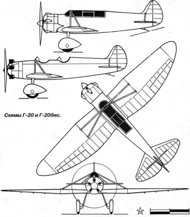 Решил заняться чем попроще, отдохнуть... Выбрал для стройки самолёт Грибовского Г-20. Как что уже зделал, но сначала хочу показать вам свои сравнения фотоматериалов со схемой Маслова. Фотки довольно посредственного качества да и схема простенькая, но кое что удалось разглядеть.