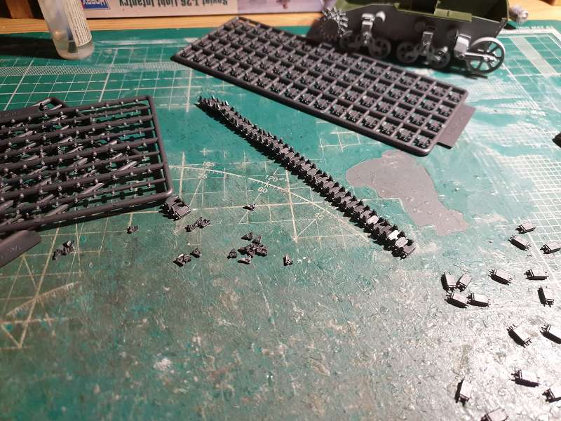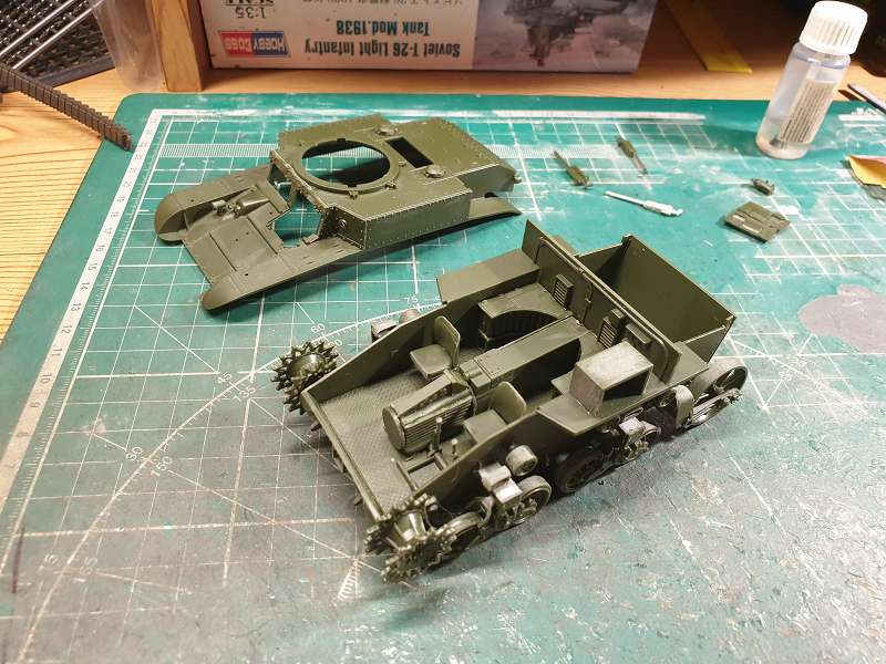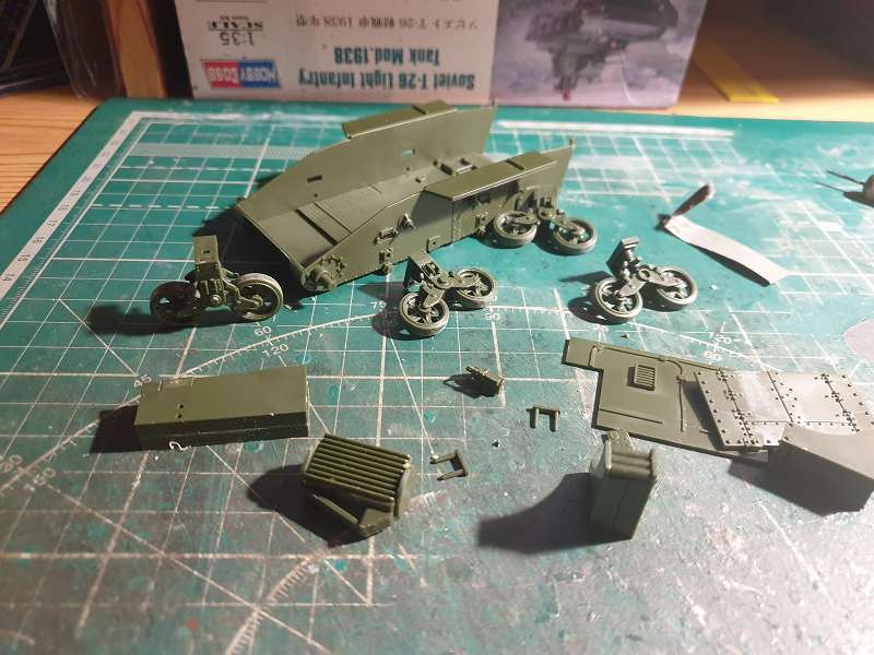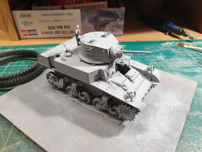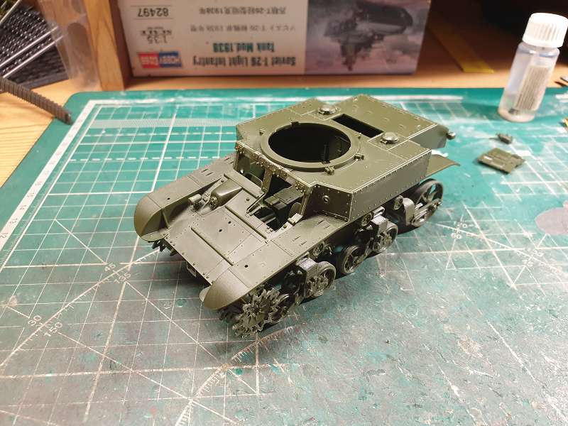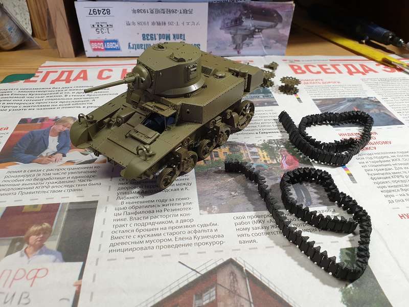 Загрунтовал. Думаю насчет гусянки. В коробке есть наборная, но возиться с ней уже неохота. Резиновую что ли поставить?