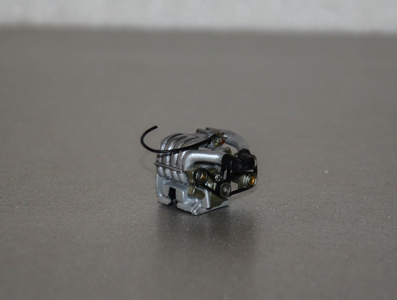 Первым делом сделал двигатель, и немного его доработал, а именно добавил дроссельную заслонку и тросик. После все это дело покрасил, сам блок в Tamiya XF-16 Flat Aluminum, впускные патрубки Silver М-01 от Pacific88, а навесное Сталью 07 от Звезды (этой краски совсем немного осталось, все никак не закончится, а выкинуть жалко, тем более навесное не очень видно будет), черные части задул в Tamiya XF-01 Flat Black, золотые "моменты", это тоже Звезда N03 "Золото" (тоже все никак не закончится). В конце сделал смывку акварелью, результатом доволен