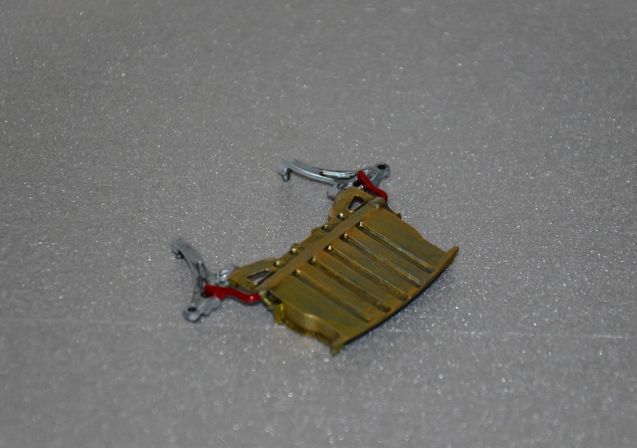 Защиту красил в то же "Золото" N03 от Звезды, подождал пока высохнет не до конца и кистью убрал лишнее, плюс легкий фильтр черной смывкой. Рычаги подвески - Tamiya XF-16 Flat Aluminum, а стабилизатор поперечной устойчивости, кистью покрасил глянцем Tamiya X-07 Red. В конце сделал смывку акварелью.