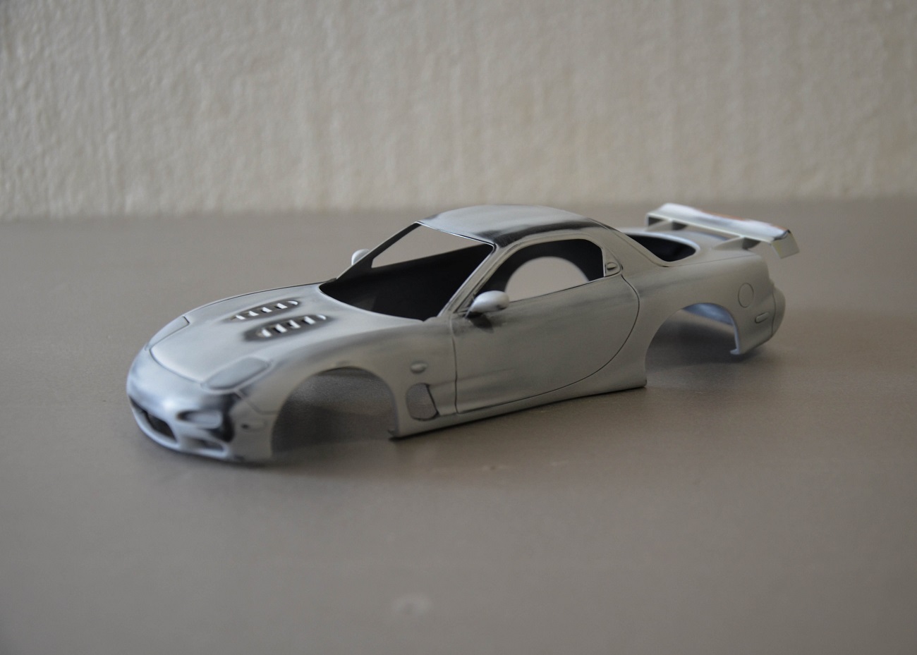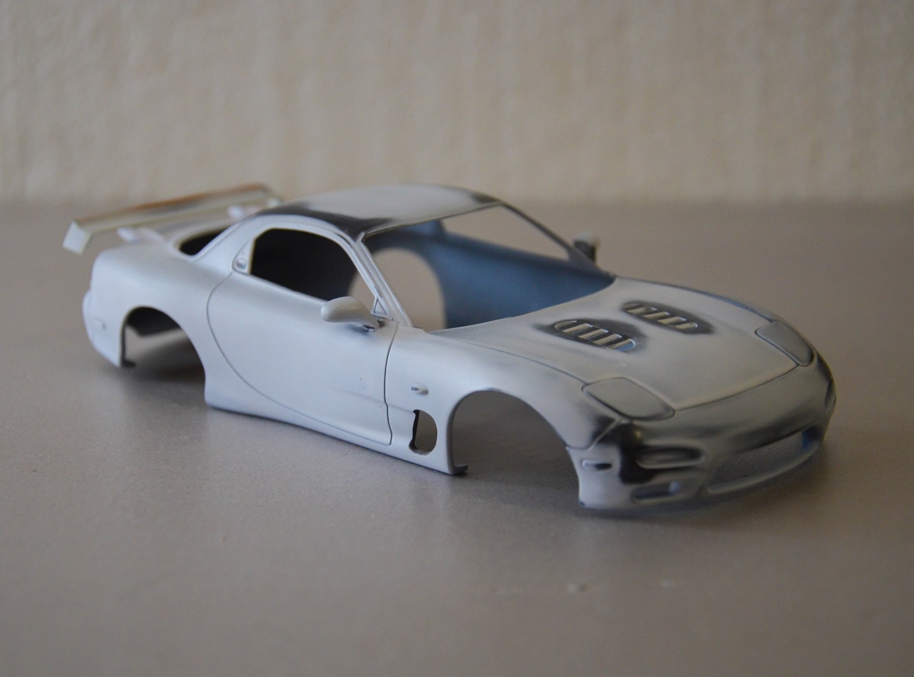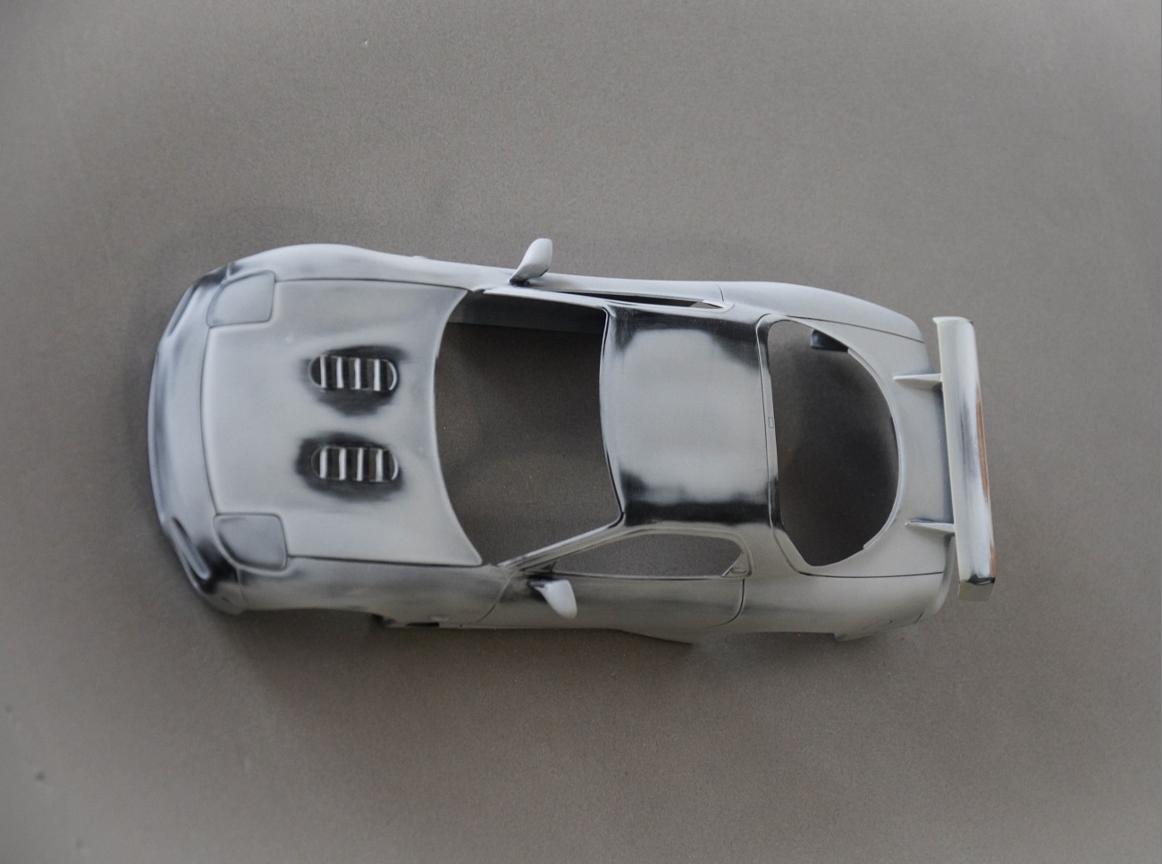 После того как я привел в порядок кузов в порядок, вырезал по бокам воздухоотводы, и отполировал его 3000 наждачкой, ополоснул в теплой воде, высушил, приклеил заднее антикрыло и задул все это дело в белую грунтовку от Kudo для пластика, и оставил просушиться. После кристаллизации грунта, провел визуальный осмотр кузова и выявил очень много косяков, которые вышлефовал с помощью наждачками с зерном 600 и 800