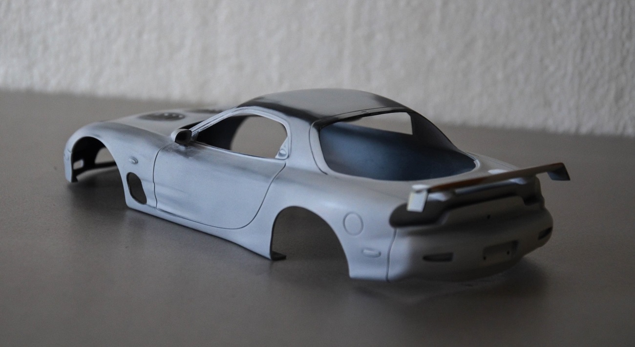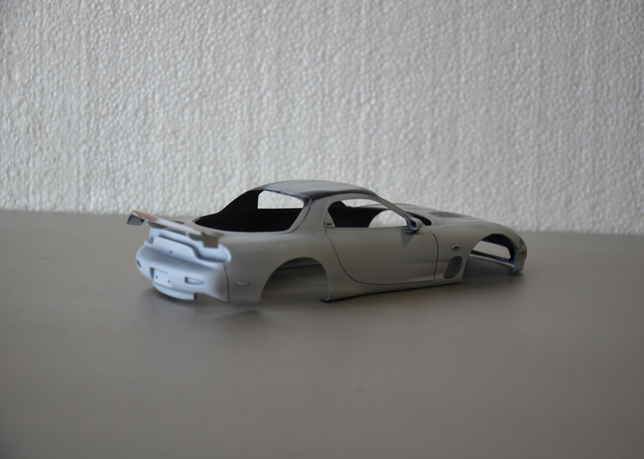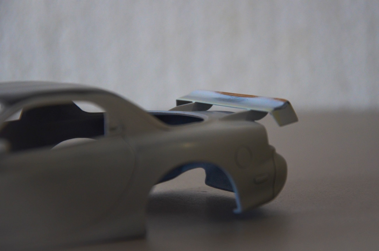 Само антикрыло, очень смущает то что модельный пластик вошел в хим реакцию с грунтовкой, местами появились желтые пятна (их можно увидеть на кромке антикрыла и жабр на капоте), хз вылезут ли они после покраски или нет... я очень надеюсь, что нет и не придется кузов купать в Кроте, и перекрашивать
