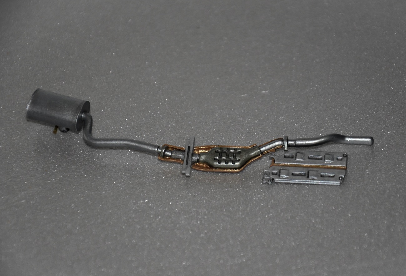 Базу задул в Tamiya X-11 Chrome Silver, очень классный цвет. Пламегаситель - мой любимый N07 Сталь от Звезды, защита МКПП - Tamiya XF-16 Flat Aluminum, термоизоляцию выхлопной системы покрасил в "Золото" N03 от Звезды