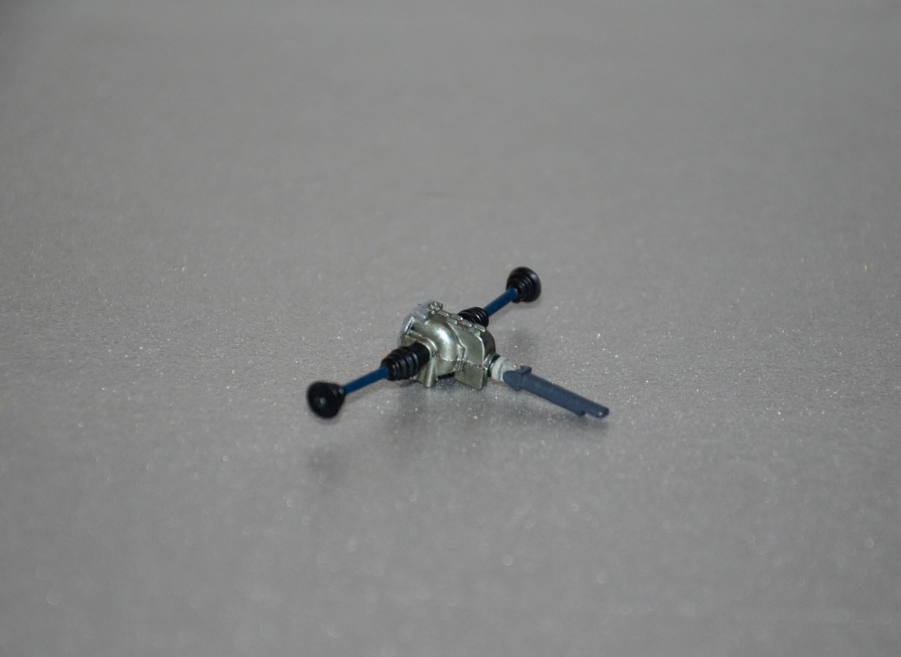 Следующая деталь - это редуктор заднего моста с осями привода и частью карданного вала. Редуктор задувался в Tamiya XF-16 Flat Aluminum, сверху нанес тонкий слой звездовского N07 Сталь (да-да, остался литьевой шов, поздно заметил, а убирать и перекрашивать было лень, тем более его не будет видно после установки), пыльники приводов - Tamiya XF-01 Flat Black, сами оси приводов - Tamiya X-04 Blue. Карданный вал, решил задуть в Tamiya XF-24 Dark Grey (в черный не захотел, скучным показался), хвостовик к карданному валу от редуктора - Tamiya XF-19 Flat Sky Grey.