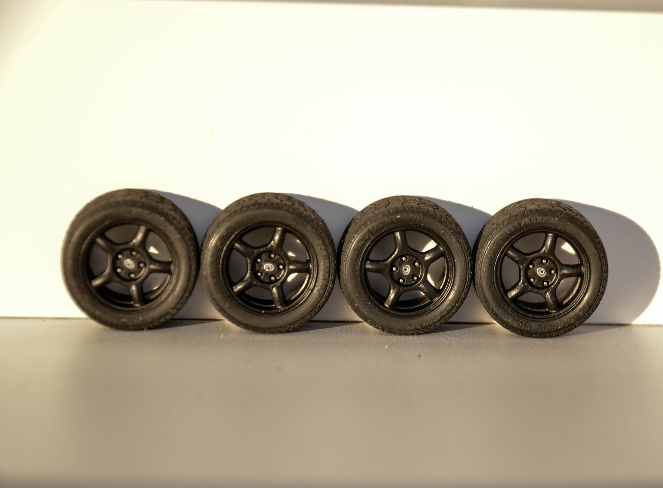 Следующим шагом было купание в мыльной горячей воде, с последующей промывкой под струей проточной. После высыхания, загрунтовал их с помощью Surface Primer от Tamiya. Как только грунт кристаллизовался, покрыл диски Tamiya XF-01 Flat Black, приваривал деки с помощью Tamiya Mark Fit, просушил и в конце нанес Tamya XF-86 Flat Clear. На шинах удалил литьевой шов, та еще веселуха была