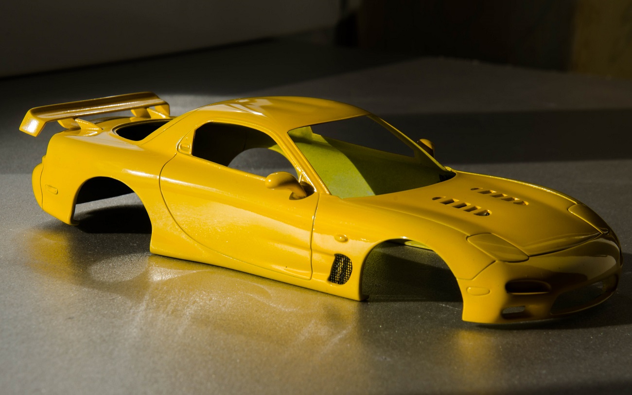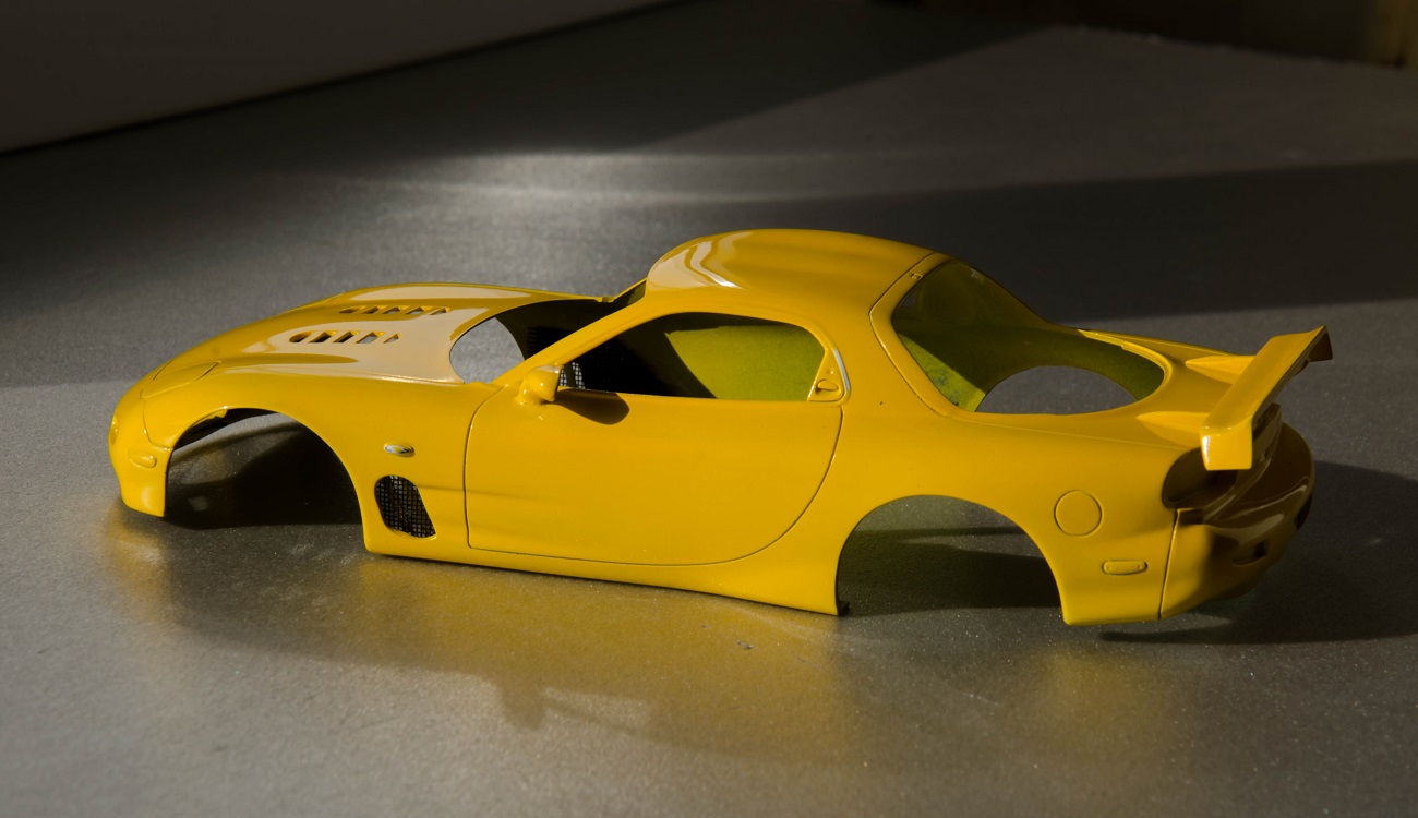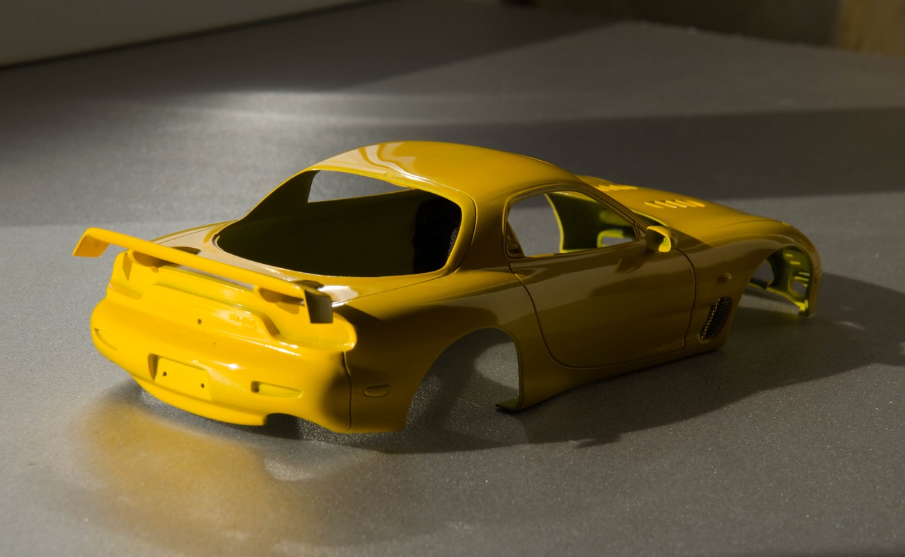 После данных манипуляций, я решал дилемму с будущим цветом кузова... все что-то не так было... нужен был яркий, привлекательный и не навязчивый оттенок, красный слишком банален и по моему субъективному мнению вообще не идет RX-7. Решил использовать желтый... поехал в модельный магазин и прикупил Tamiya X-08 Lemon Yellow, ну или впростонародье "Канарейкина задница"