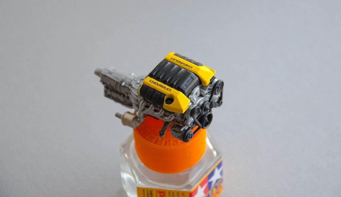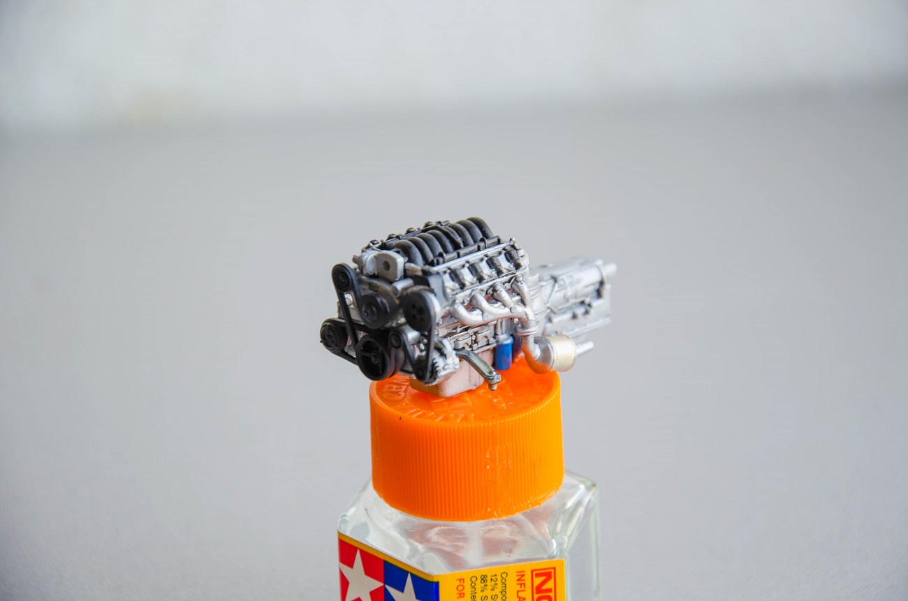Далее, использую кисть покрасил части днища и арки черной F-01 от Pacific, часть карданного вала задул в Tamiya XF-24 Dark Grey, коробку передач и картер двигателя в Tamiya X-31 Titan Gold, турбину красил кистью, в цвет М-03 (Сталь) от Pacific, краска классная, но вот сам цвет показался слишком ярким, как-будто полированный металл, радиатор - Tamiya XF-16 Flat Aluminum. На данный момент, все выглядит вот так
