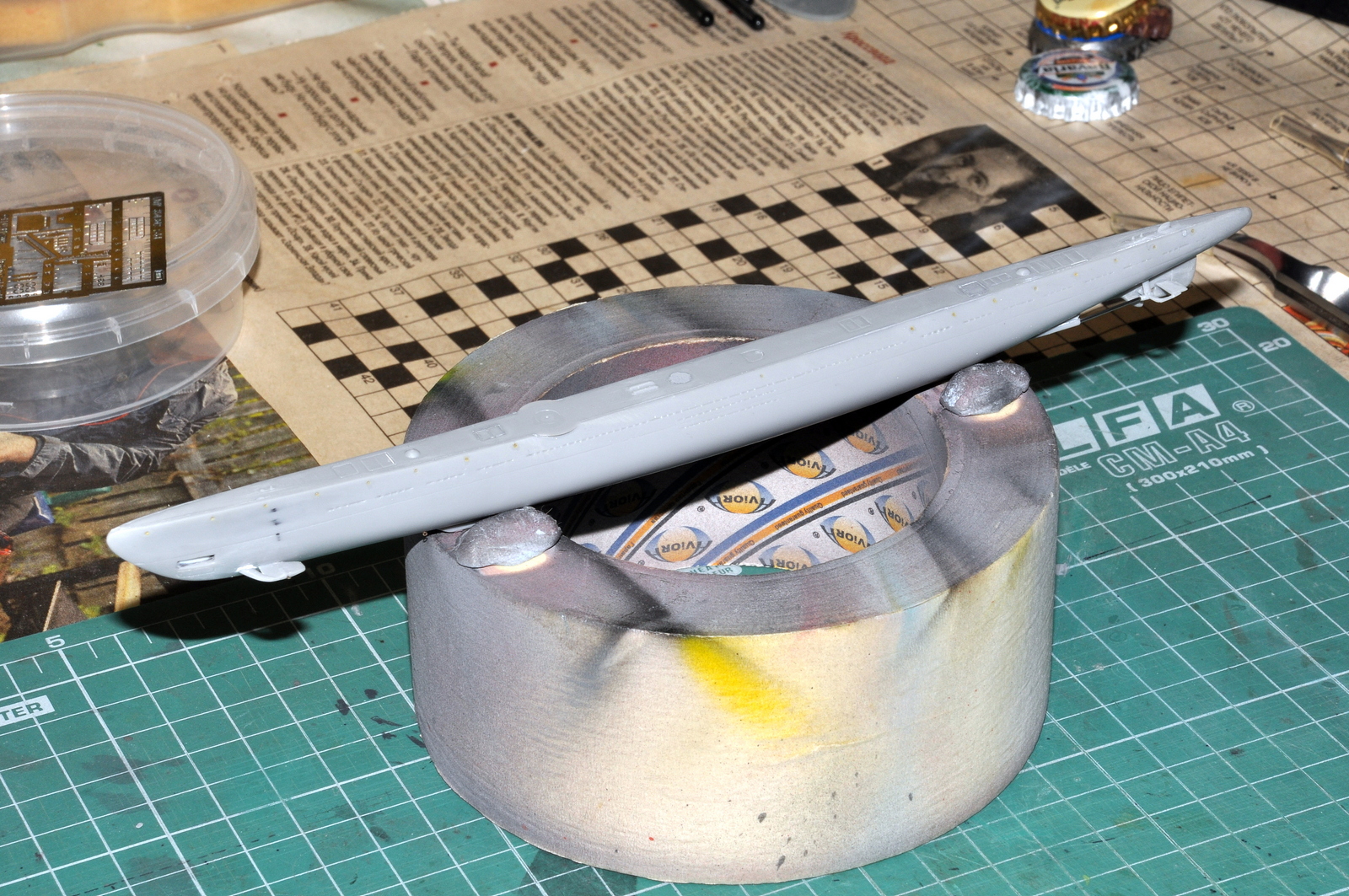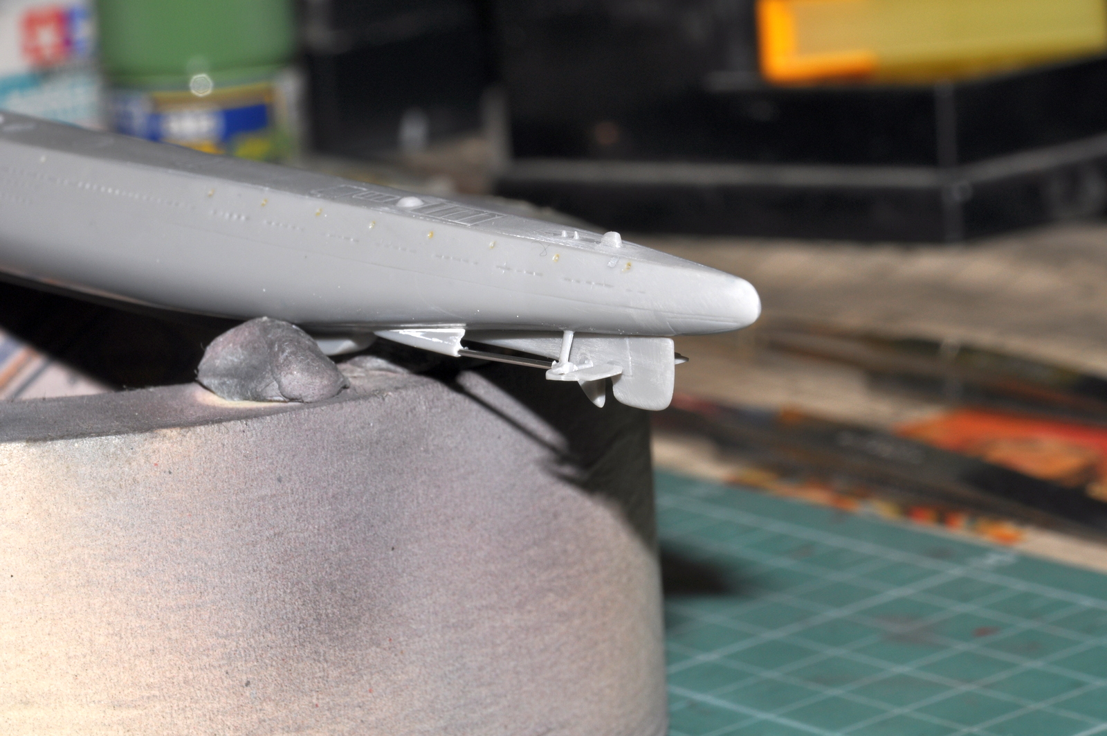 Корпус - собран, открыт торпедный аппарат, показал на корпусе полукруглые шпигаты вдоль верхней палубы, смонтировал носовые горизонтальные рули и в корме все винто-рулевое хозяйство. Гребные валы заменил на медицинские иглы - 0,6 мм.