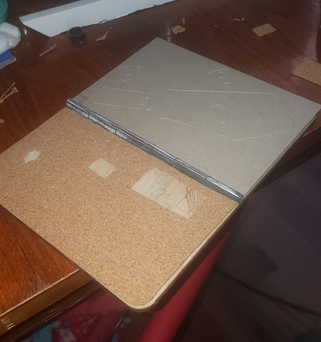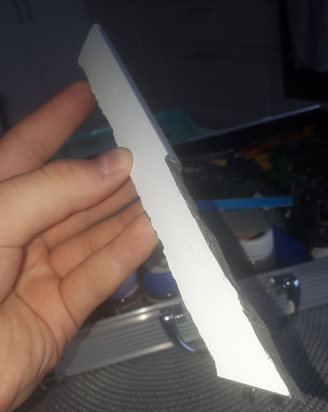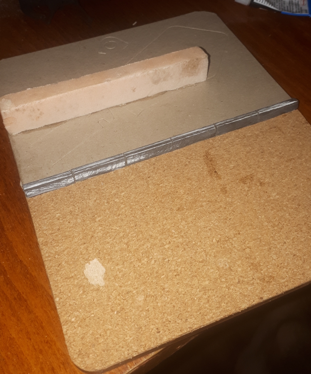 Бордюр об будущий кусок дороги делаю из фоторамки. Асфальт решил попробовать сделать из пропковой подложки. По рельефу вроде похоже на типичный асфальт. Вырезал места под будущие заплатки и расковырял дыру.