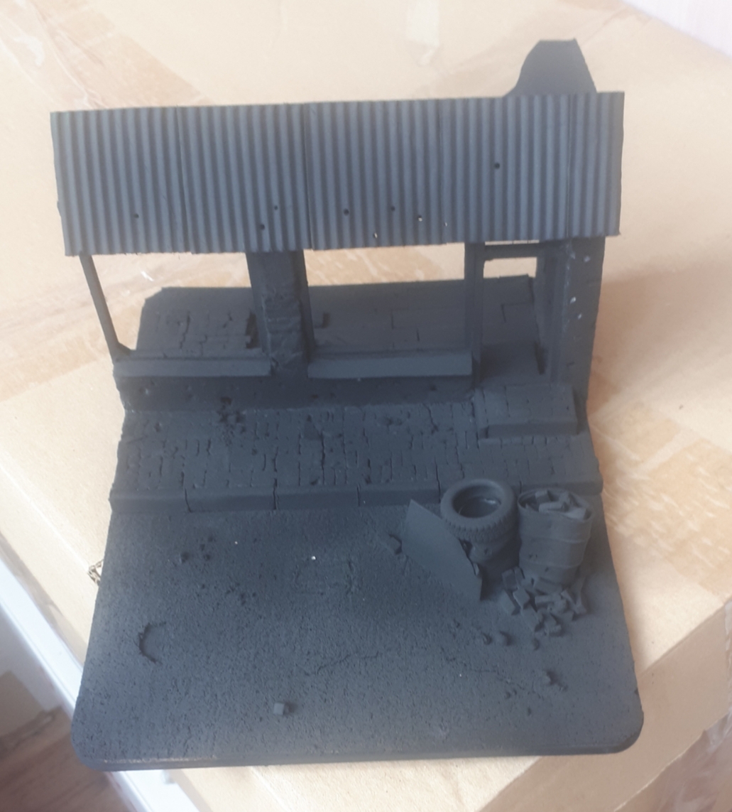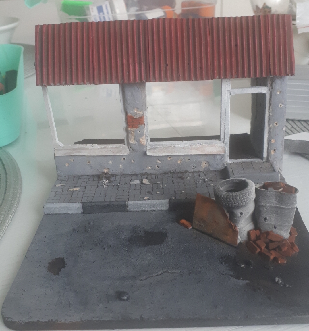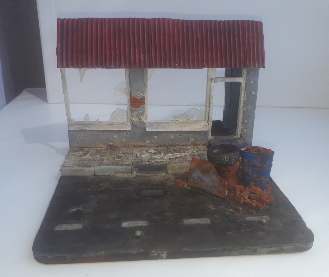 На моделисте заказал мятые бочки. Бочку без верха наполнил кирпичем. От сломанной детской машинки забрал дверь и колесо. Из всего этого на переднем плане собрал небольшое укрепление, служащее прикрытием входа в сельский магазин. Возле здания накидал эмитацию отколотой штукатурки от выстрелов и немного мусора на дороге. Сделал дырки от путь в крыше и штукатурке здания. Все загрунтовал черным грунтом кудо.