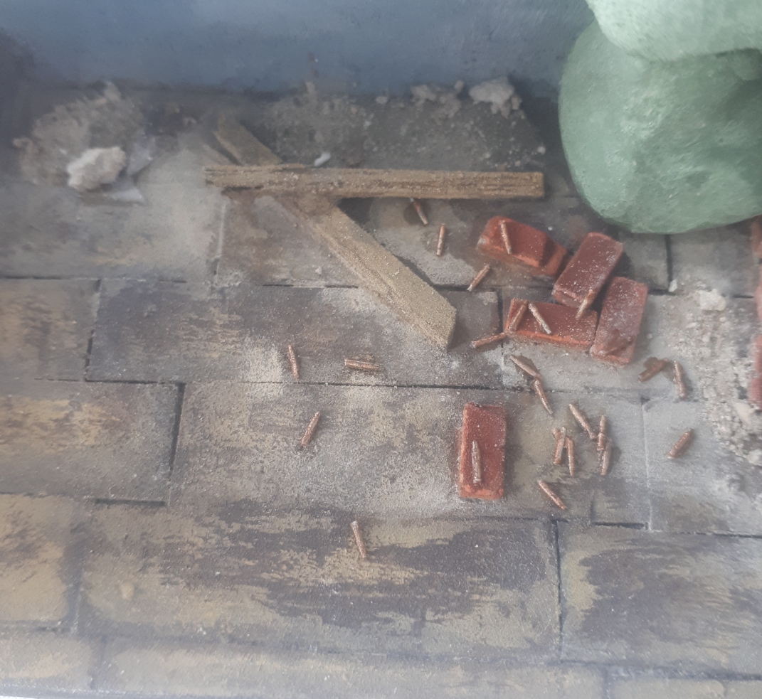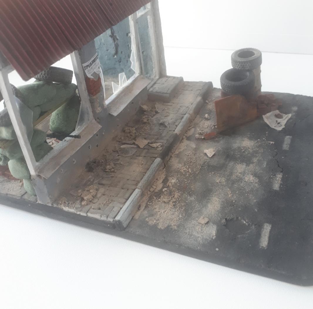 После небольшой паузы продолжил работу над диорамой. Начал пачкать ее пигментами, наклеил битые стекла на рамы, начал красить бочки. Потом займусь внутрянкой.