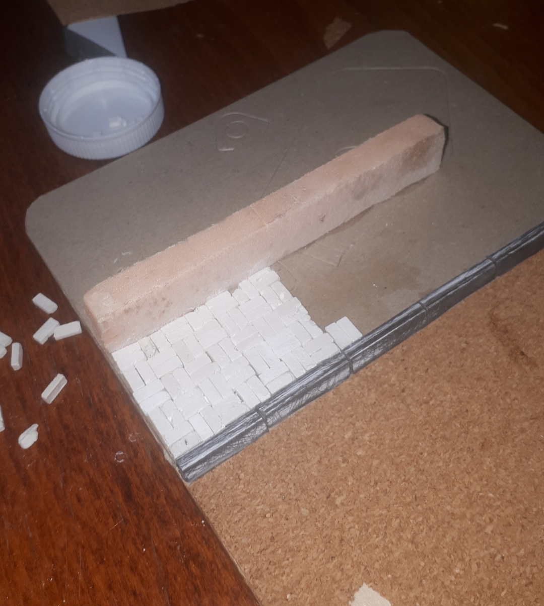 Полы внутри здания делаю из картона от порванной детской книжки) хорошо, что жена не выбросила. Из кирпичей выкладываю основание под утес.