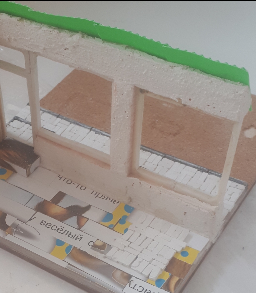 Остатками гипсовой штукатурки обмазываю здание. Надеюсь получить внешний вид сельского магазина. После засыхания буду шлифовать грубой наждачкой. У дочери нашел обрезки гофрированного картона. Внешне напоминает профлист. Леплю на фасад