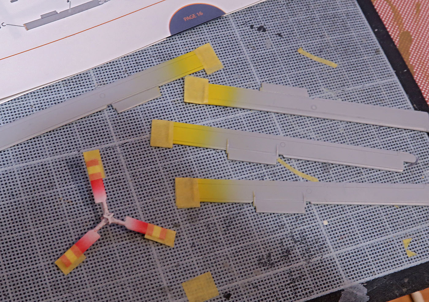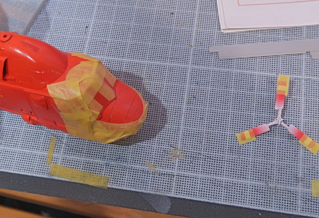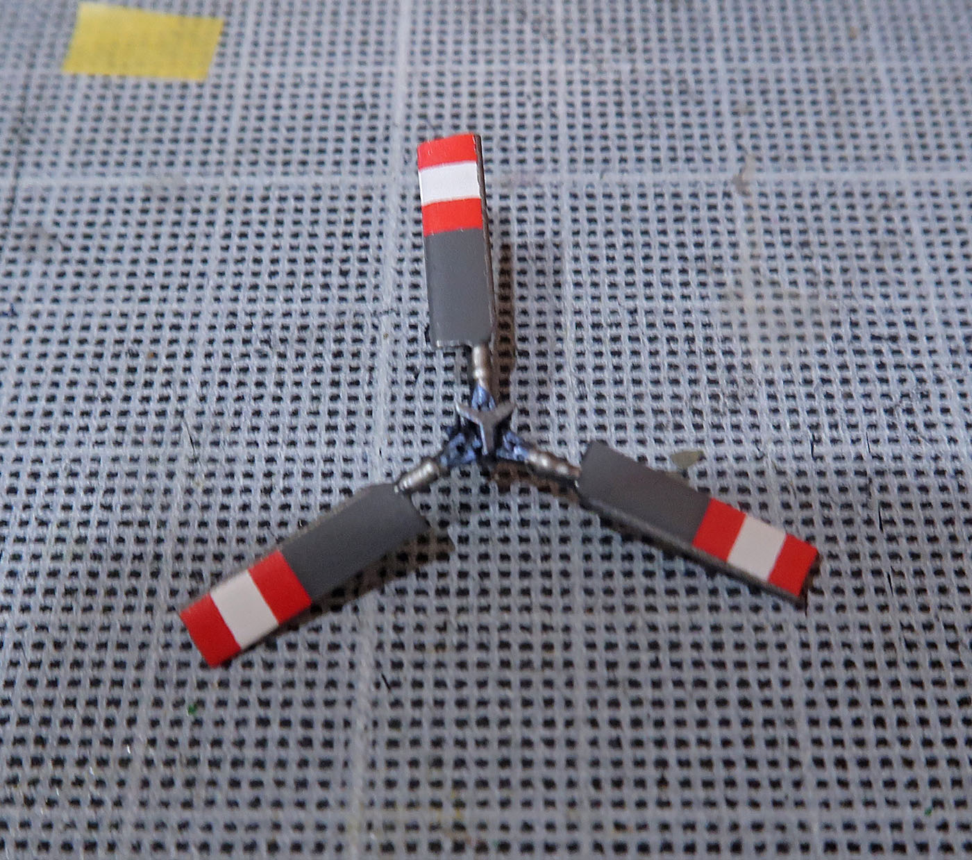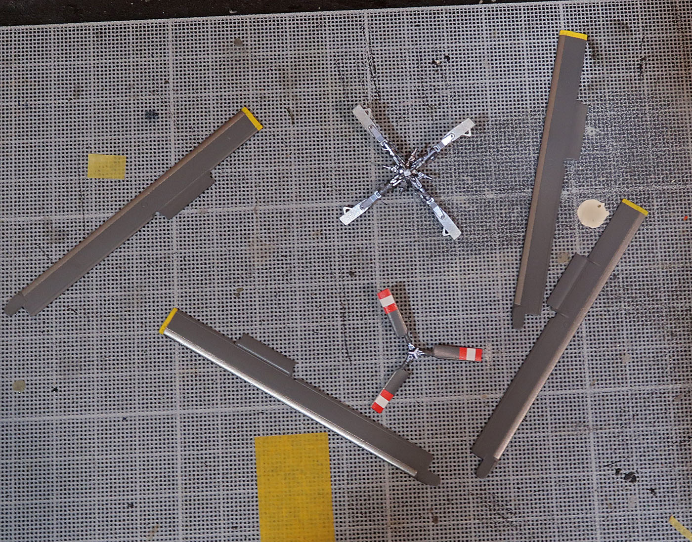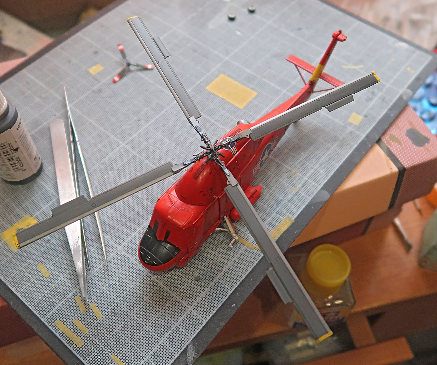На лопастях несущего - маски еще пригодятся, а на рулевом снял - т.к. полоски металла по кромке пойдут поверх.