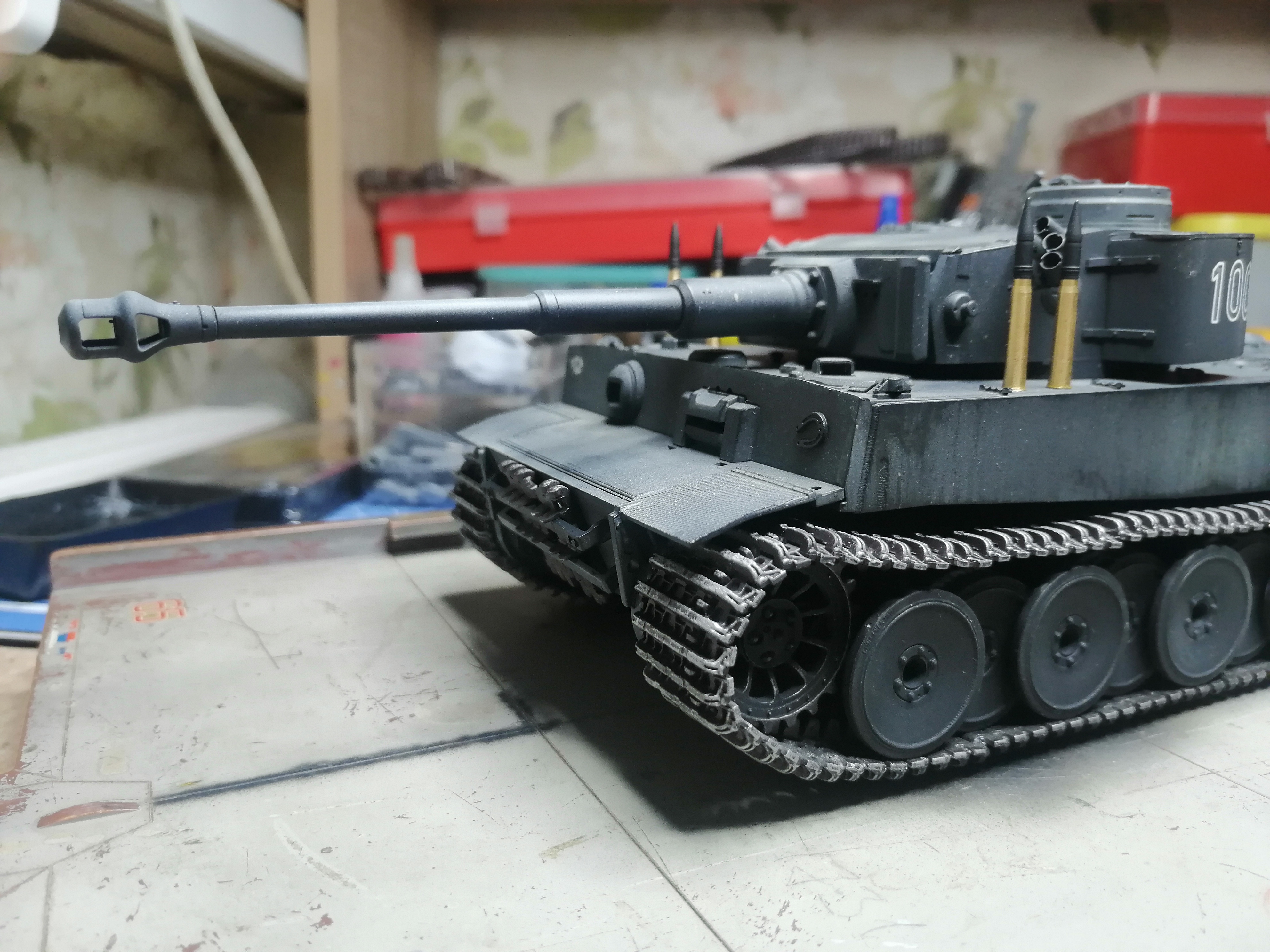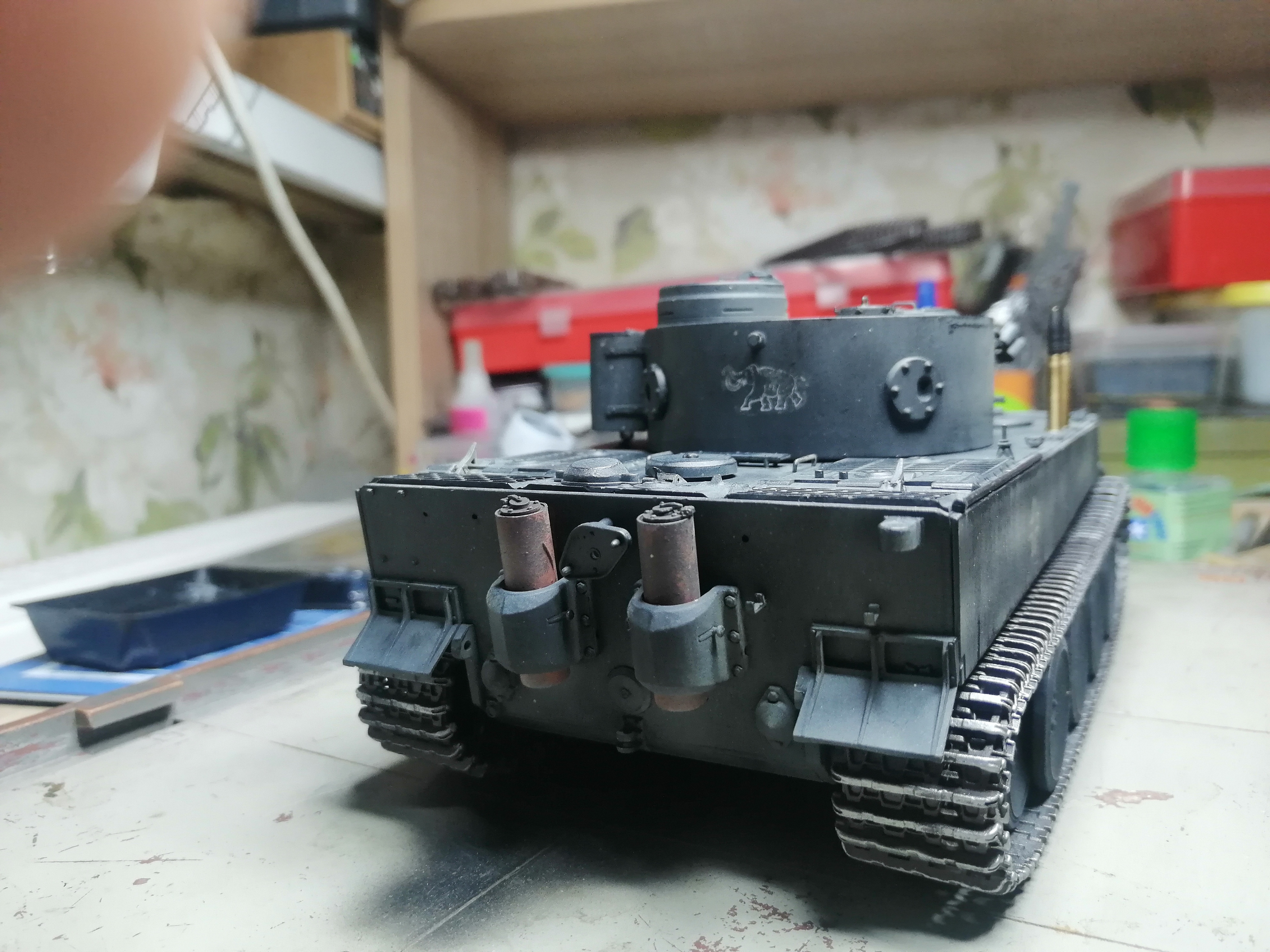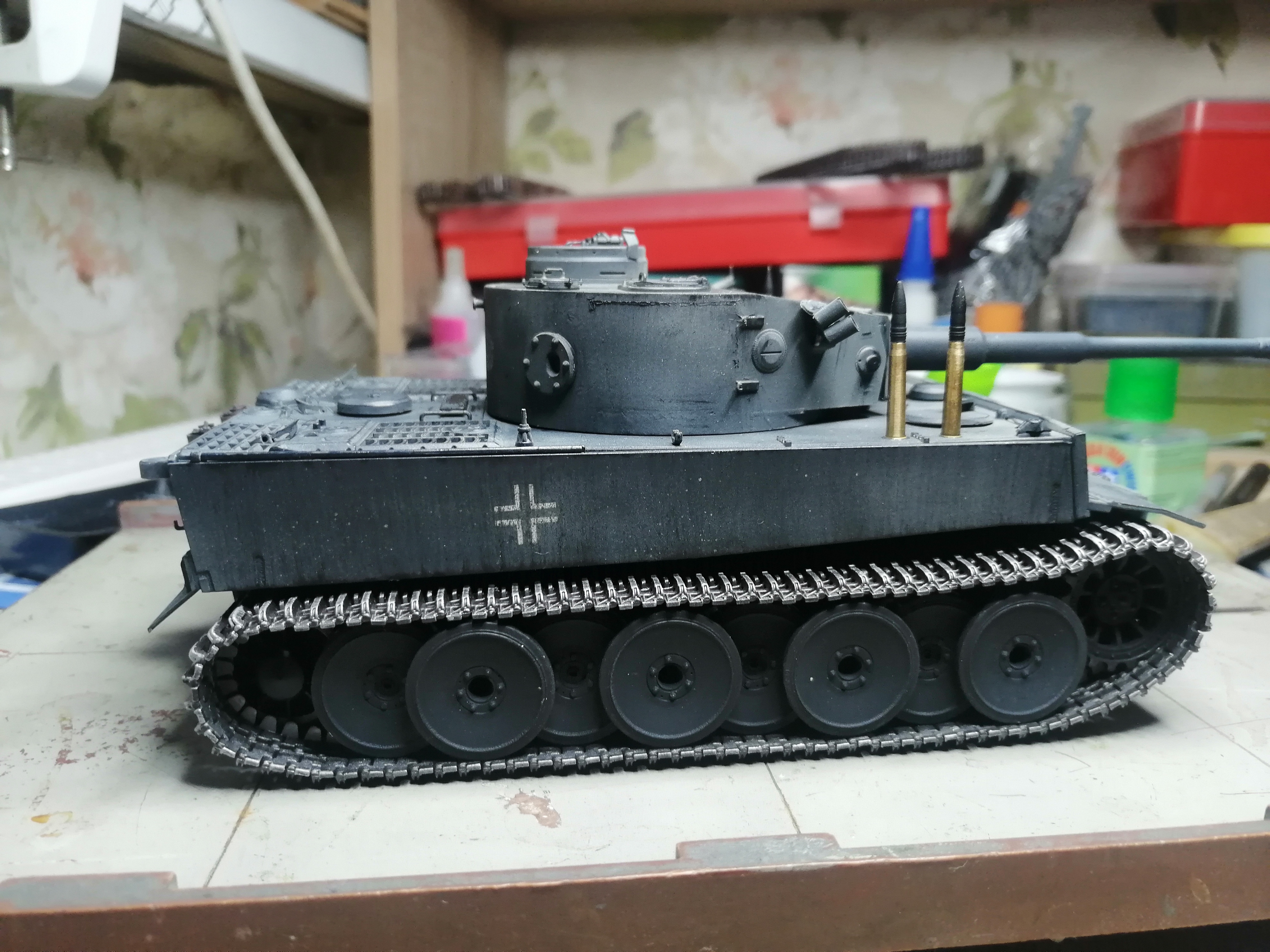 Приветствую! У меня легенда такая же, но только три тигра, +академ и звездв. Я, решил делать от Dragon 6252 с выставки трофеев в ПКиО им.Горького 1943год. Покрасил как и рекомендовано н-32, даже по началу испугался больно тёмный цвет, потом нанёс пыль и тд. С декалью вышел казус, т.е. развалился номер 100 и крест не приварился, короче косясный вышел... Да, и цифири большие предлогаются, а должны быть меньше..... Да, не обращайте внимание на установку снарядов, в курсе.... Может чем и помог.....
