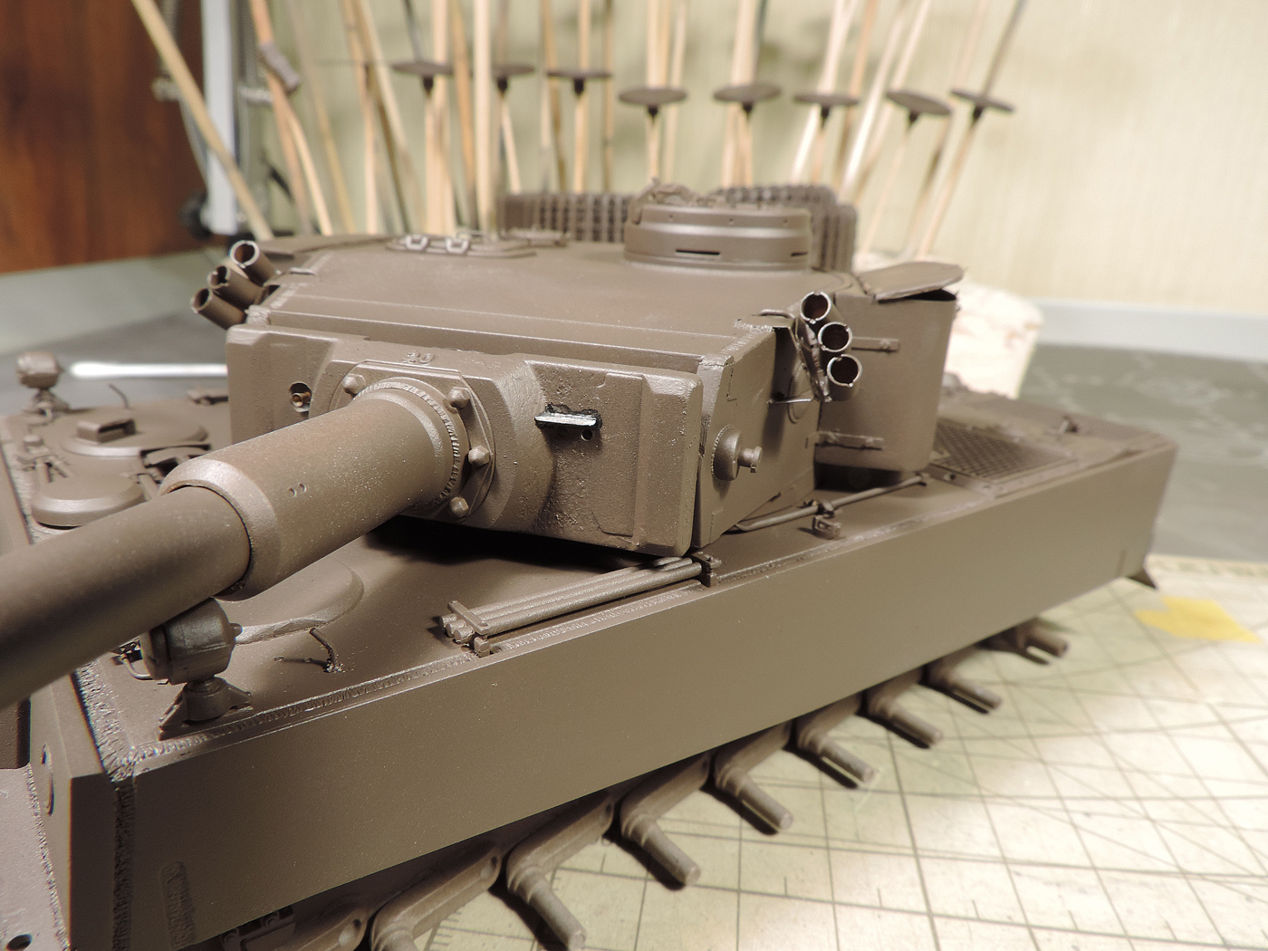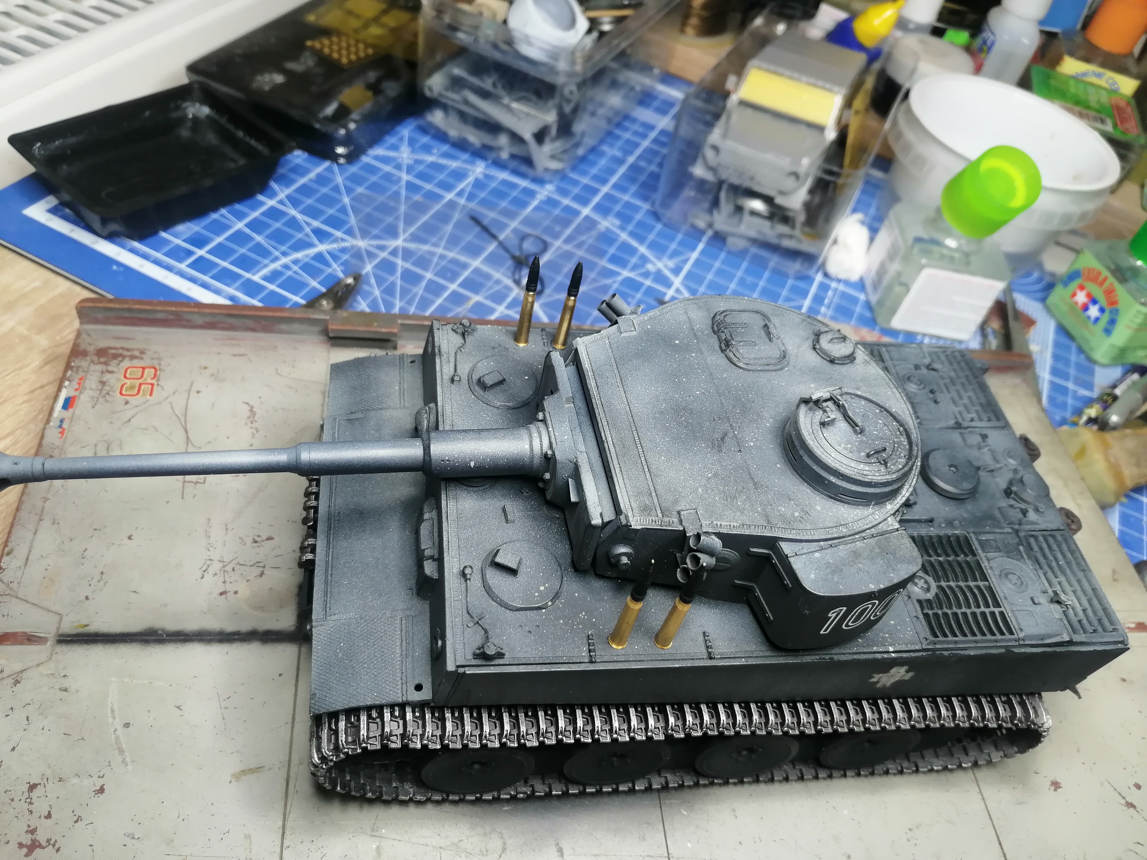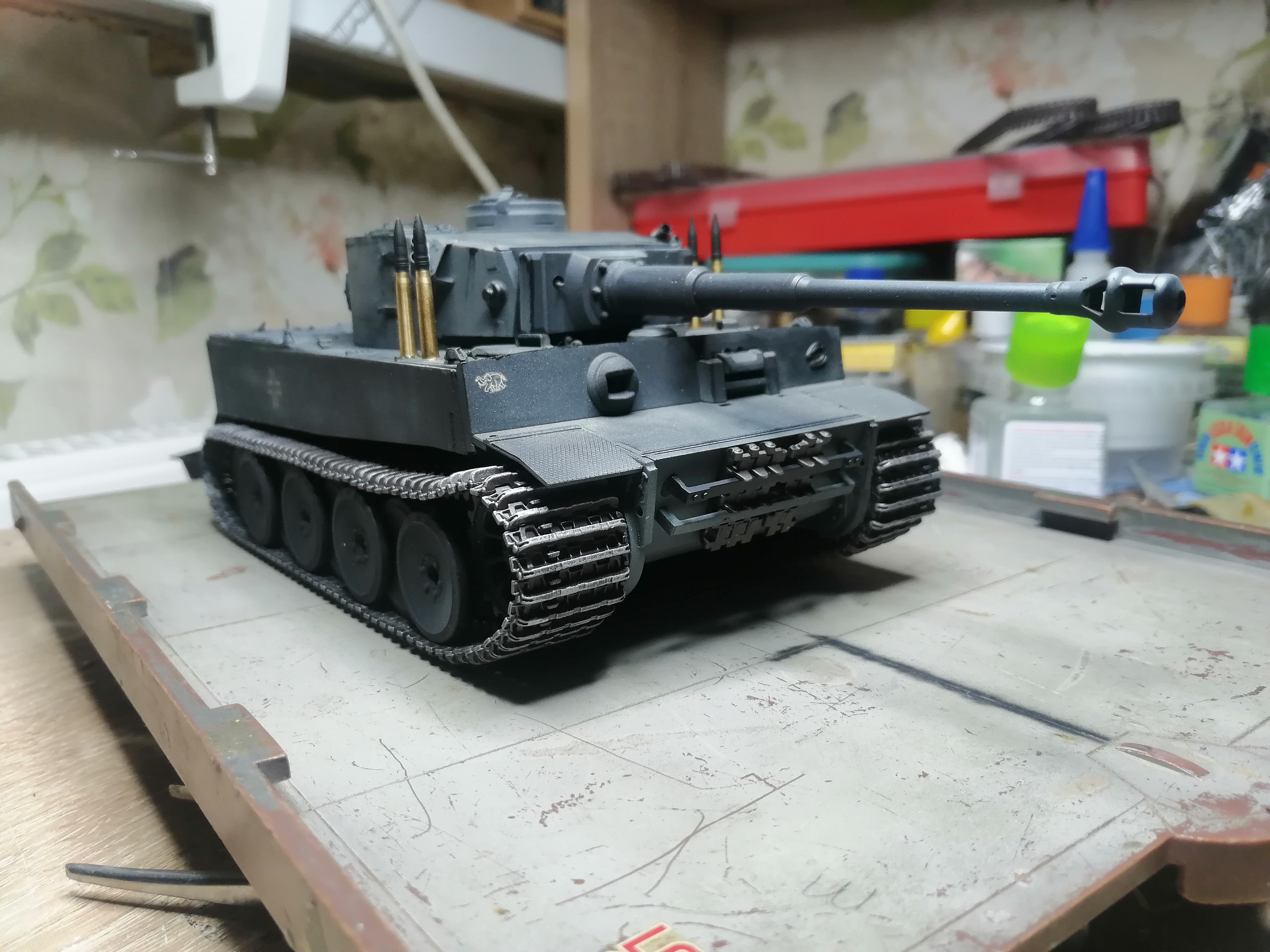 Приветствую! У меня легенда такая же, но только три тигра, +академ и звездв. Я, решил делать от Dragon 6252 с выставки трофеев в ПКиО им.Горького 1943год. Покрасил как и рекомендовано н-32, даже по началу испугался больно тёмный цвет, потом нанёс пыль и тд. С декалью вышел казус, т.е. развалился номер 100 и крест не приварился, короче косясный вышел... Да, и цифири большие предлогаются, а должны быть меньше..... Да, не обращайте внимание на установку снарядов, в курсе.... Может чем и помог.....