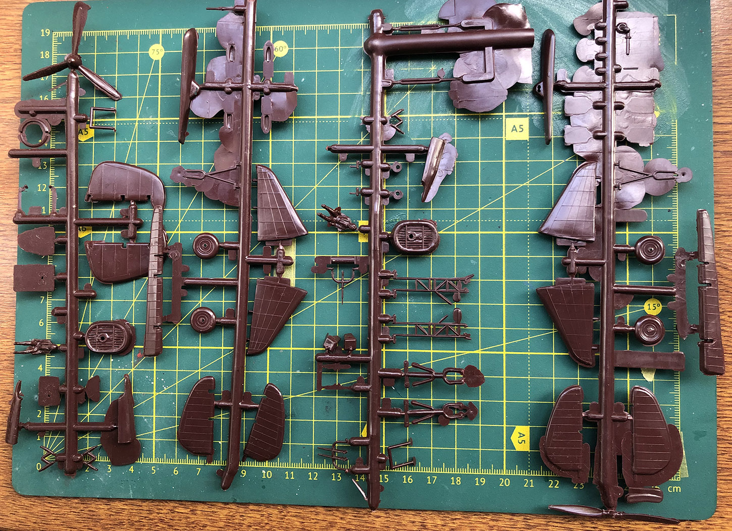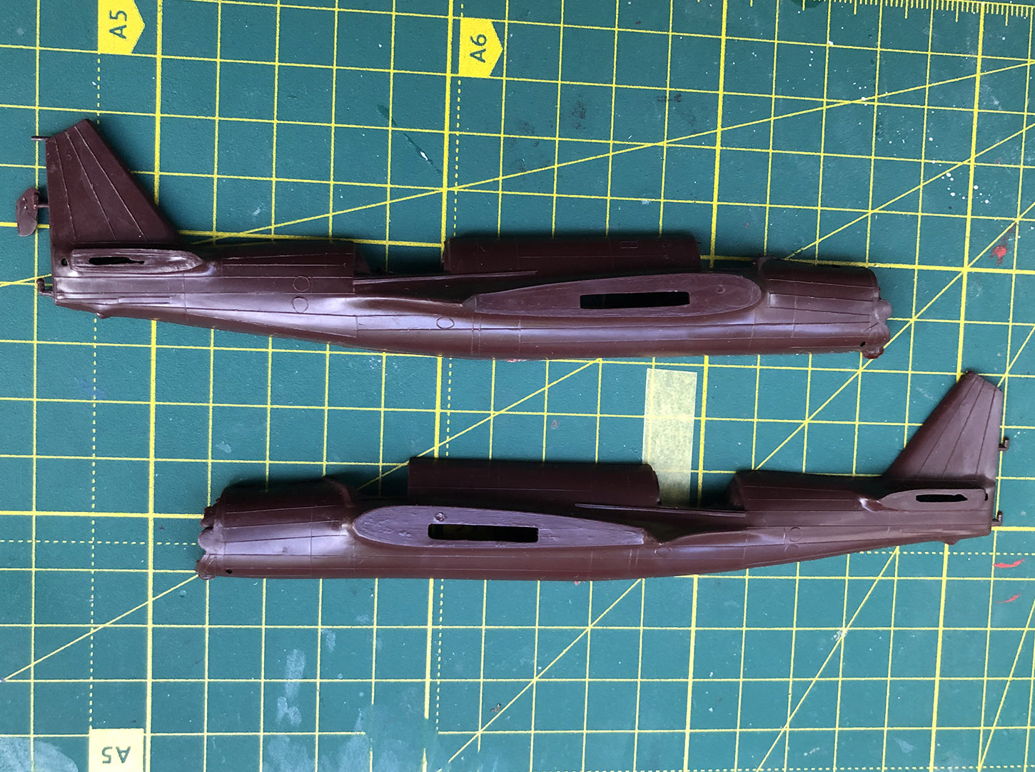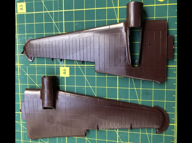 С развалом СССР начали использовать другое сырье и быстро угробили формы. Чуть попозже я постараюсь показать разницу в пластике между литьем с разницей в производстве в три-четыре года. Хоть облоя и много, но сами поверхности крыла, оперения и фюзеляжа - ничего себе.