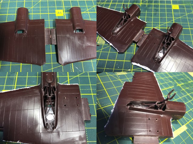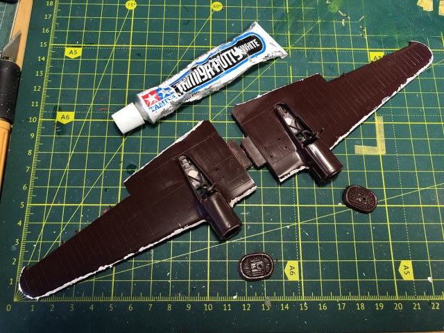 Рассверлил и вставил выхлопные патрубки. Отделил стойки шасси от облоя. Зашпатлевал следы толкателей в нишах. Склеил половинки крыльев с установленными стойками. Зашпатлевал швы. Сохнут.