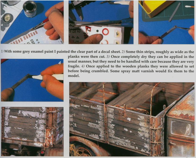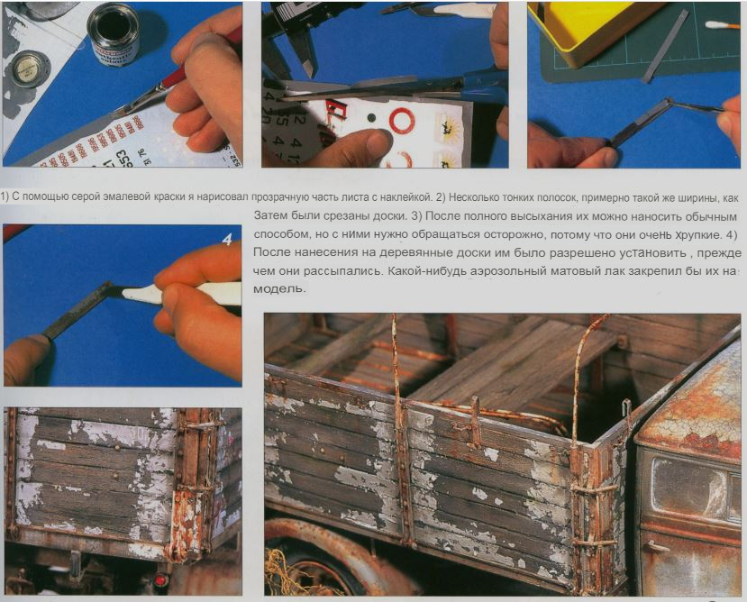 База, глянцевый лак (только под декаль!), затем декаль, сверху еще глянцевый лак (тоже строго на декаль). Этим мы уберем серебристую подложку. Далее для подстраховки (можно это пропустить, все зависит от того, какими красками наносите базу) матовый лак. Лак для волос (не толстым слоем, но и не слишком мало, это важно), минут 5 ждем, потом белой краской наносим зимник. При том наносить нужно неравномерно, где то тонким слоем, где-то основательно дунуть белым. Ждем минут 15 (тоже весьма приблизительно, от лака еще зависит) и начинаем смачивать теплой водичкой и жесткой! кистью понемногу удалять краску, делая облезлости. Там где слой белого был тонким, нужно делать очень аккуратно. Когда все сделали, можно усилить эффект нанеся вертикальные полосы водорастворимой краской (для зимника есть специальная) и растушевать их.