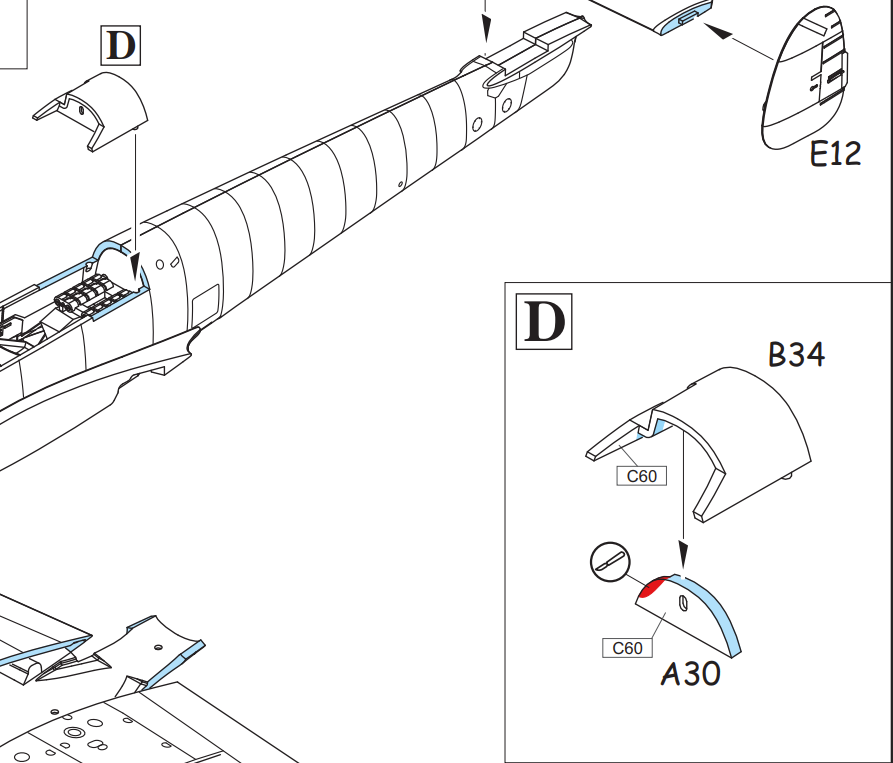 На ранних Цезарях, а это именно ваш вариант и С-4 не должен вас волновать, в "спокойном" положении МГ укладывался в нишу на правом борту по полёту. Для положения "для стрельбы" нужно было открыть подвижную часть фонаря стрелка, и МГ мог двигаться на шарнирной стойке, которая в вашей инструкции обозначена Н2. Так что, вы можете выбрать и сделать любой варианта положения пулемёта и фонаря с деталью В34.