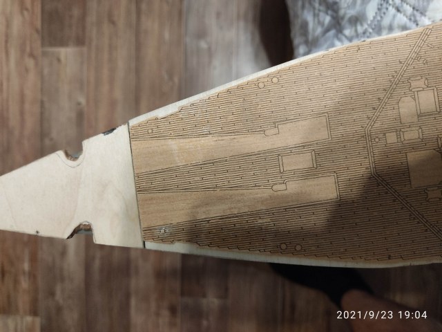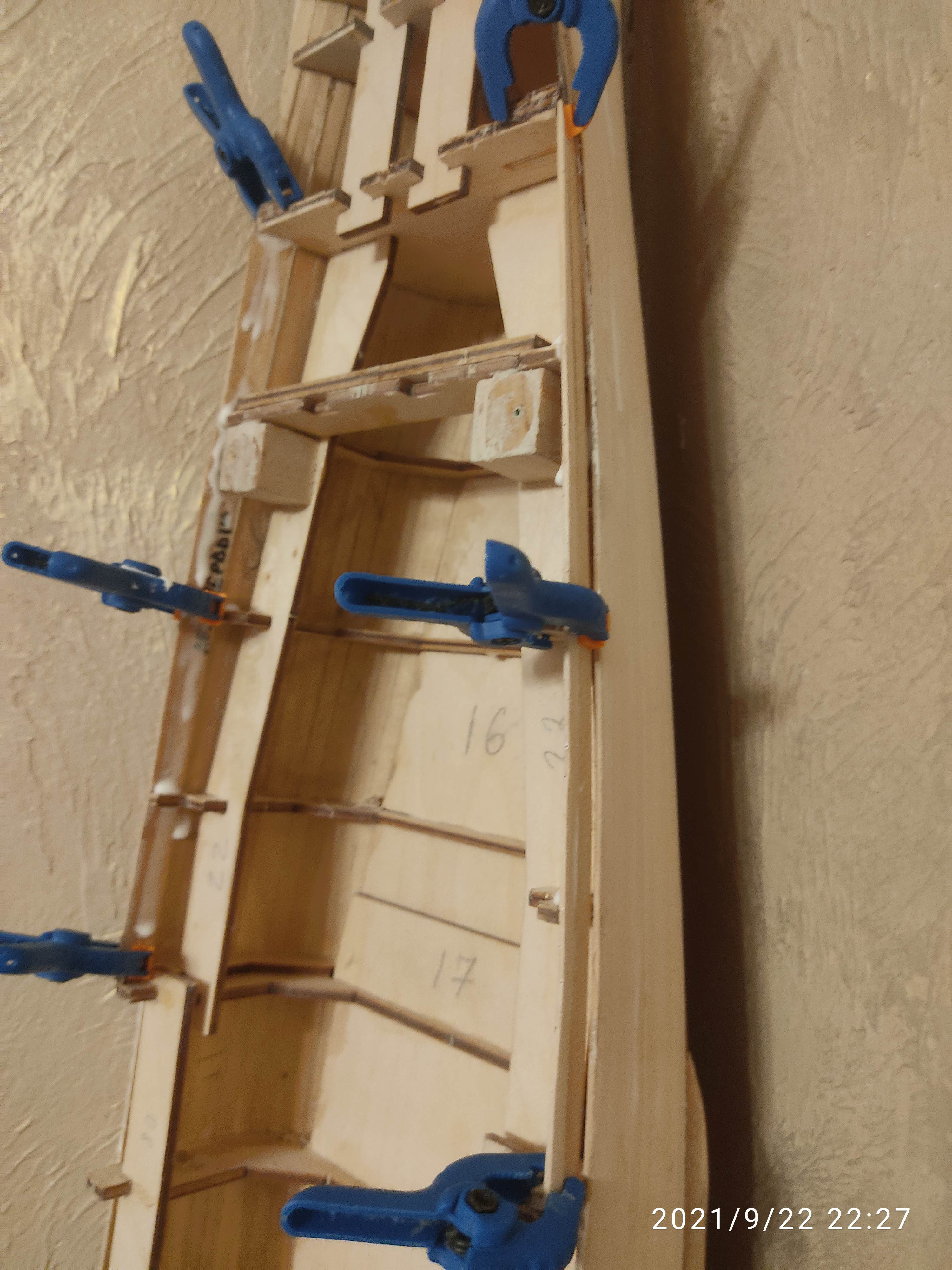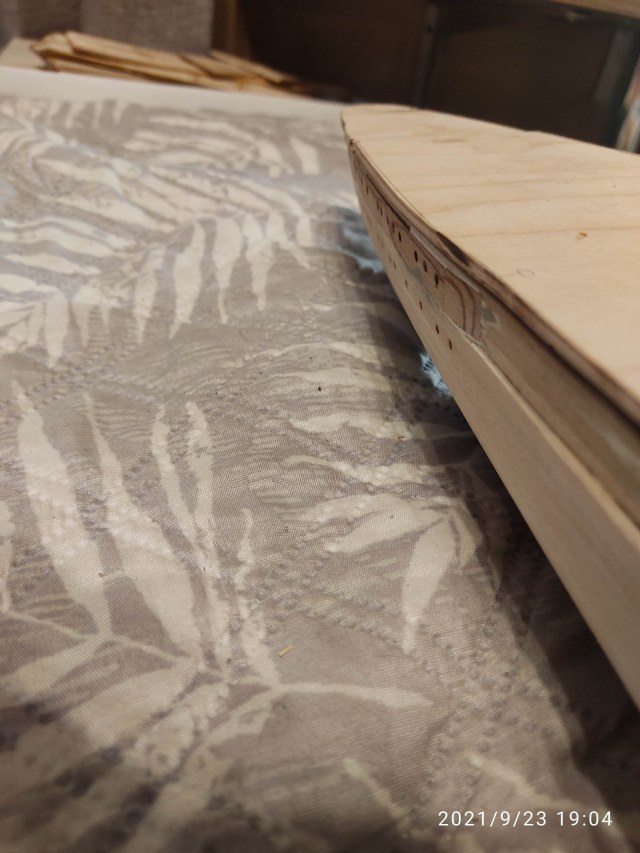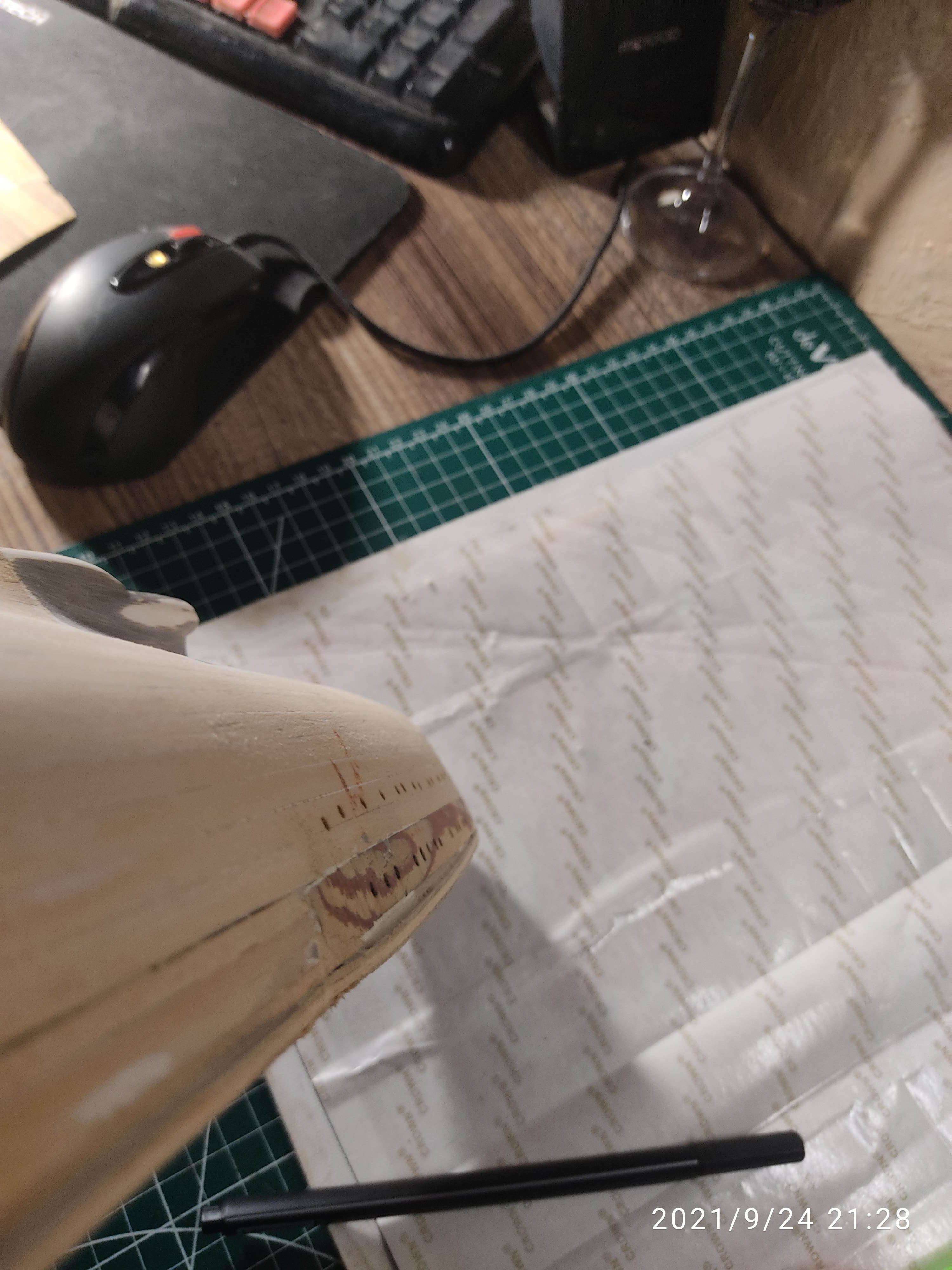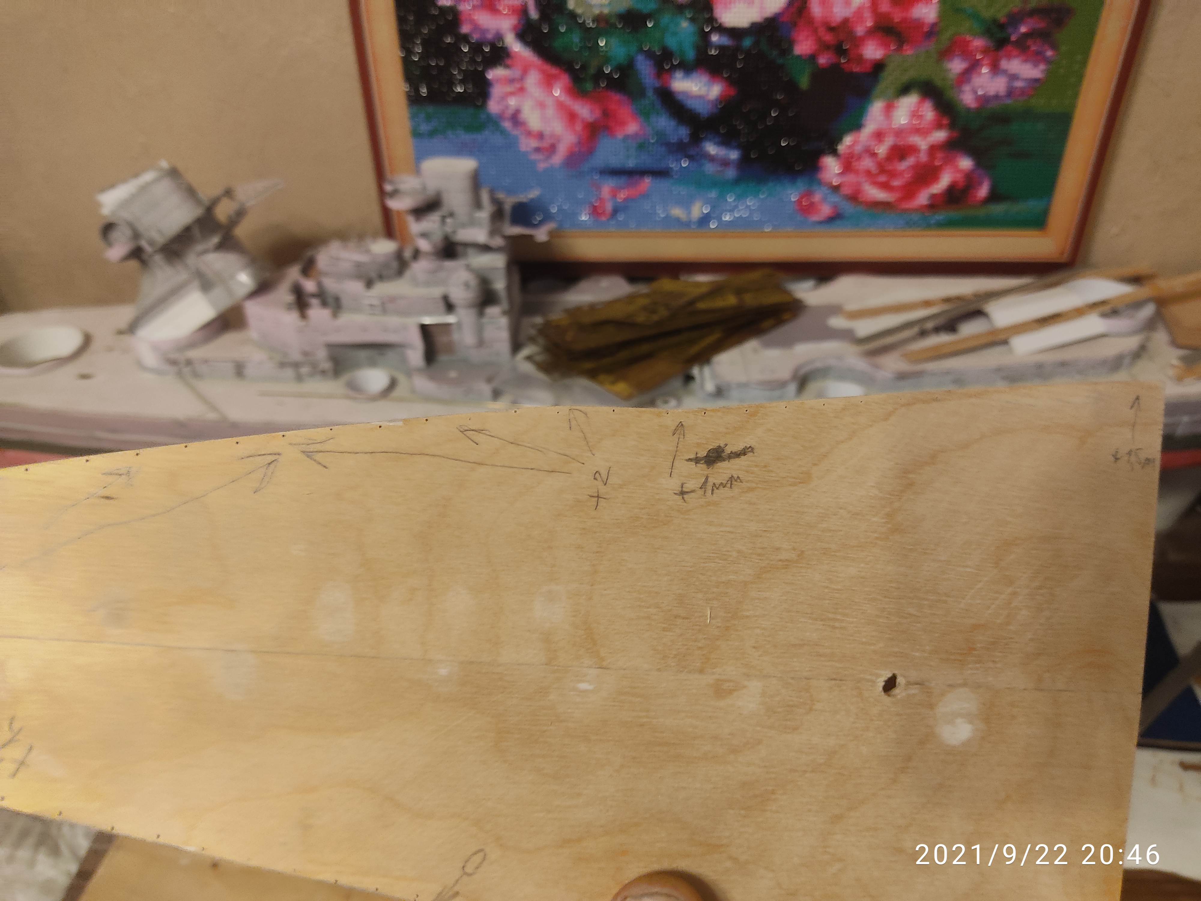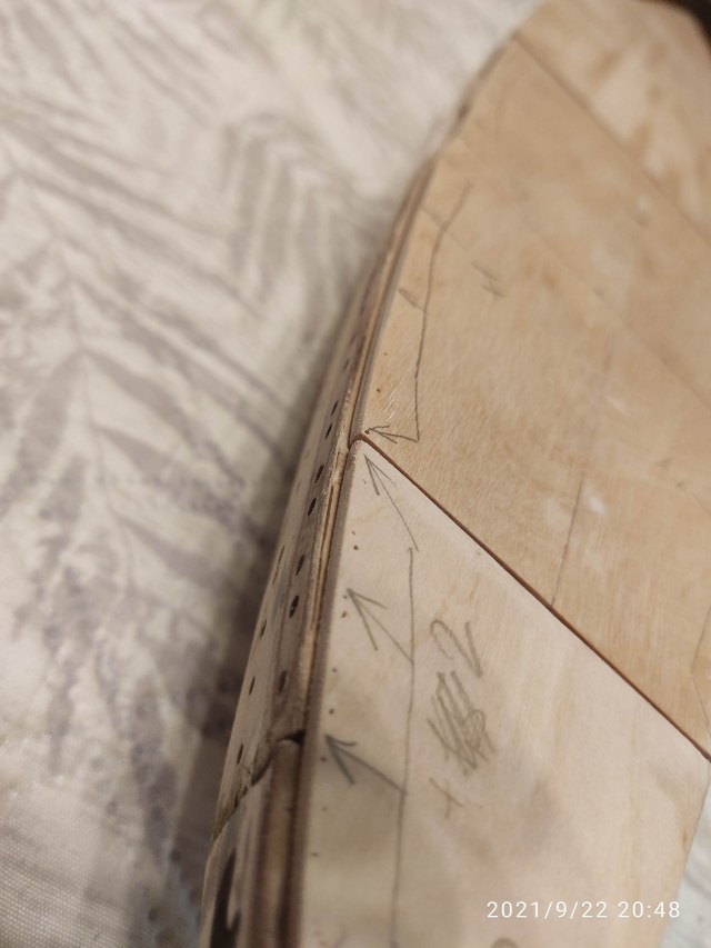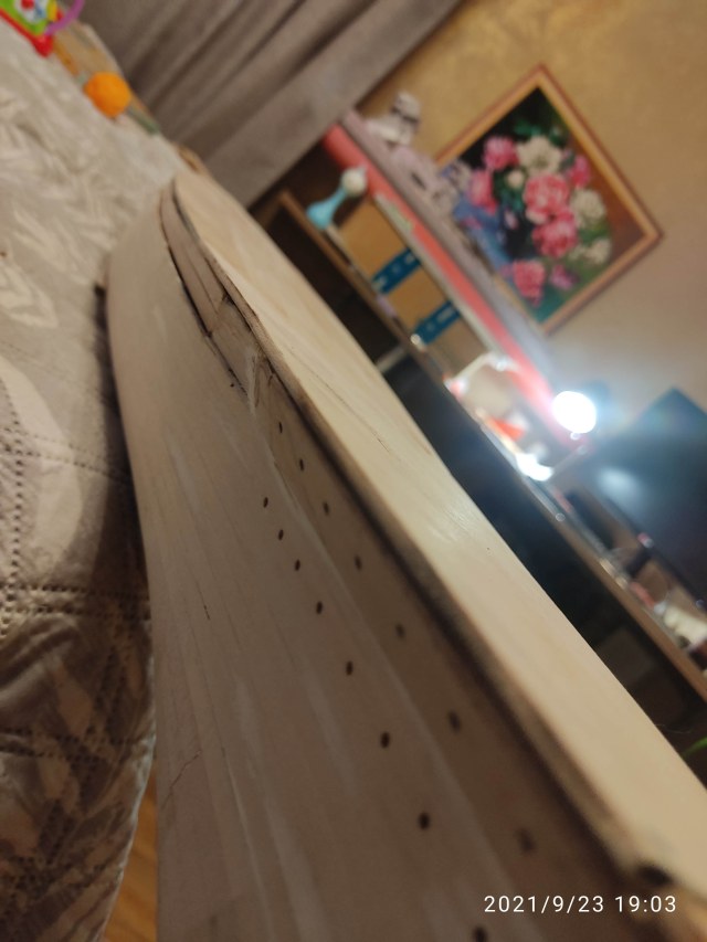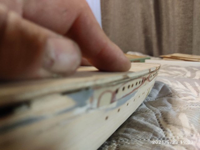 при проклейке обшивки обратил внимание на один нюанс шпангоуты носа и кормы не обточены на конус из за чего позади шпангоута образуется миллиметра полтора щель и что влечет сдвиг контура обшивки на полтора миллиметра наружу что очень сильно заметно при монтаже палубного настила. так же меняется и профиль корабля в разрезе.сверху на стыке палубы и борта появляется некая вертикальная поверхность высотой примерно миллиметра три четыре. она нивелируется конечно к центру корпуса но она отлично видна на его концах что с этим делать и делать ли вообще? у меня нет таких реечек да и при разборке корпуса боюсь переломается все к чертям.плюс планочки с иллюминаторами тоже испортятся при подрезке по контуру.