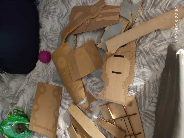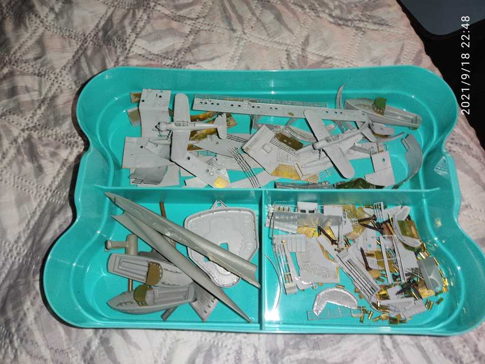 Приобрёл по случаю недостроенный патворк бисмарк. Человек его пытался сделать приобретя сразу весь набор. Но не сделал его и решил продать после того как он у него провалился. Корпус сделан вкривь и вкось все потрескано и побито. Надстройки много мелочи зачем то собрано. Все валяется и погнуто. Короче беда. Решил я спасти модель и по ней собрать свой бумажный Бисмарк используя его как пример