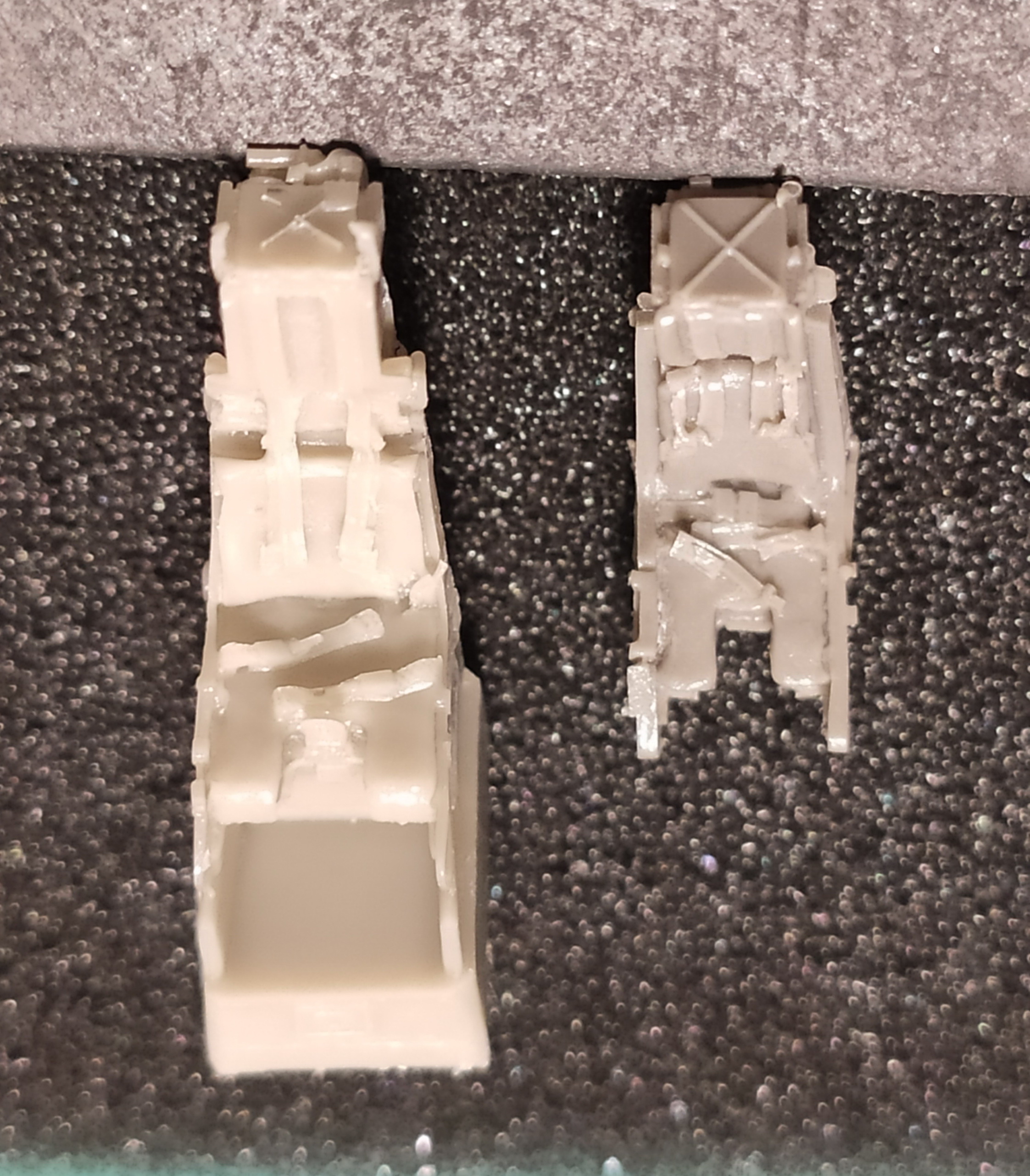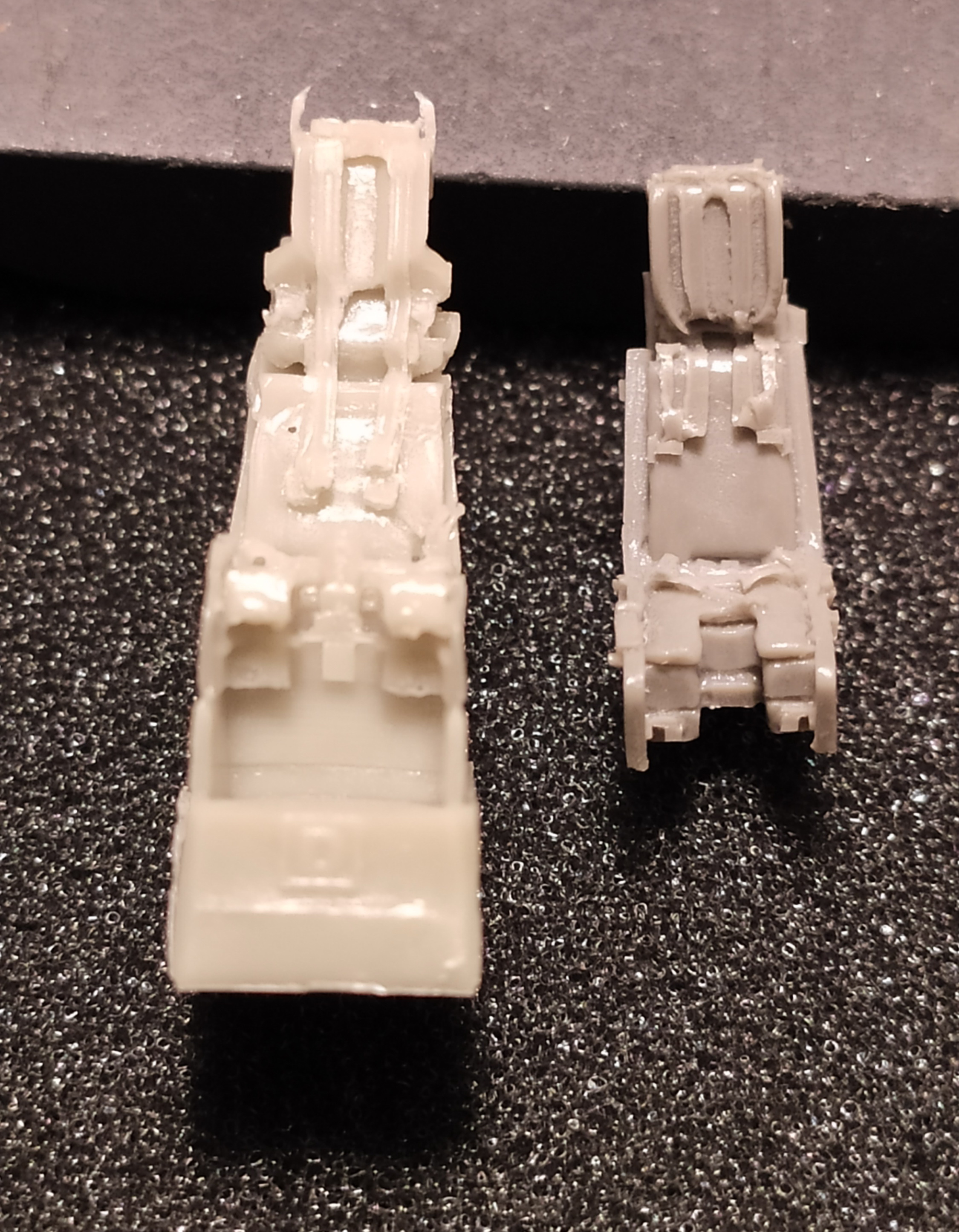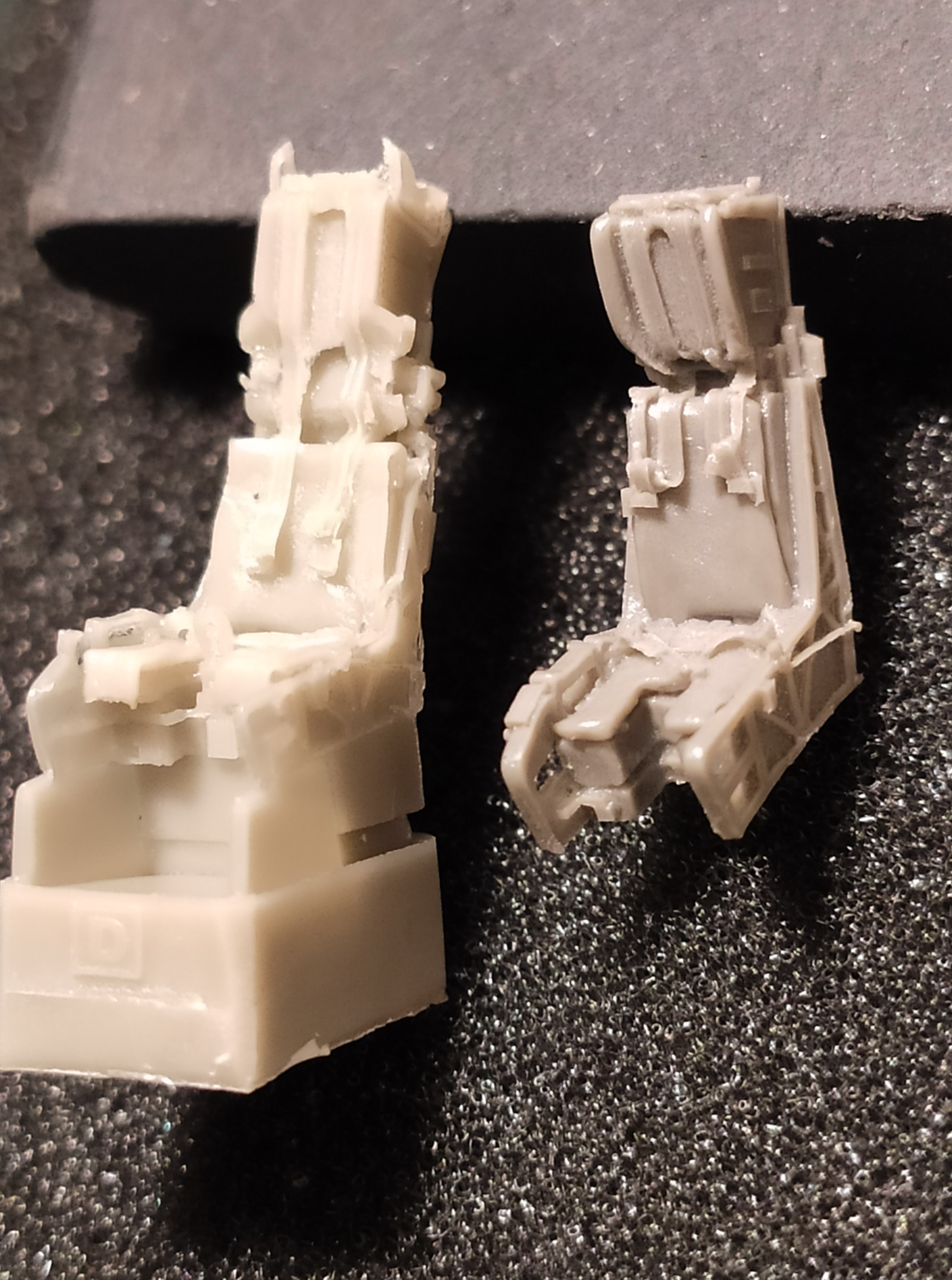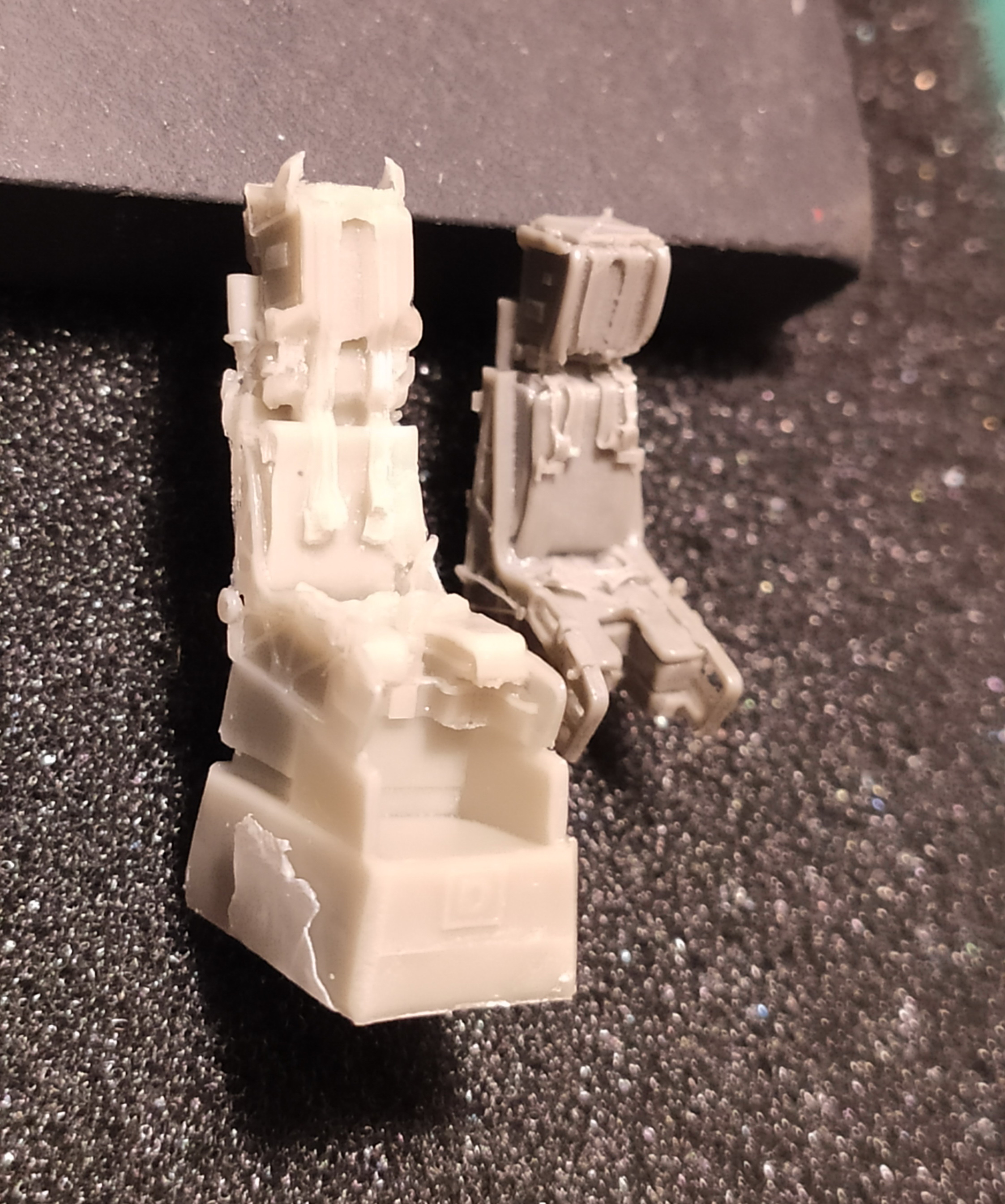 И та, и другая смола отлиты так себе. Обе не особо качественные. Что имеется в виду. Местами литье четкое, местами замыленное. Если сам каркас кресла отлит в общем-то четко, то сидушки и стропы слегка замылены. А они получаются на самом виду и определяют внешний вид кресла после окраски.
