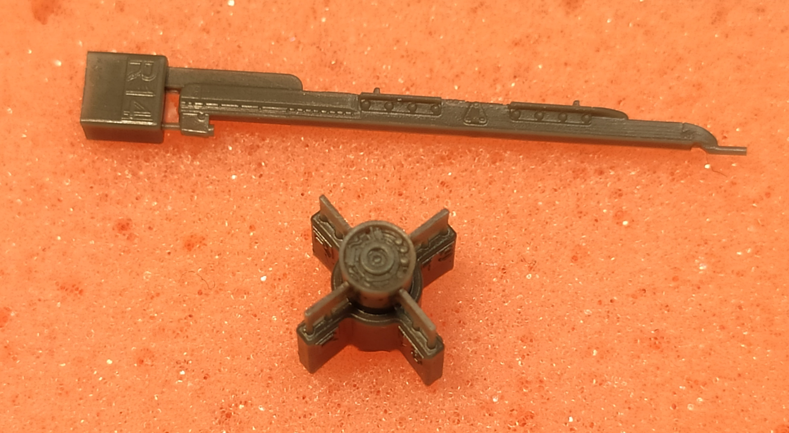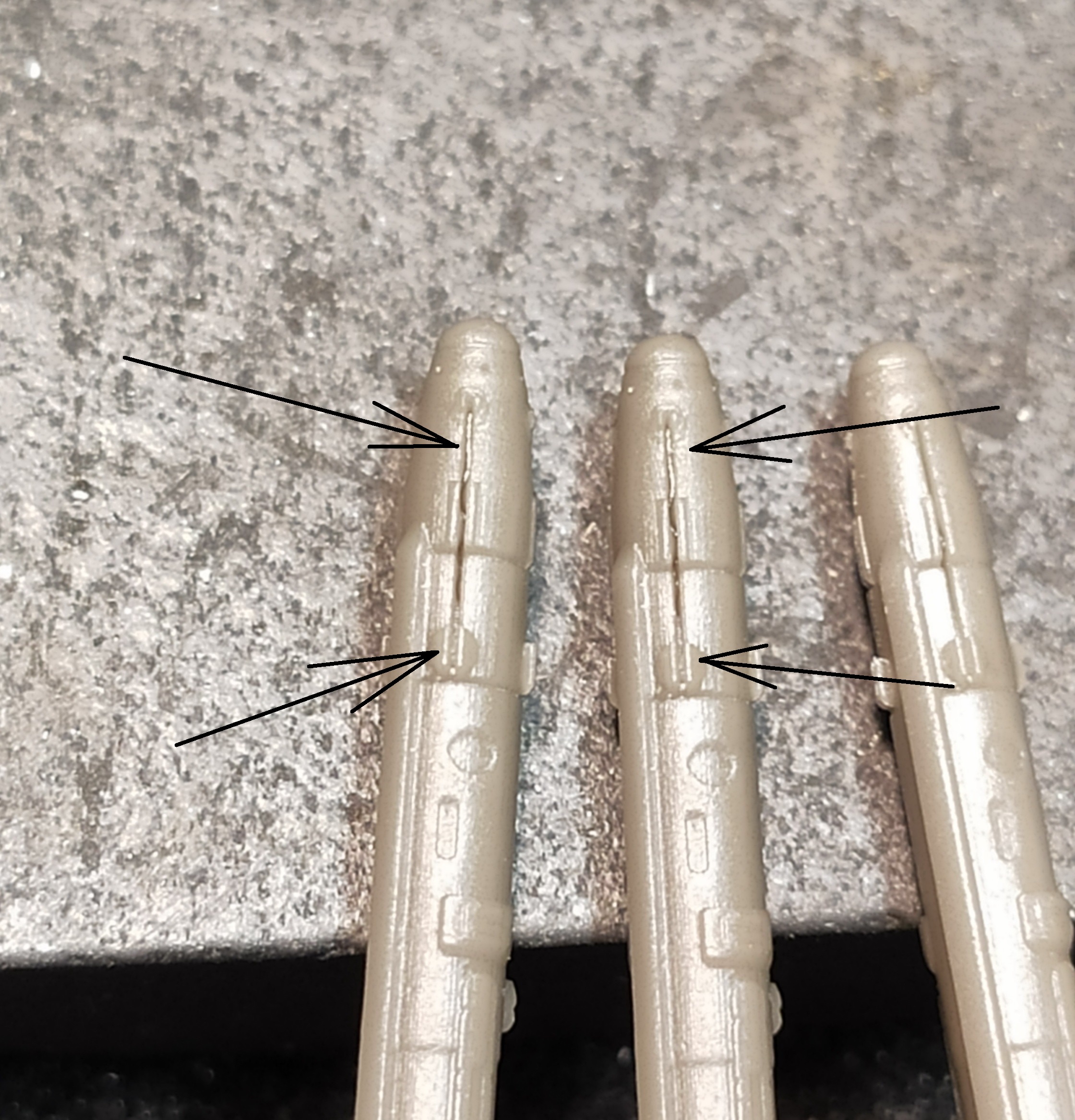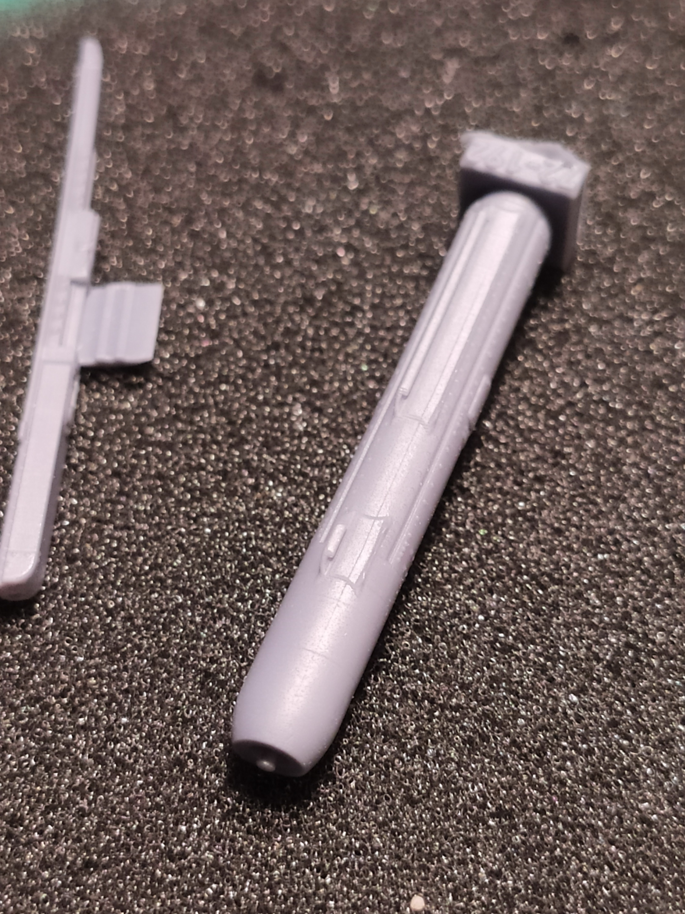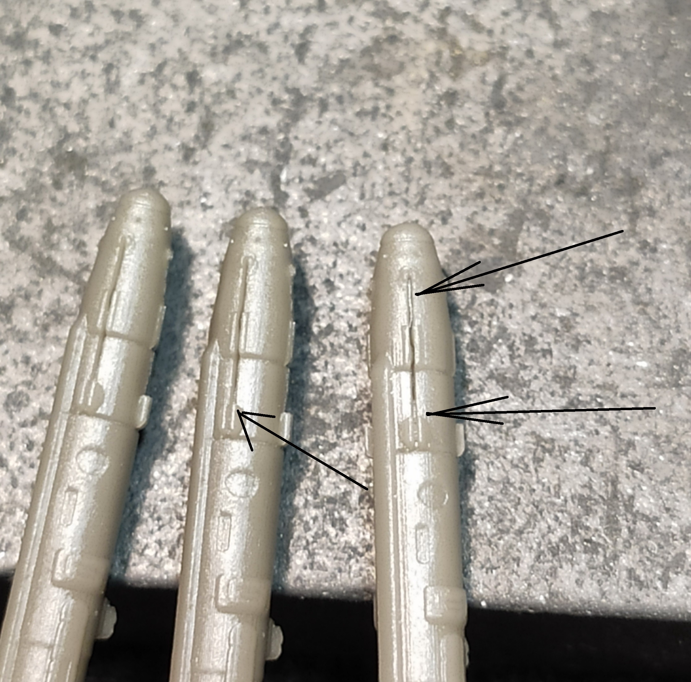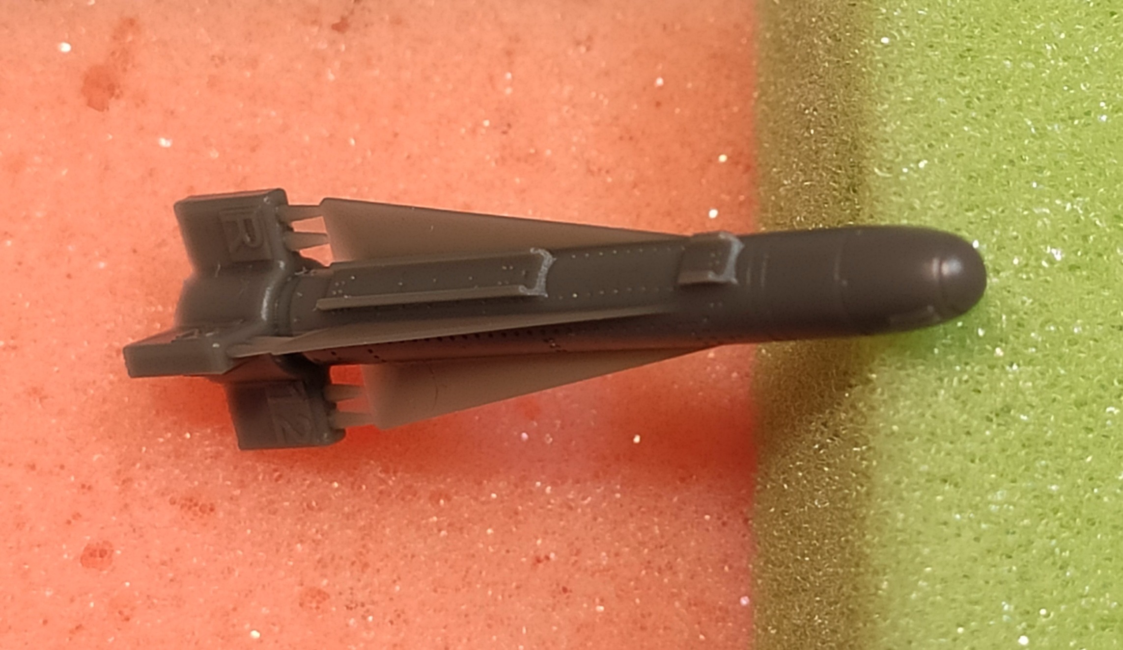 Первоначально я как то не обратил внимание на то, что одеть сами ракеты на полозья держателя-направляющей не получится. По той причине, что скобы-захваты на ракетах порпосту не пролиты. Точнее, они пролиты частично. Местами есть, а местами нет. В любом случае, примерка показала, что вставить ракету в полозья держателя не получится. Посадочное место держателя шире, чем на ракете. Должно быть наоборот.