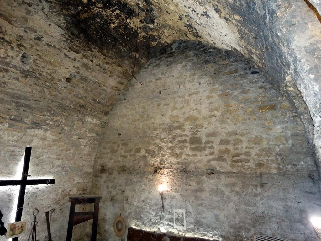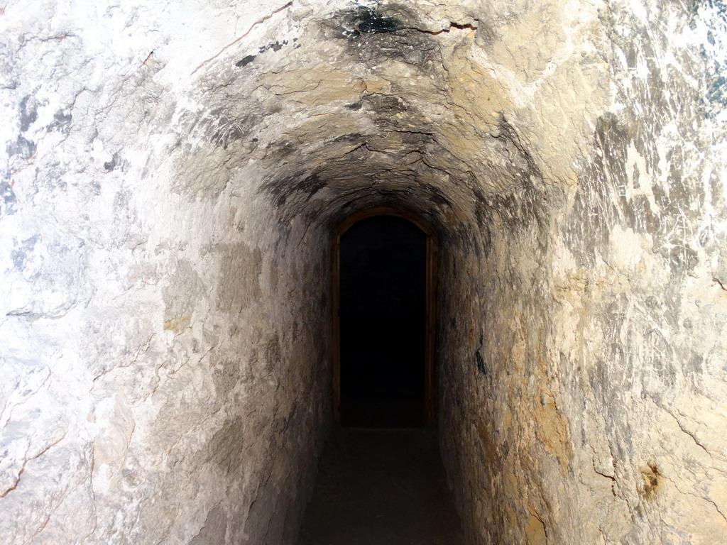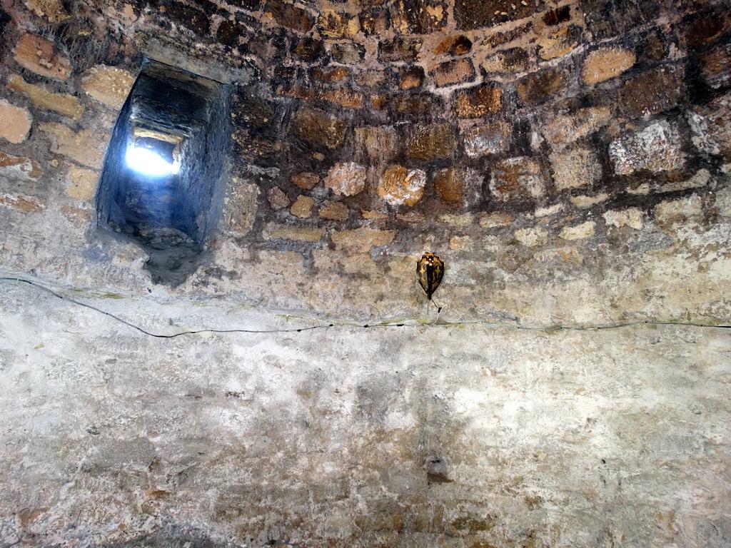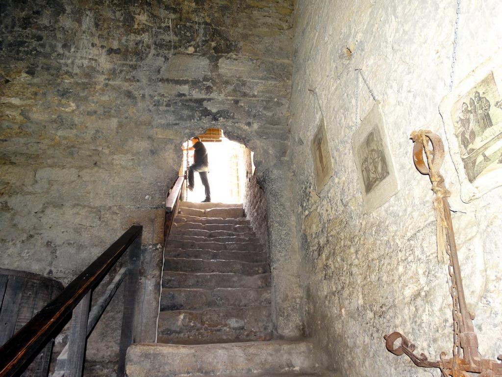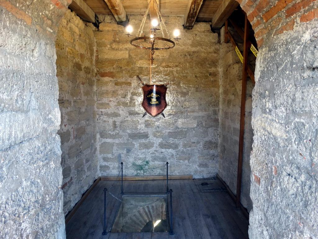 Темница, расположенная в одноименной башне, слева от входа. Как и полагается, в ней темно, как у афроамериканца в известном месте. Крошечные окошки и висящие на стене светильники (светодиодные, кажется) тьму ни разу не рассеивают. Потому со съемкой возникли проблемы, фотик не желал фокусироваться. Попытка снимать видеокамерой в режиме ночной съемки (камера тут работает как прибор ночного видения) тоже не дала результатов из-за отсутствия инфракрасных лучей. В итоге, я осветил помещение фонариком смартфона, после чего удалось сделать снимки со вспышкой. В общем, не позавидуешь сидевшим здесь.