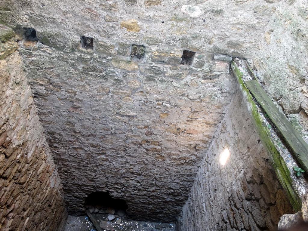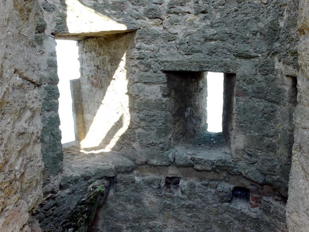 Комендантская башня, некогда жилище коменданта, вид изнутри. Когда-то она имела крышу и деревянные междуэтажные перекрытия.