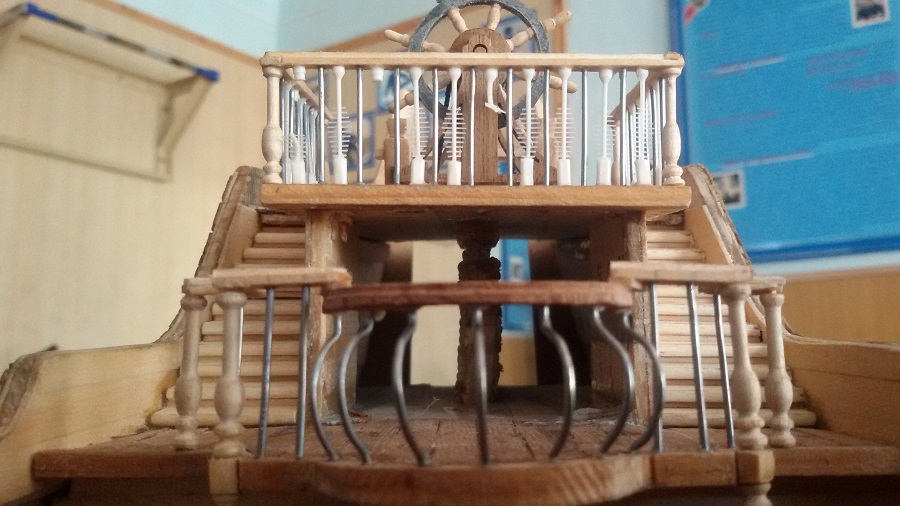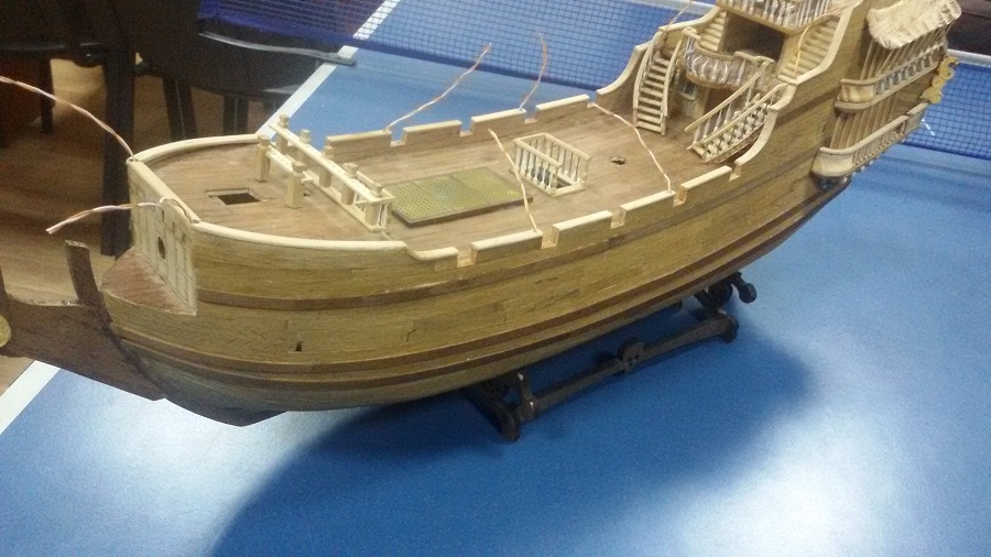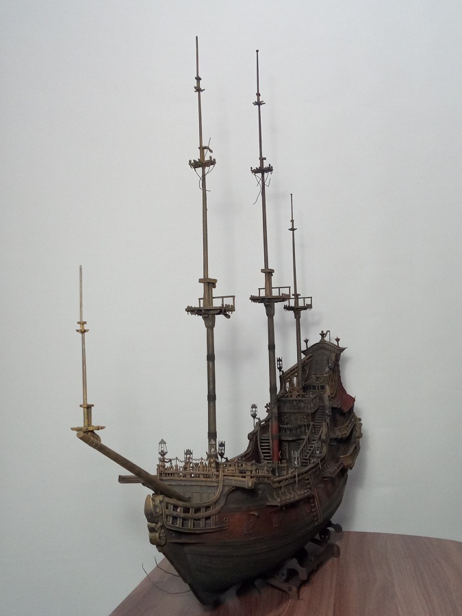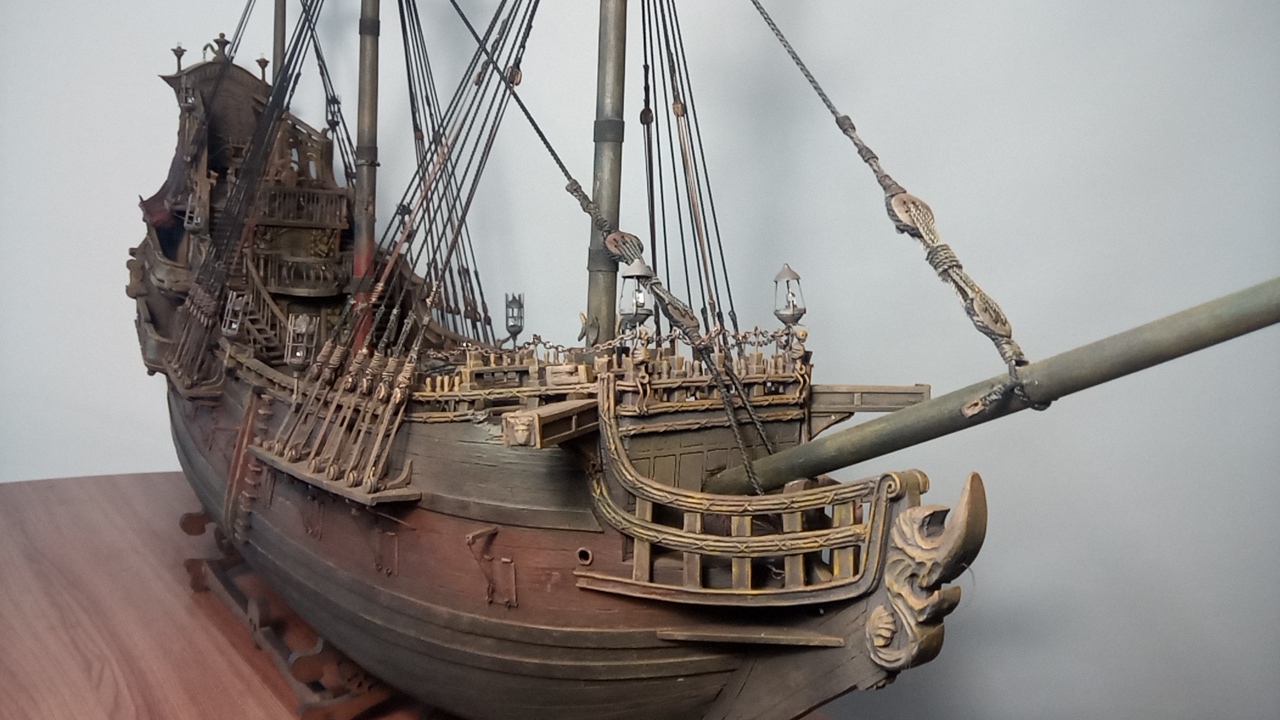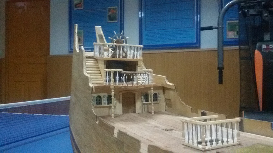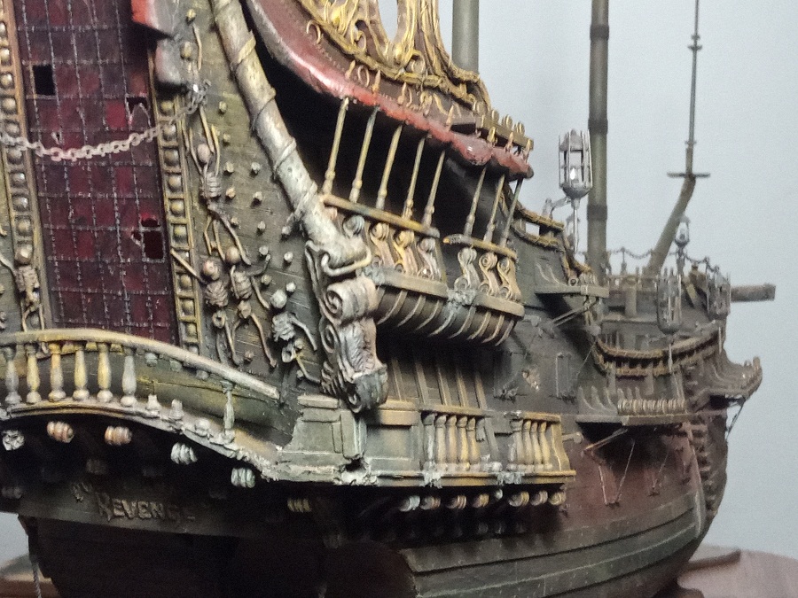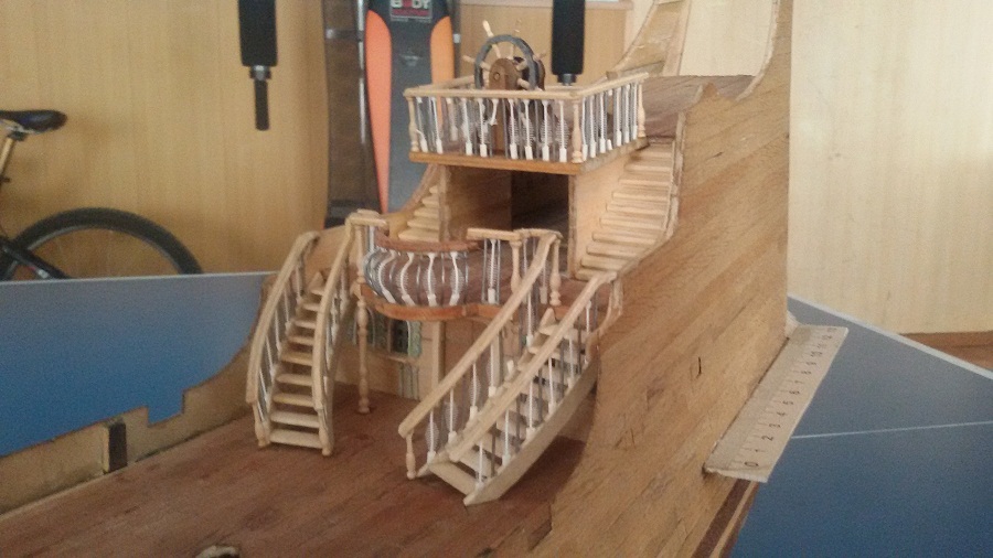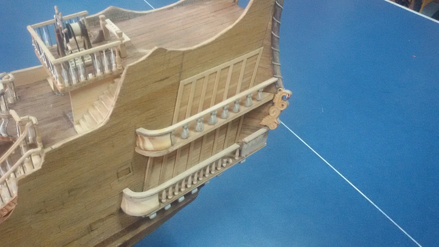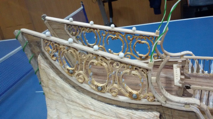 Кницы под нижними галереями размноживал при помощи пластилина (форма для оттиска) и мэджик-скульпта (основной материал). Так же с балясинами верхней галереи. Резные элементы по бокам кормы делал из самшита