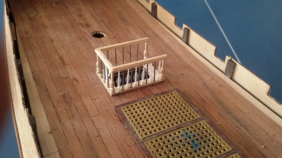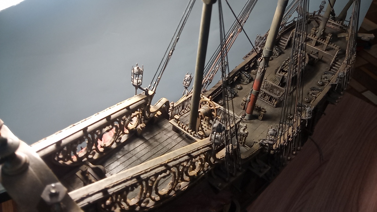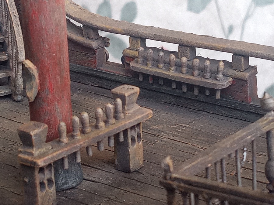 Добавил красного на фальшборты изнутри и на боковые стенки верхнего юта. Установил рангоут