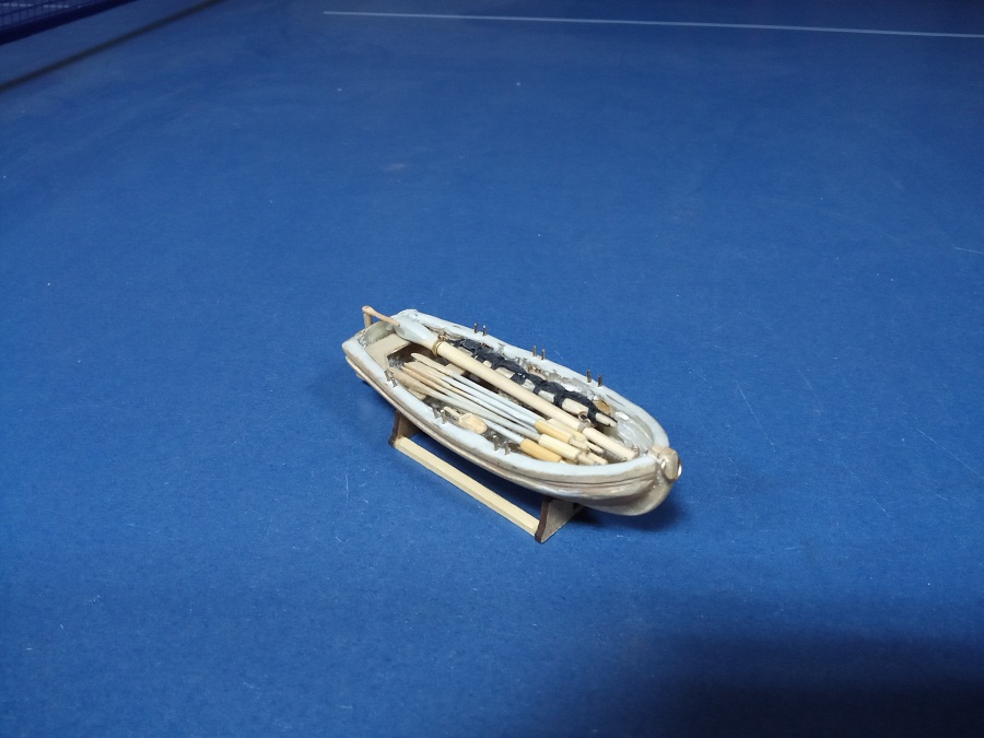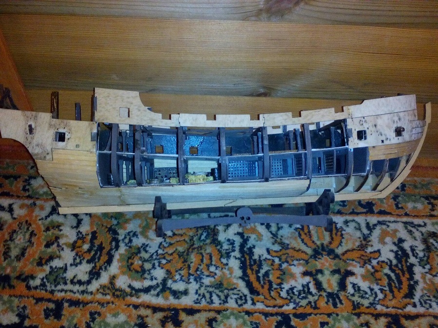 Изготовил блоки ( в основном из бамбуковых палочек для еды), покрасил орудия верхней палубы