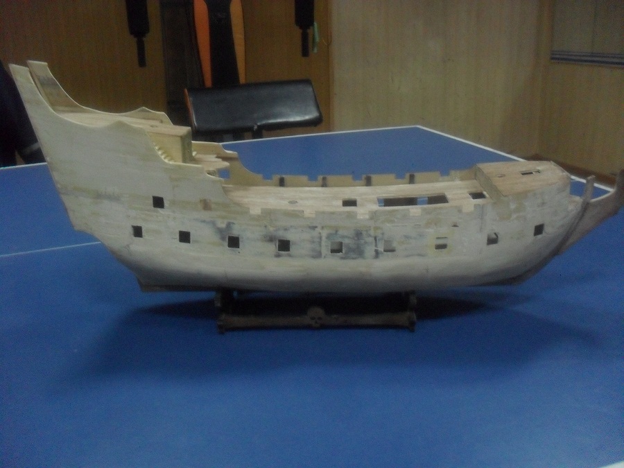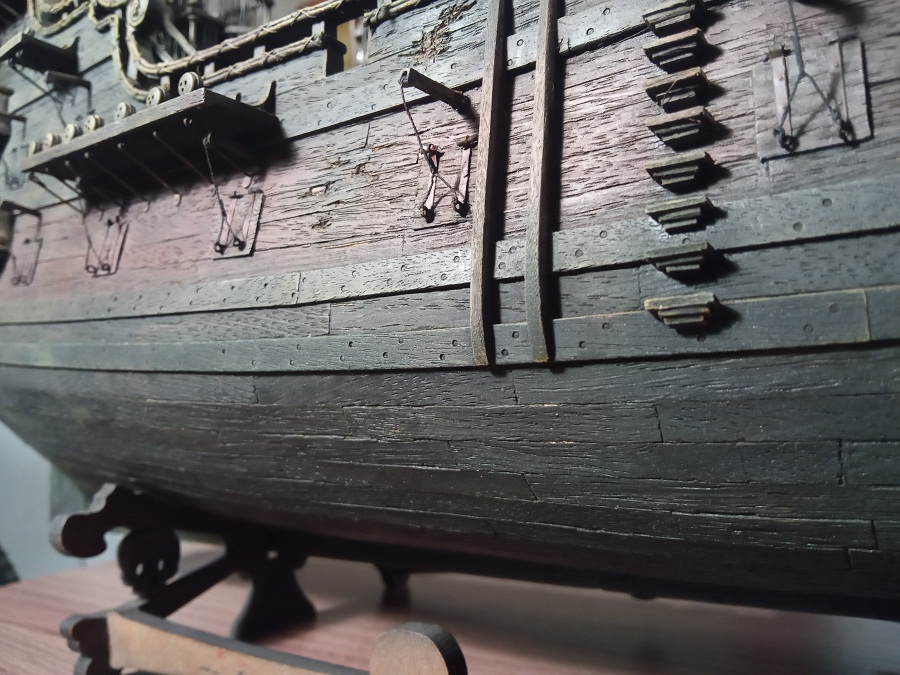 Вырезал скелет из самшита, украсил планширь декором по периметру, поставил крышки пушечных портов, руслени с юферсами. Череп у скелета "человеческий", это я накосячил поначалу. Потом переделывал.